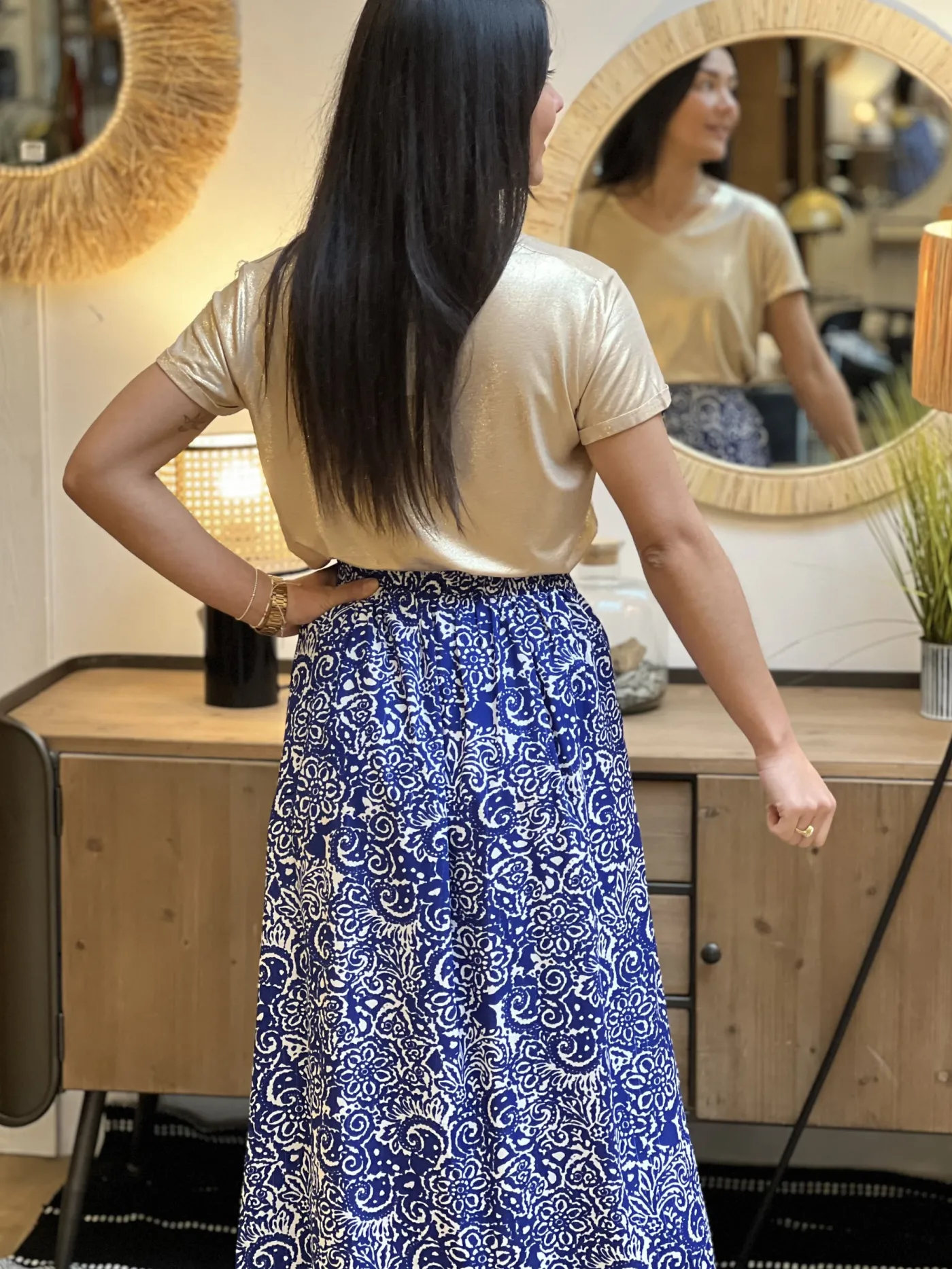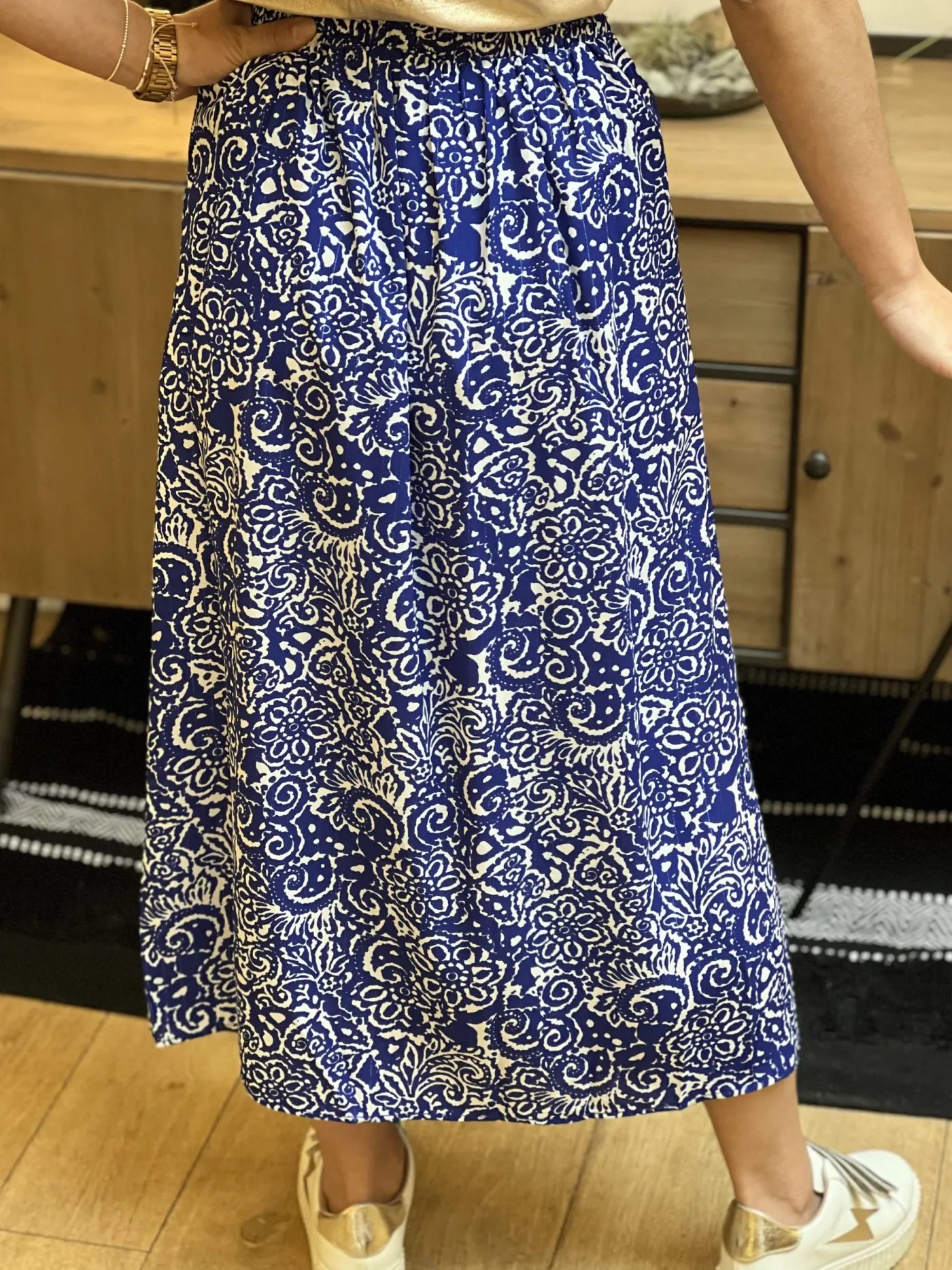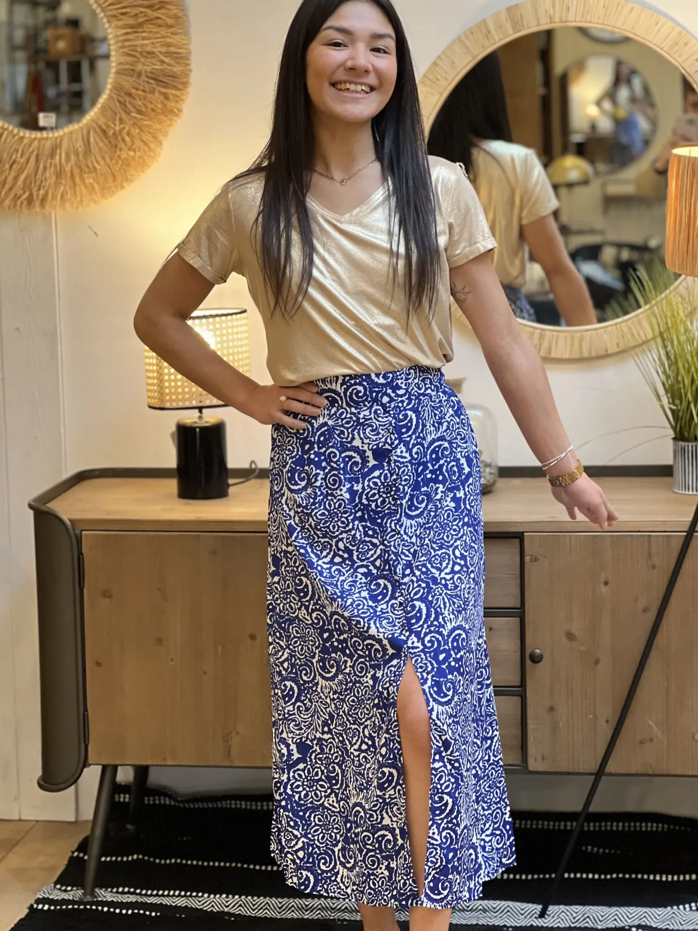 JUPE mi-longue imprimé aztèque blancTaille : Mathilde mesure 1m65. Elle porte la taille S/M pour ce modèle. Taille…