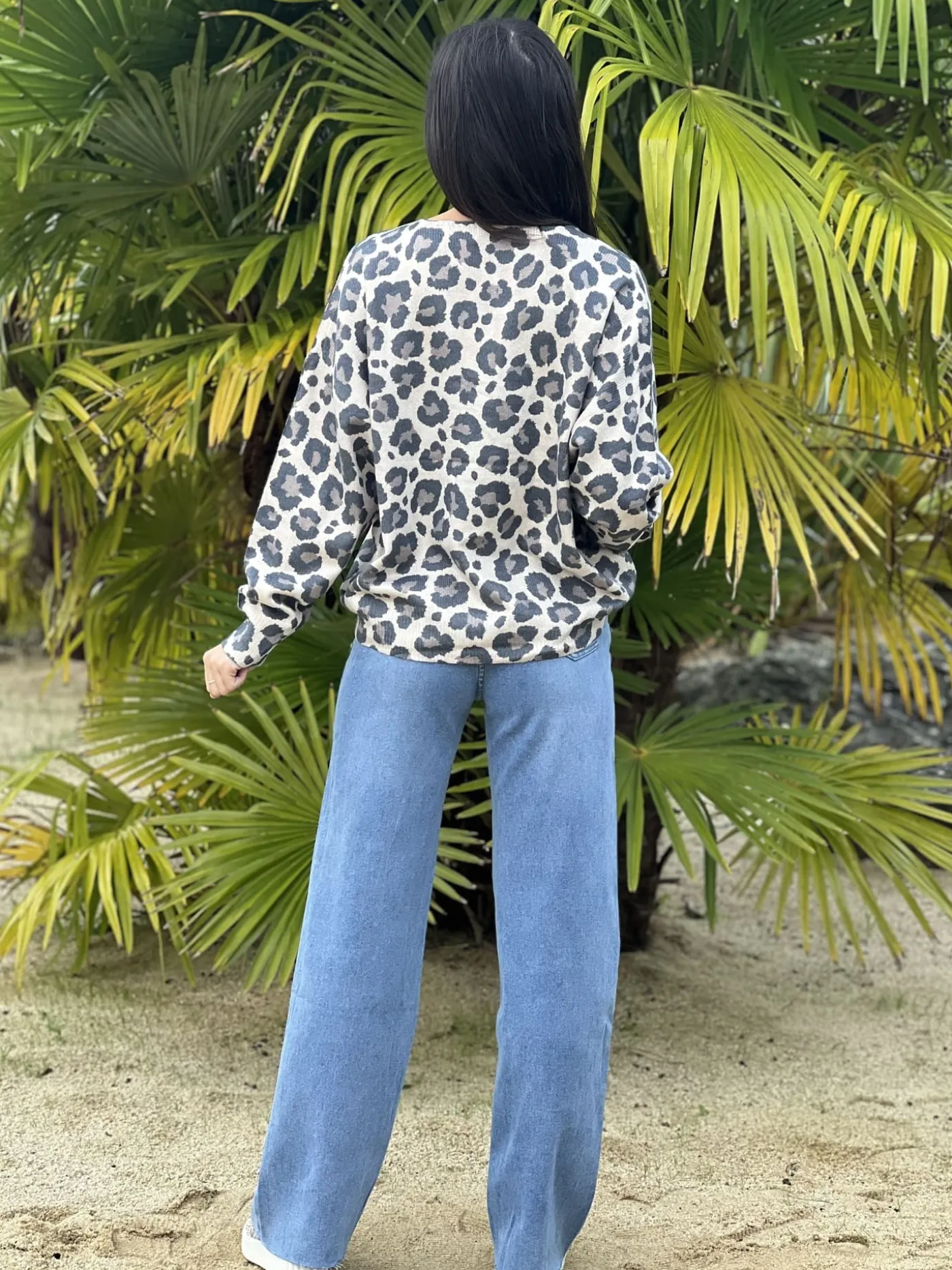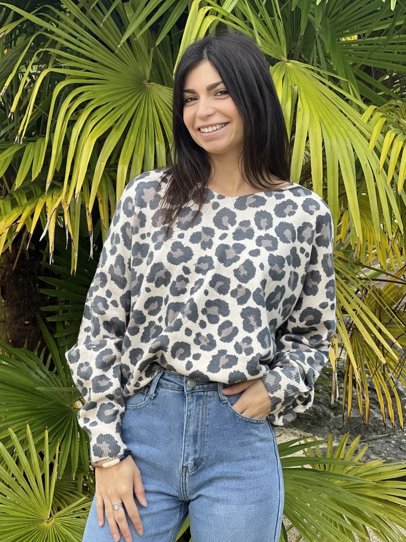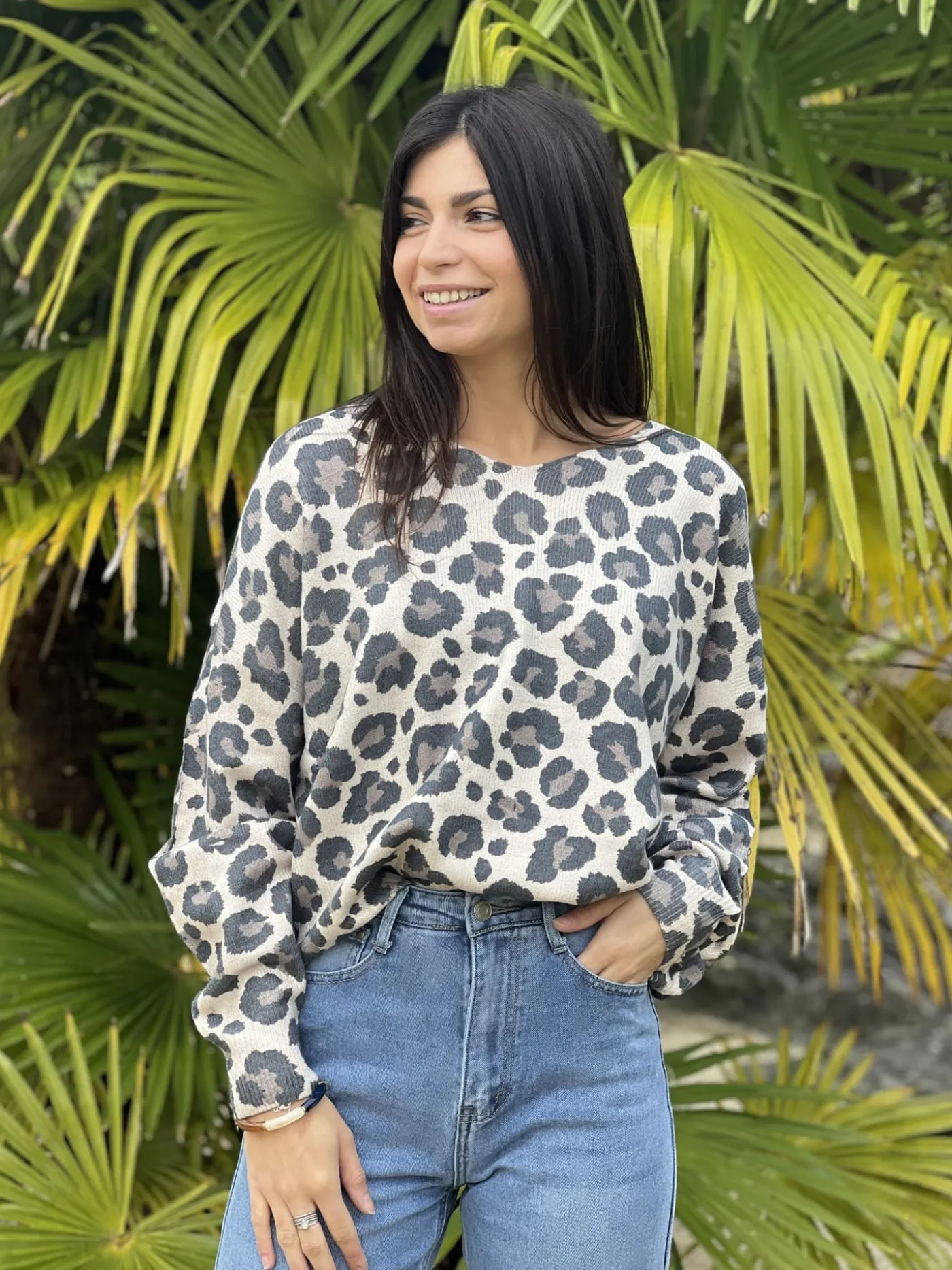PULL A ML – COL V – MOTIF LEOPARD FOND CLAIRTaille : Justine mesure 1m69. Elle porte la taille Taille unique pour ce…