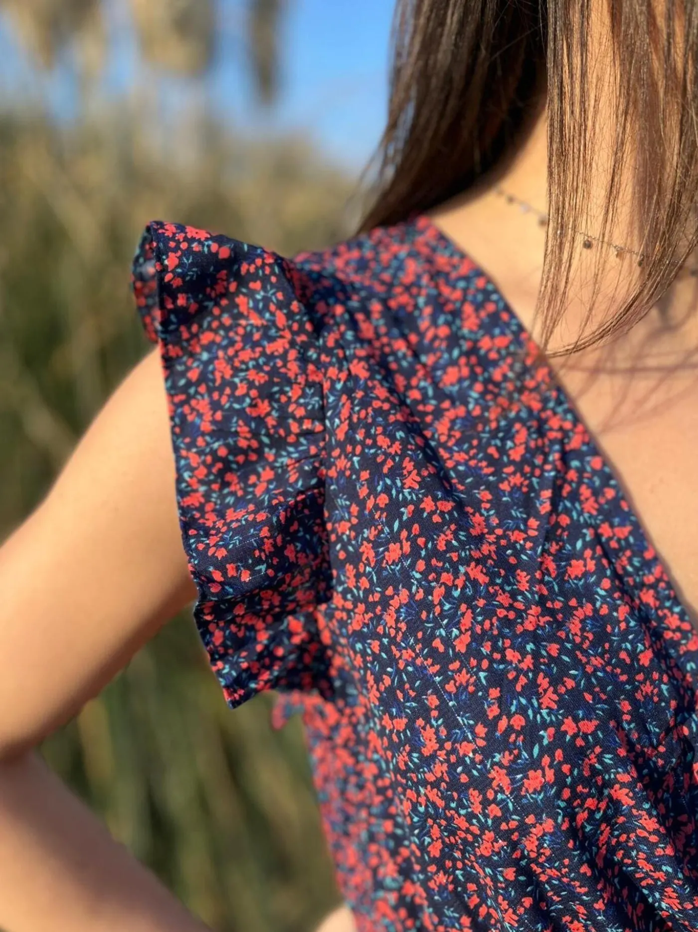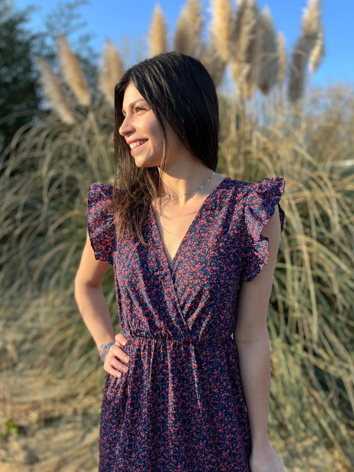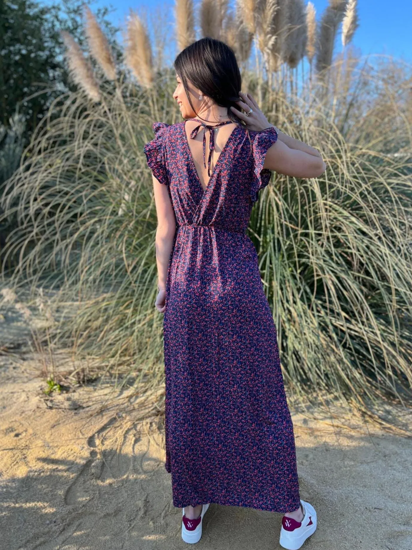 Robe longue froufrouCol cache cœurImprimé petites fleurs framboisesTaille : Justine mesure 1m69. Elle porte la tail…