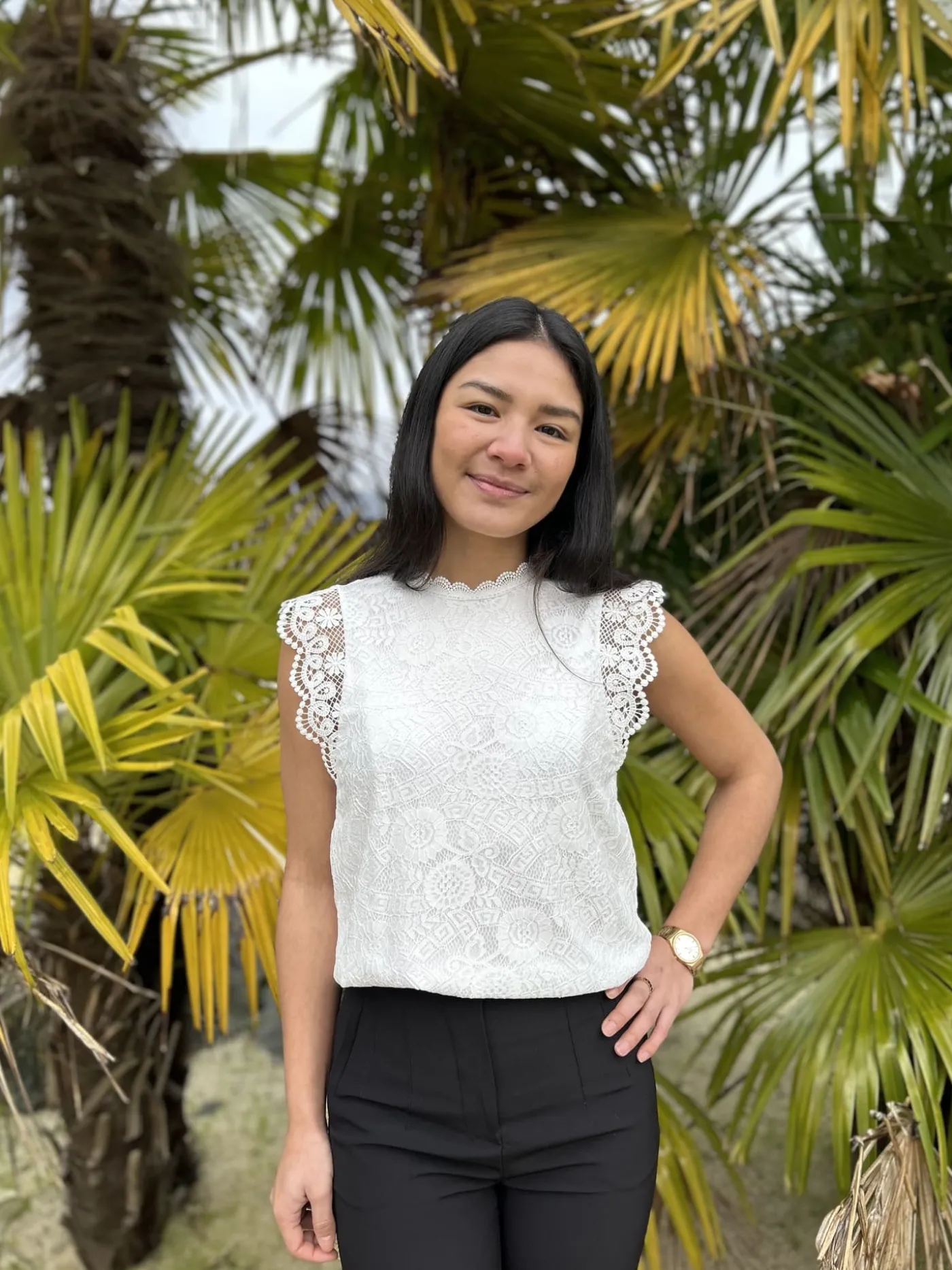 TOP SANS MANCHES – COL HAUT À DENTELLETaille : Juliette mesure 1m64. Elle porte la taille S pour ce modèle. Tai…