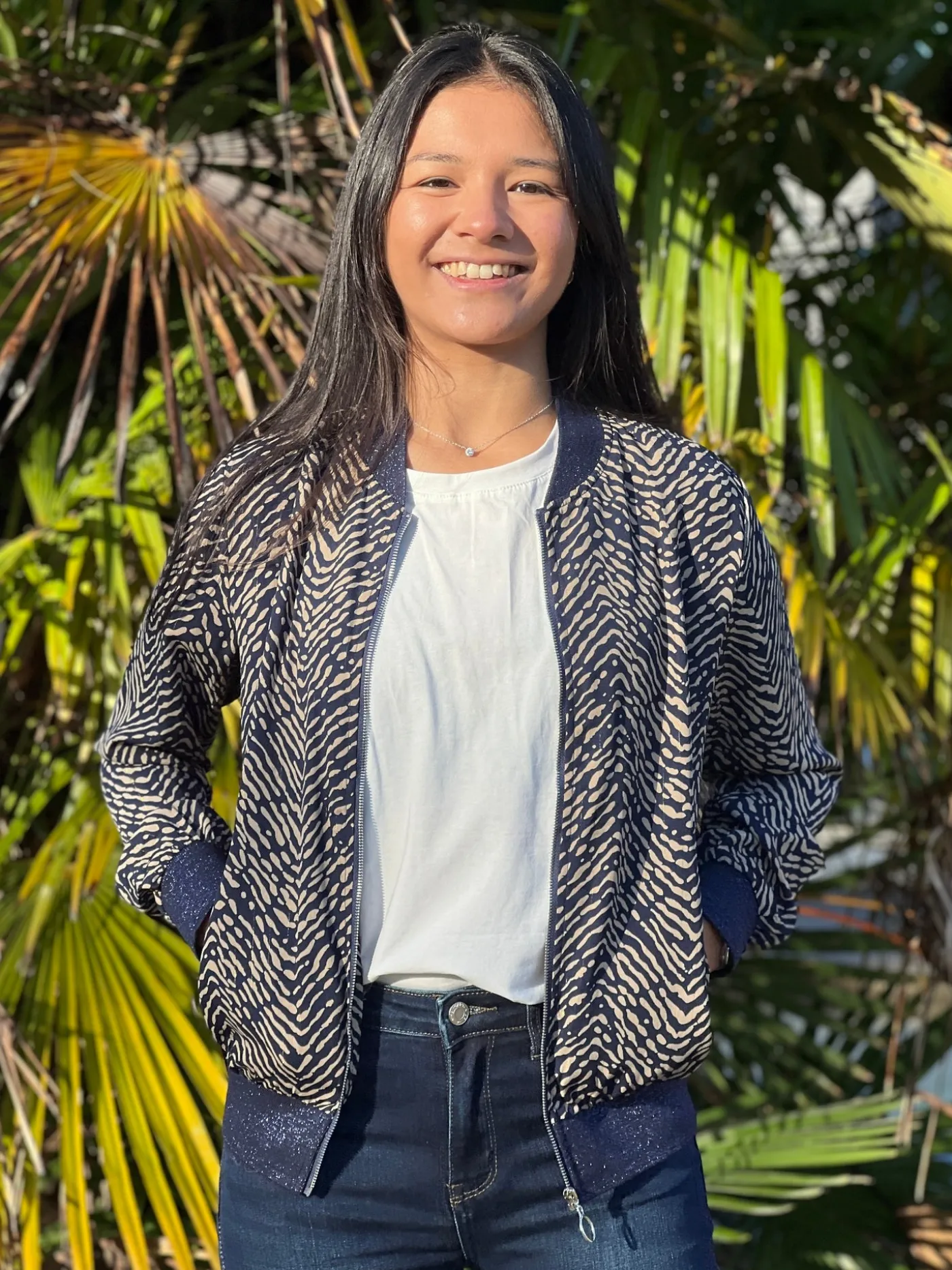 BOMBER MOTIF ANIMALIER BLEU ET ECRUTaille : Mathilde mesure 1m65. Elle porte la taille S/M pour ce modèle.Taille : S/…