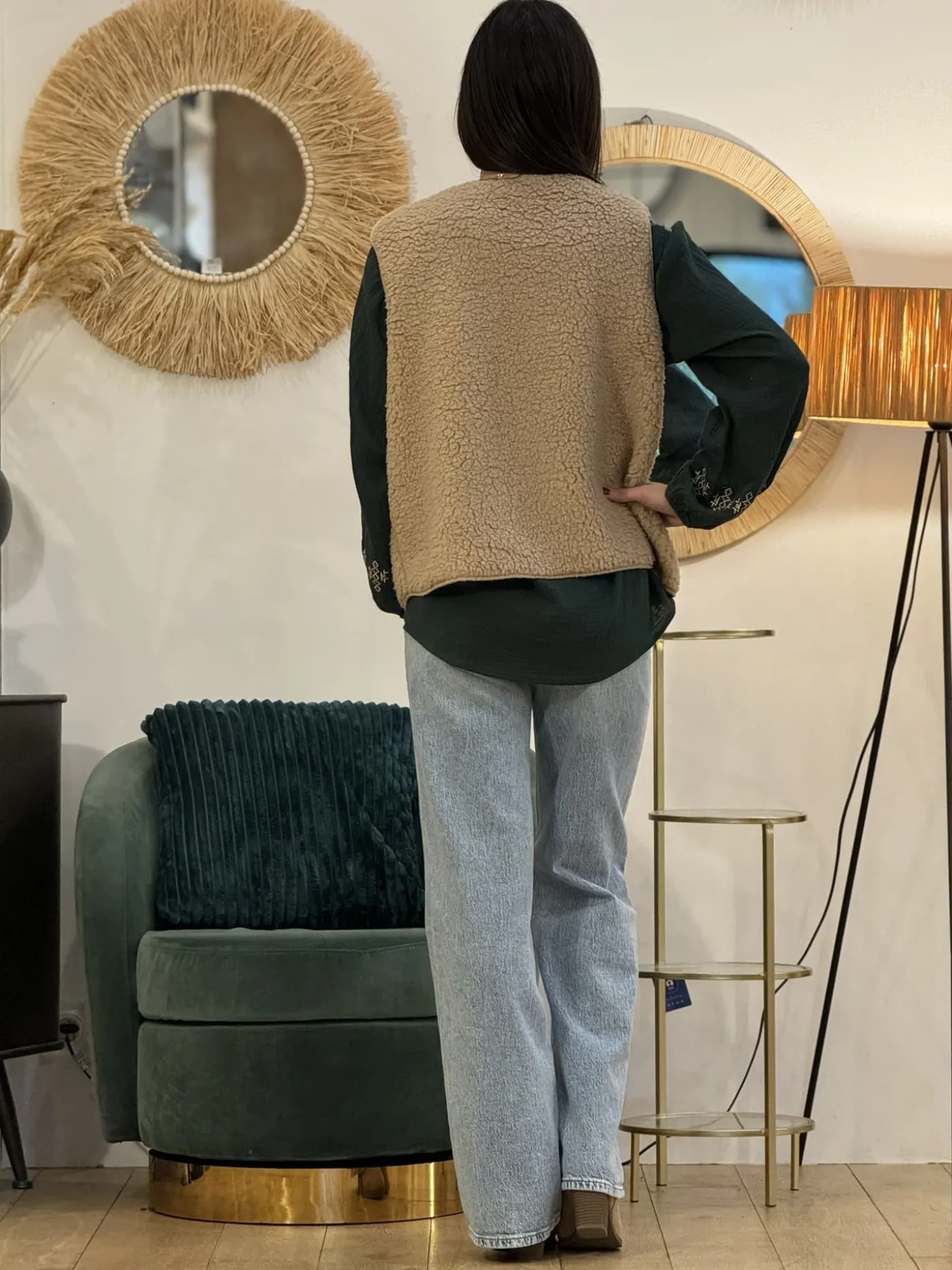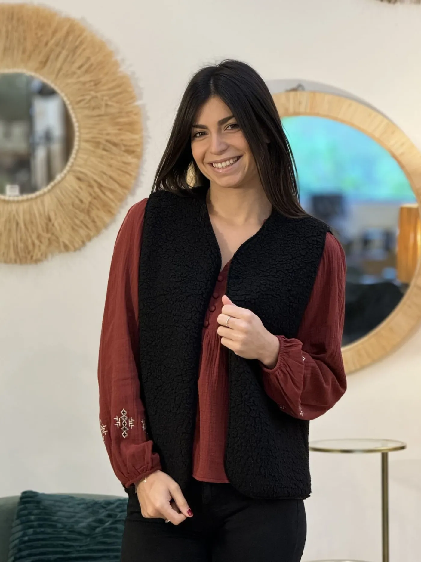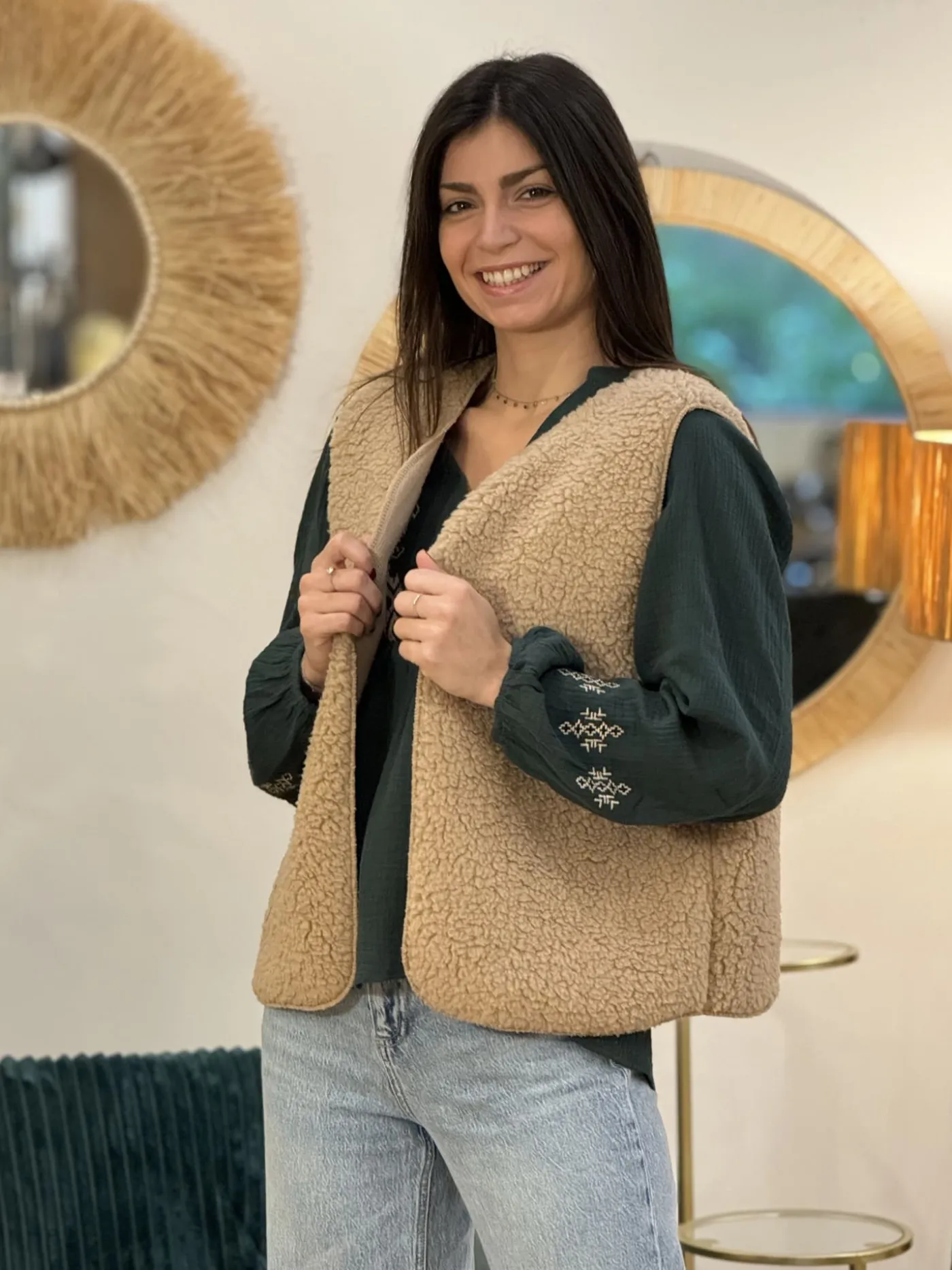 GILET SANS MANCHE effet moutonTaille : Justine mesure 1m69. Elles portent la taille Taille unique pour ce modèle. Tai…