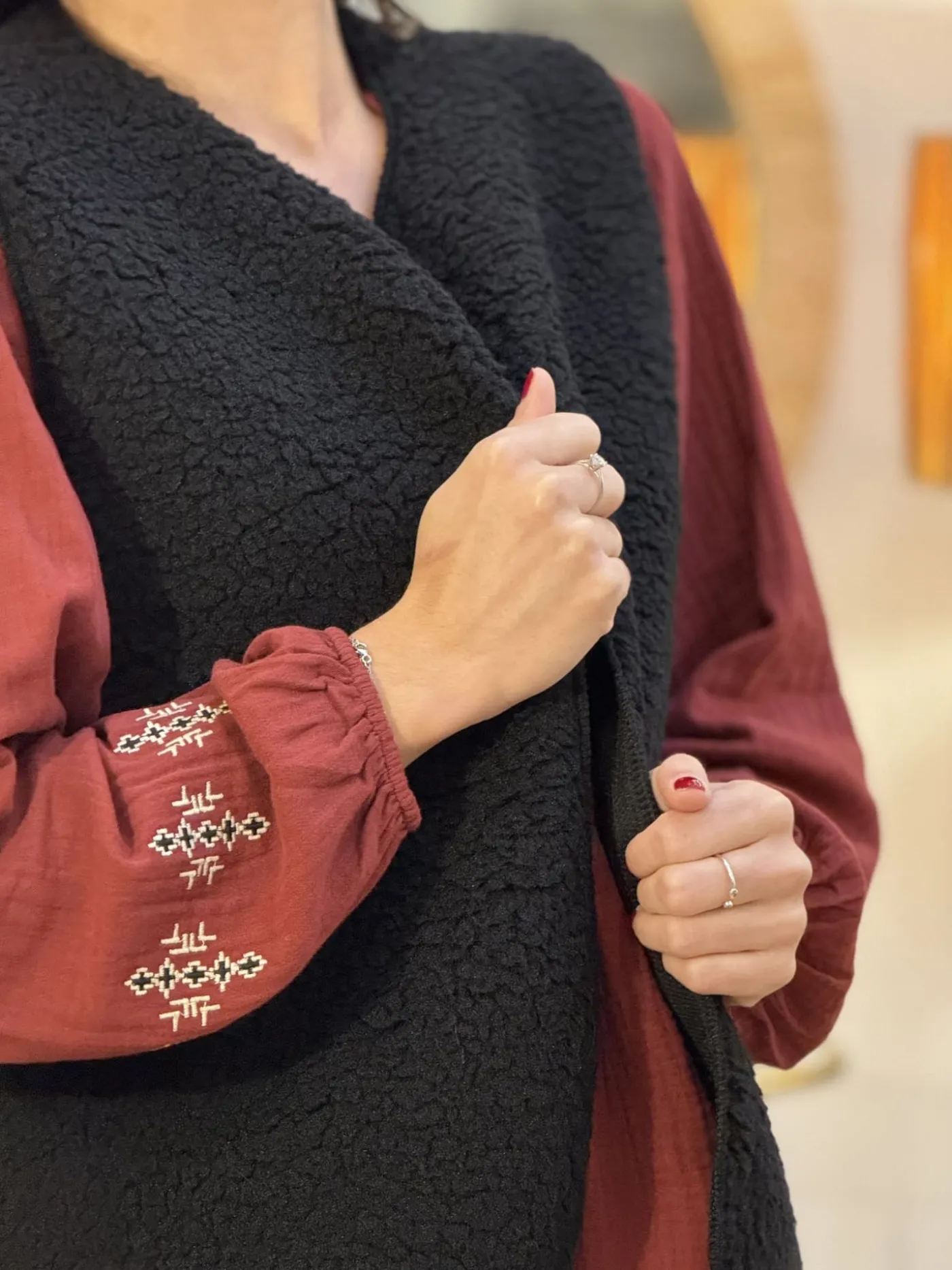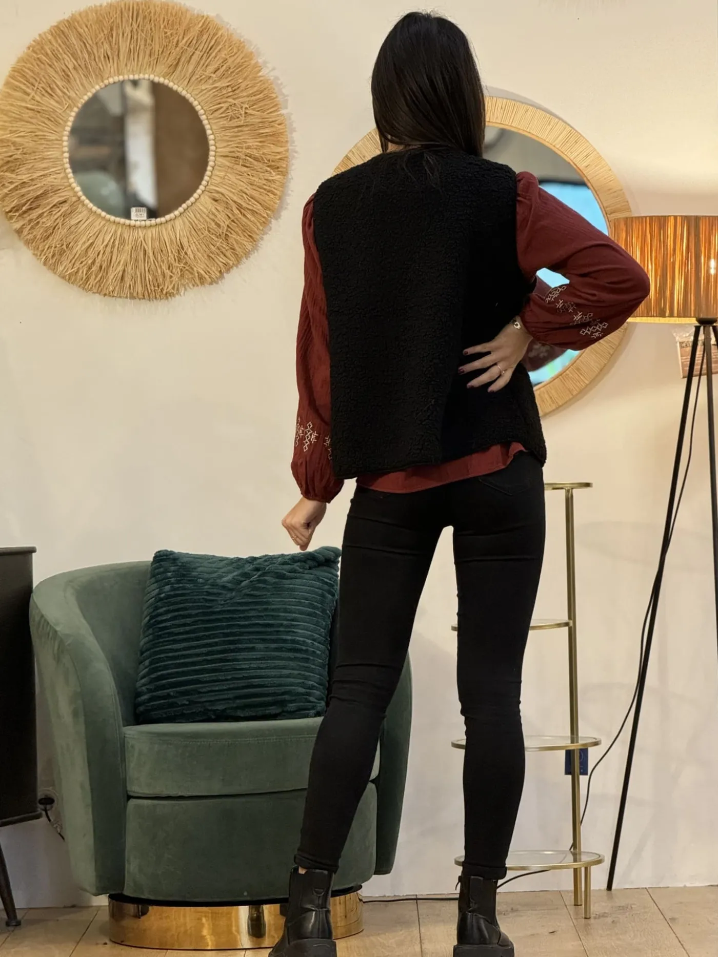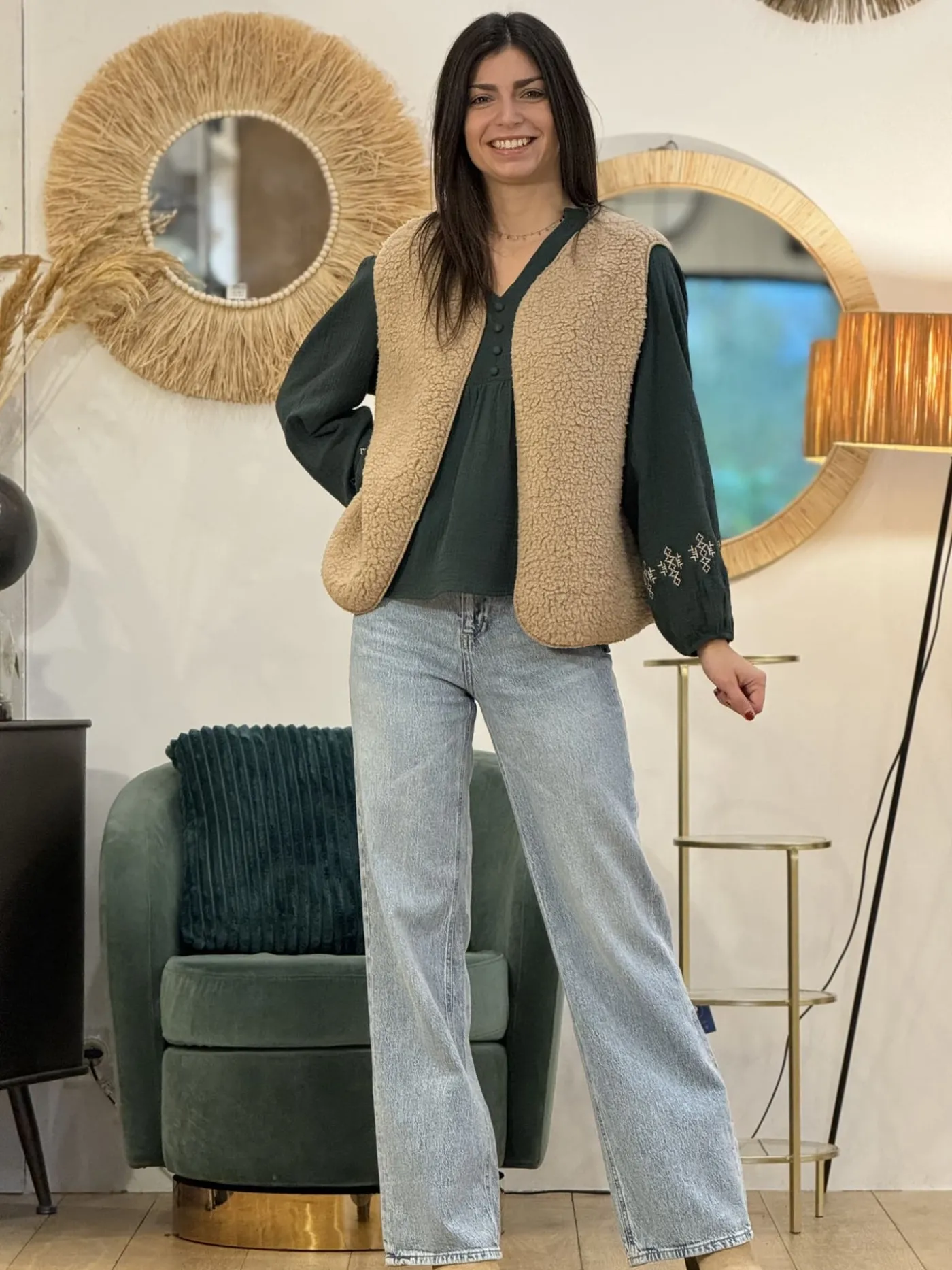 GILET SANS MANCHE effet moutonTaille : Justine mesure 1m69. Elles portent la taille Taille unique pour ce modèle. Tai…