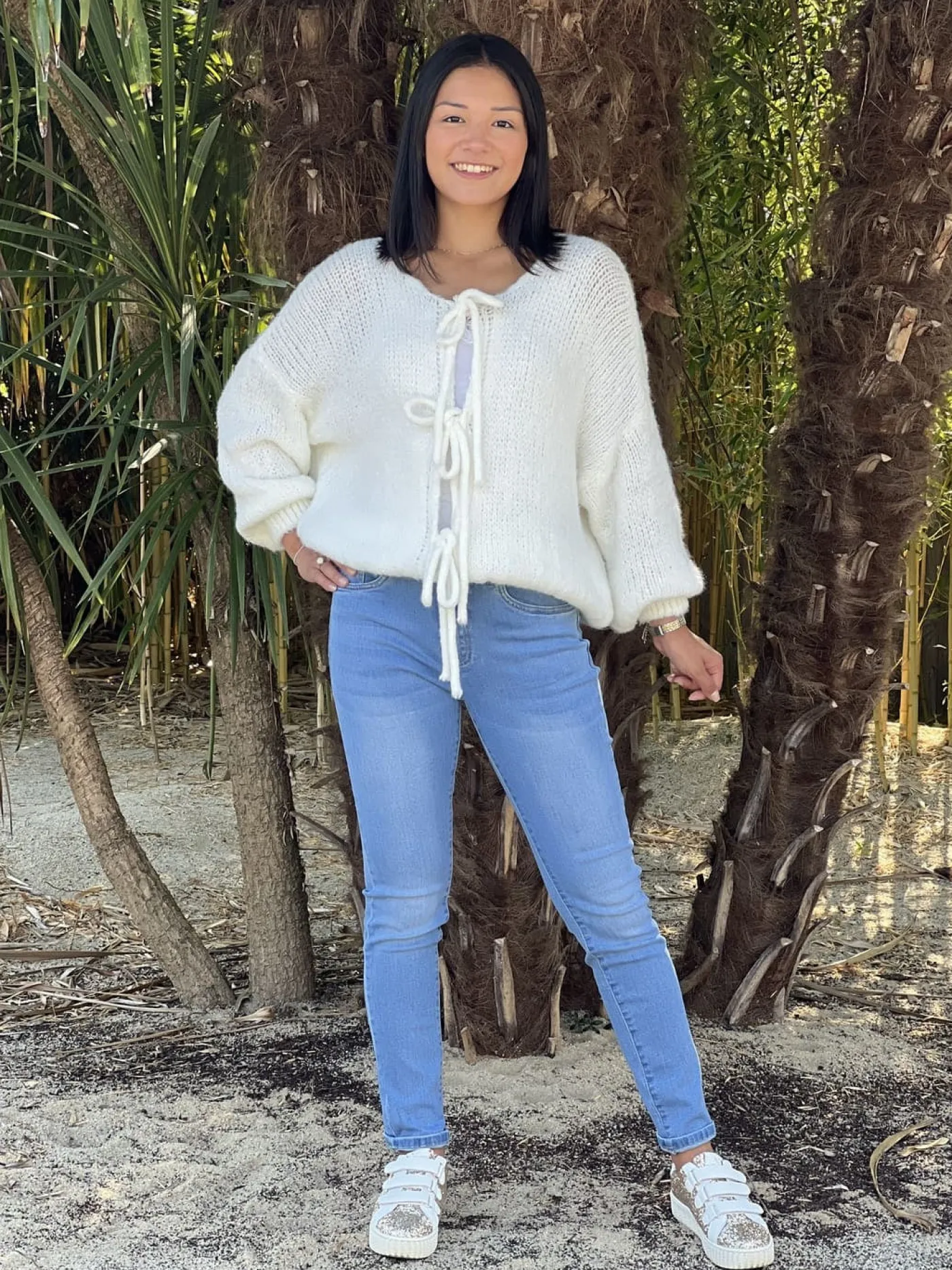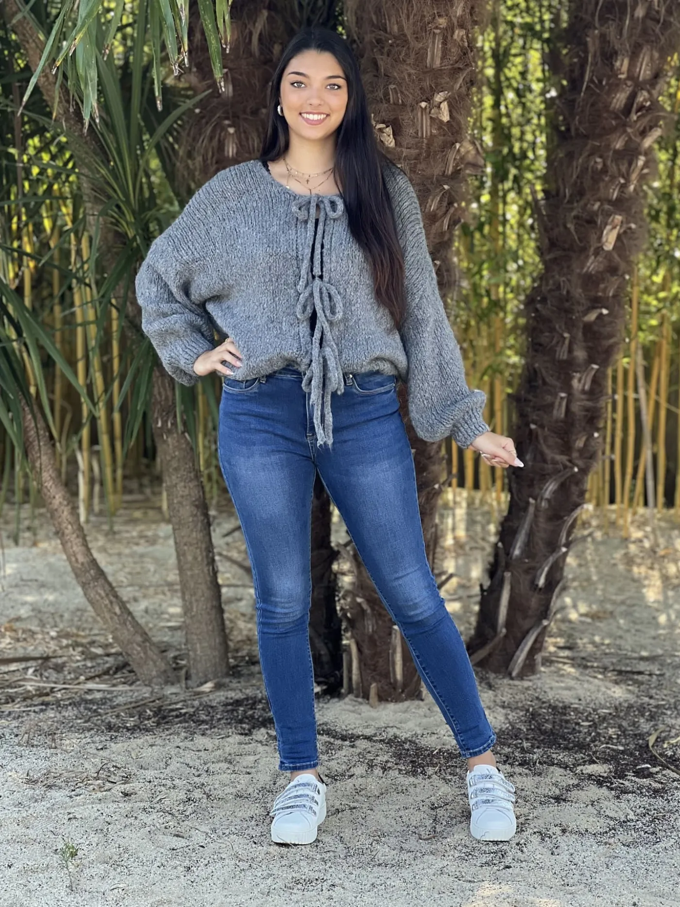 GILET À ML AVEC NŒUDS DEVANTTaille : Maëlys mesure 1m64 et Mathilde mesure 1m65.Alice mesure 1m60. Elles portent la…