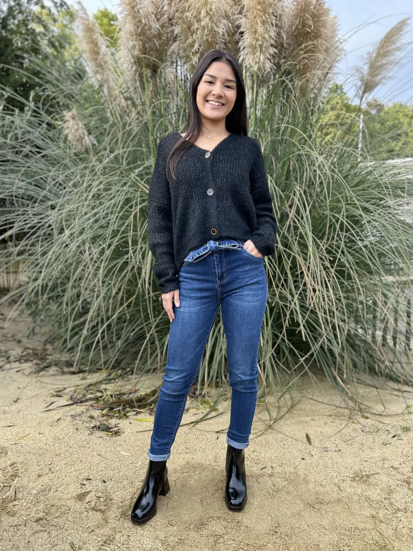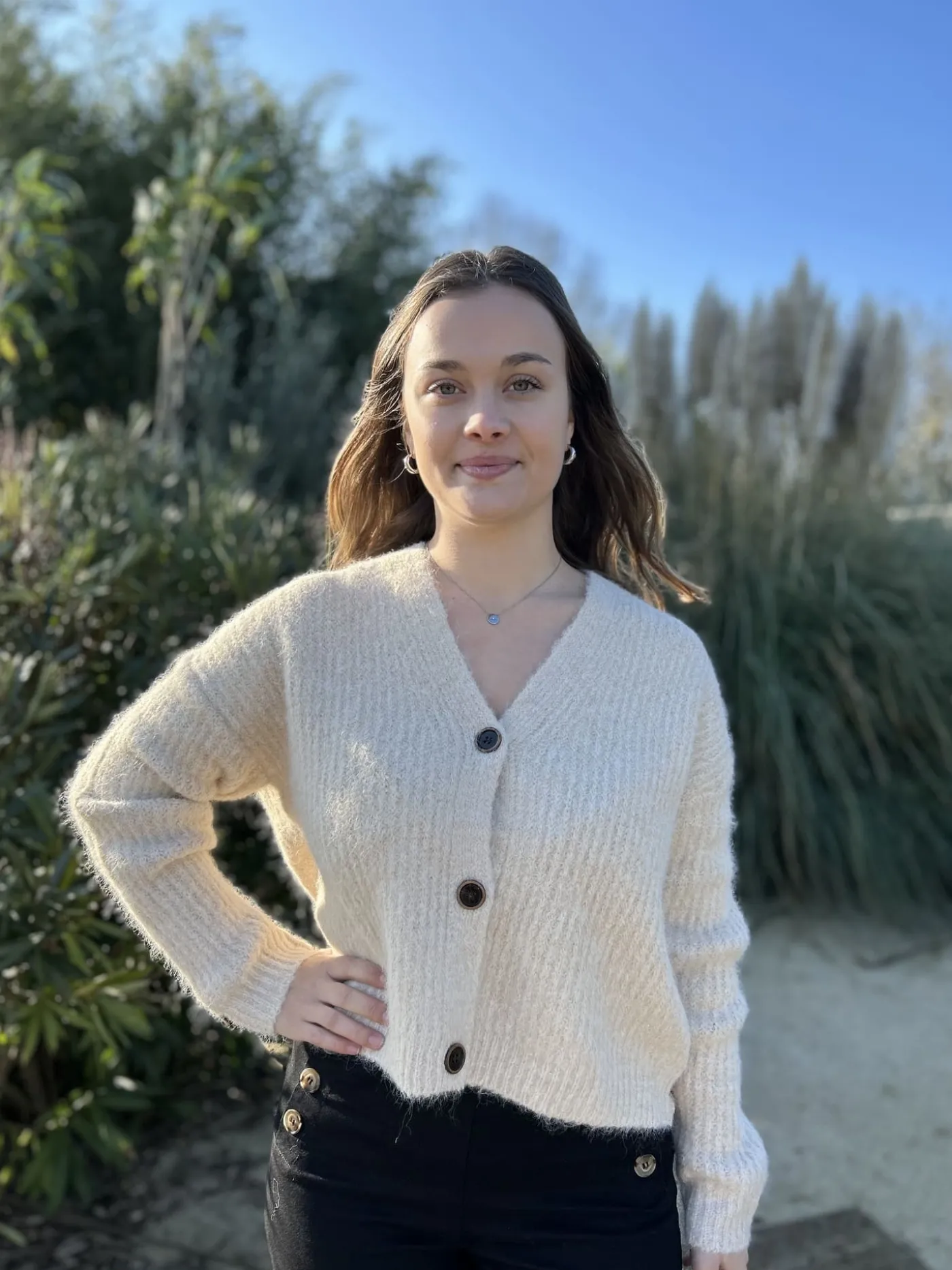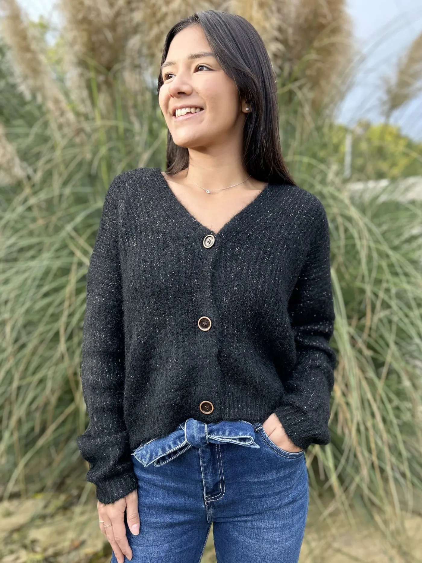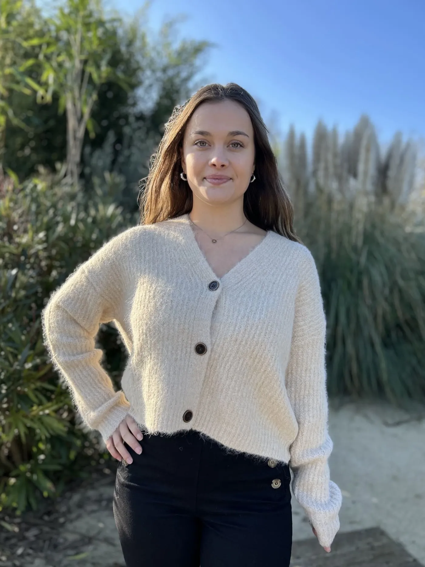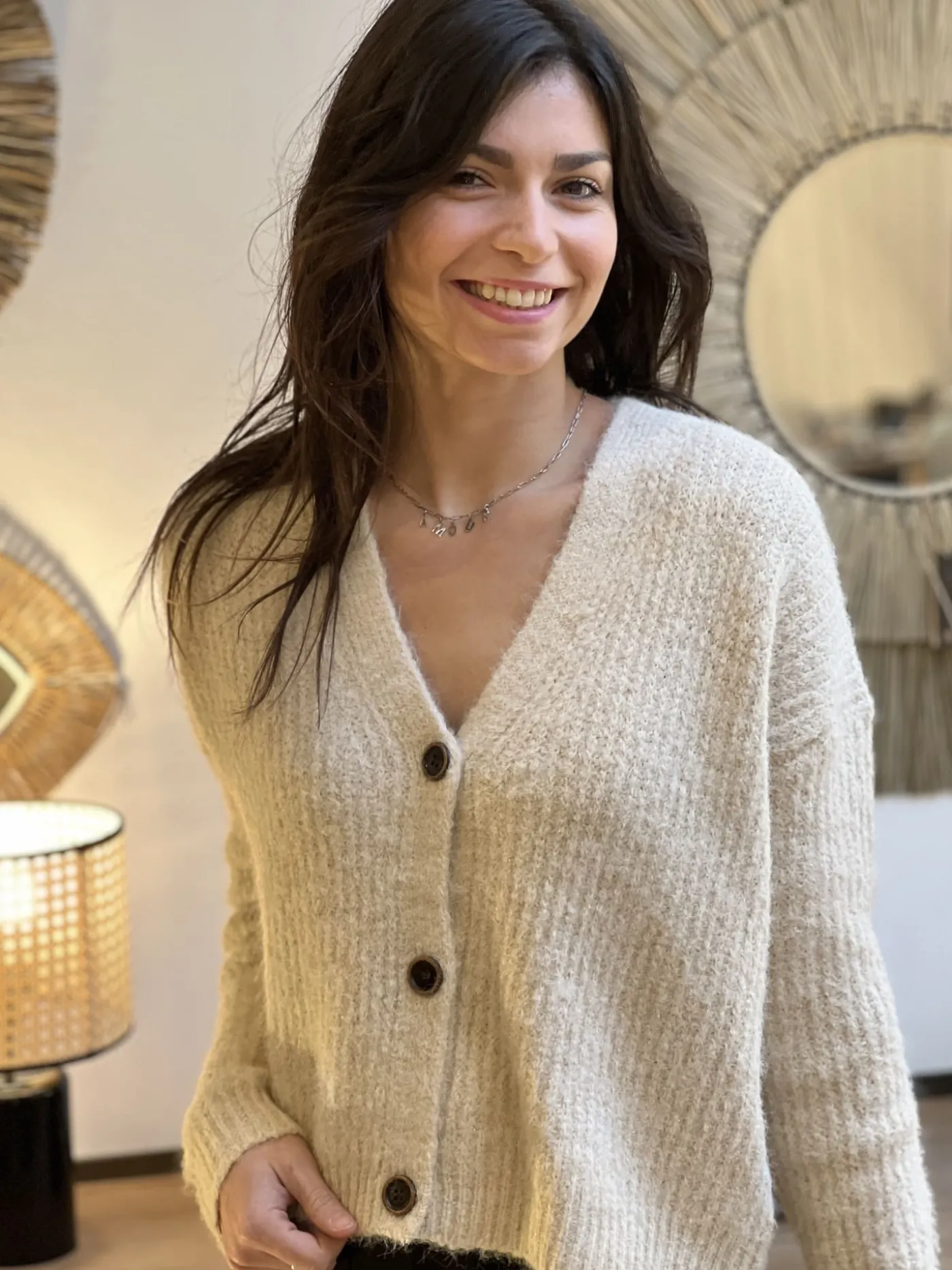 GILET à ml col v avec boutonsTaille : Mathilde mesure 1m65, Justine mesure 1m69 et Juliette mesure 1m63. Elles porten…