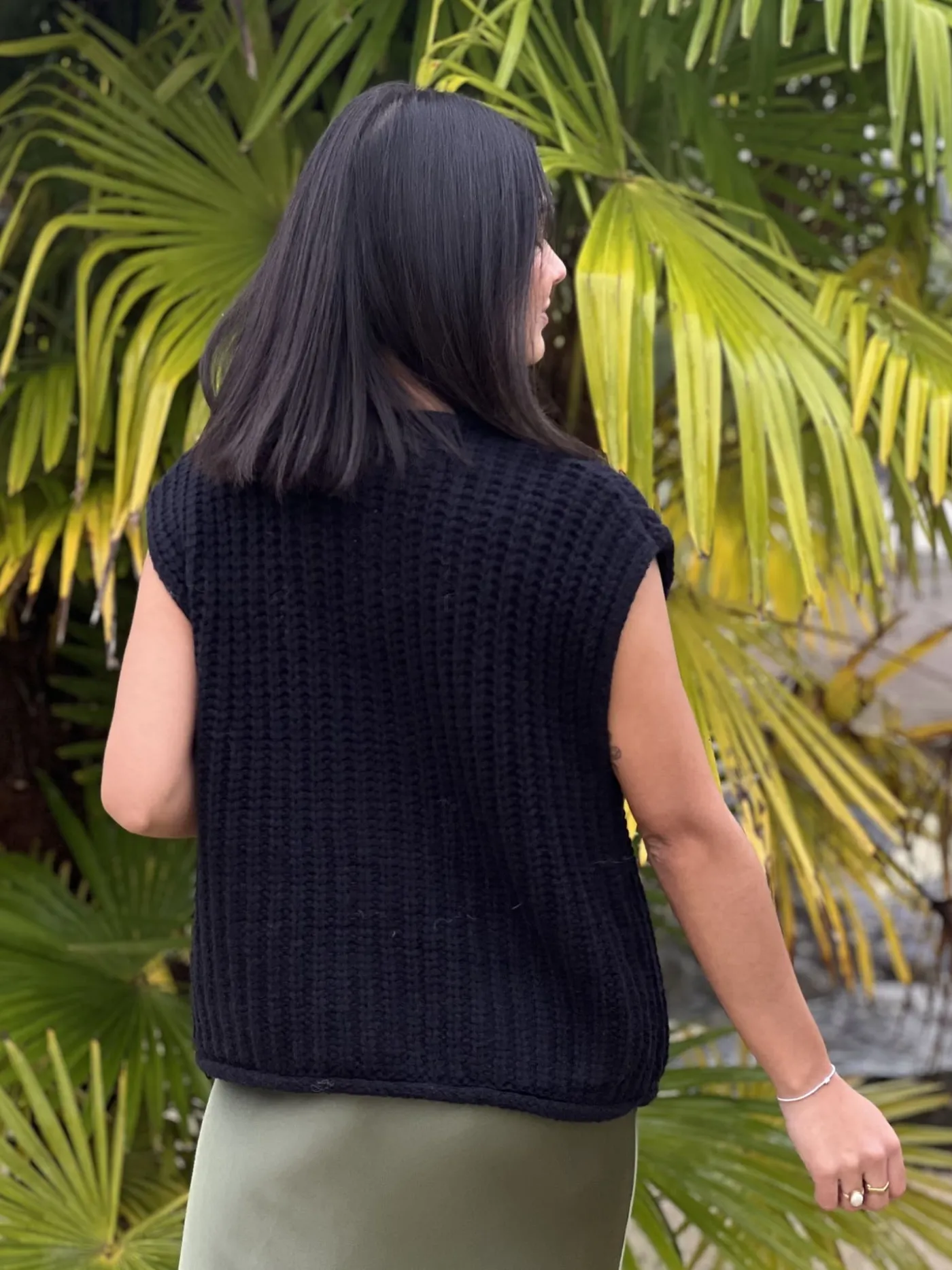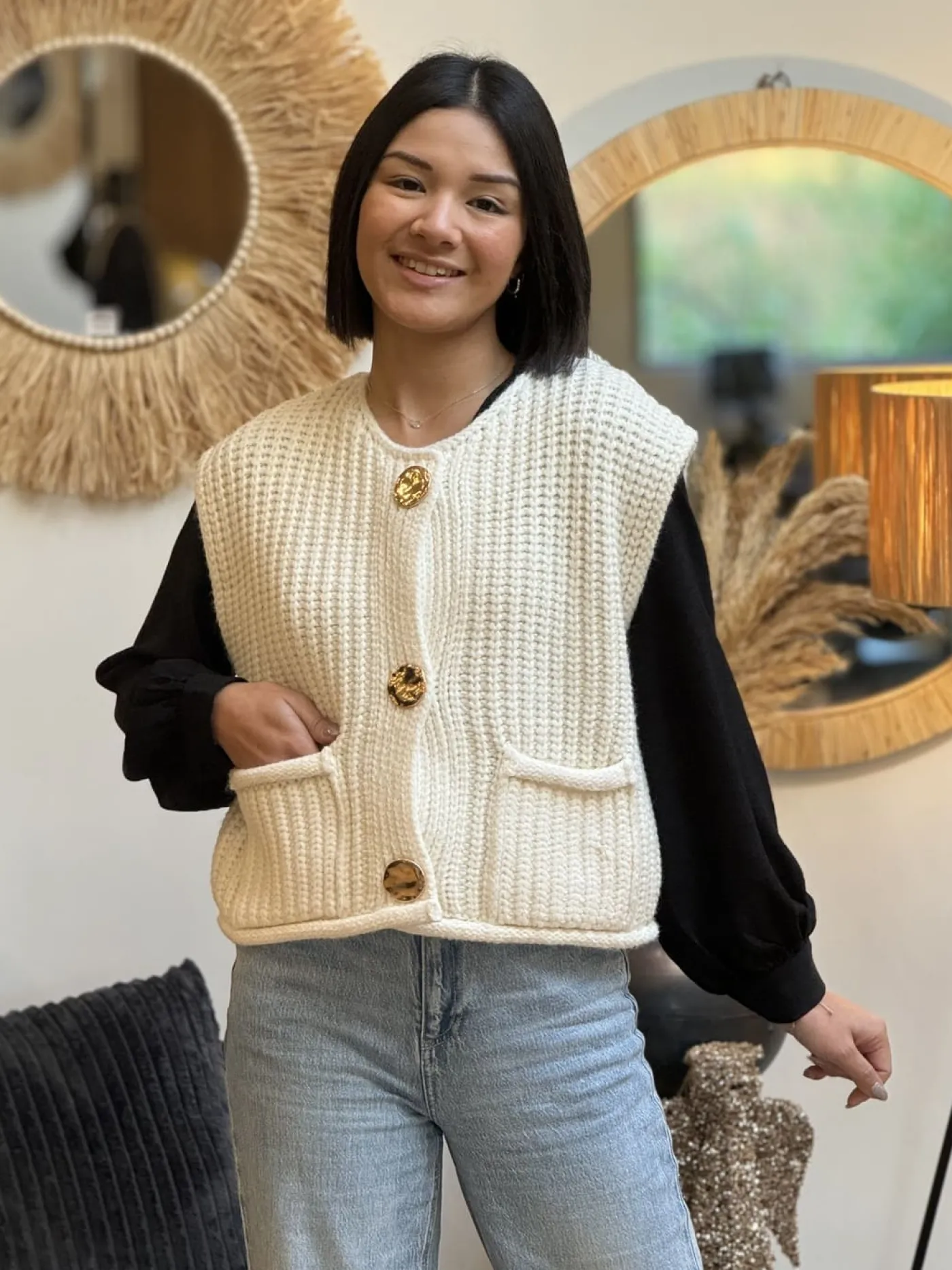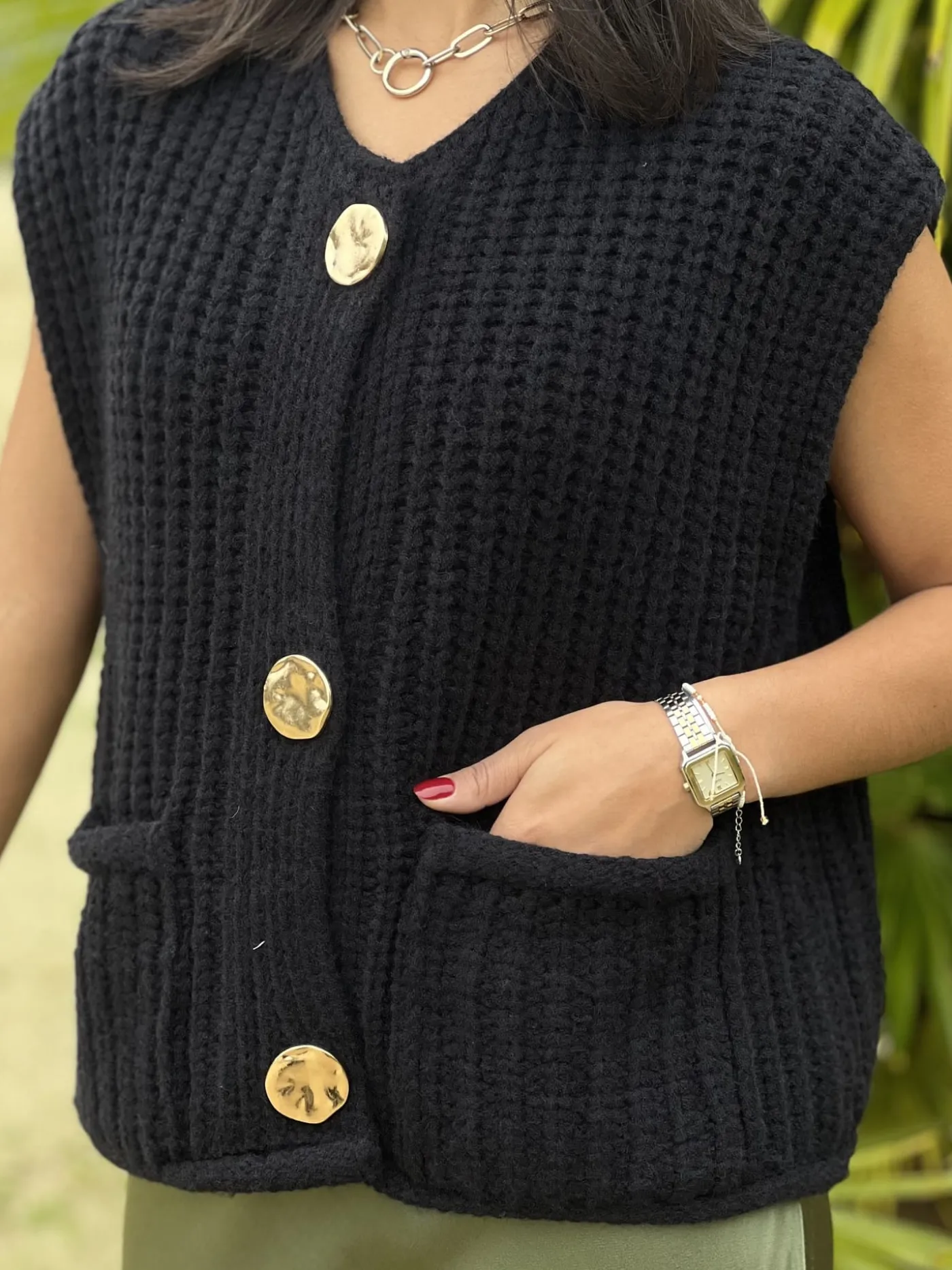 - Gilet sans manche 3 gros boutons + 2 poches devant mailles torsadées