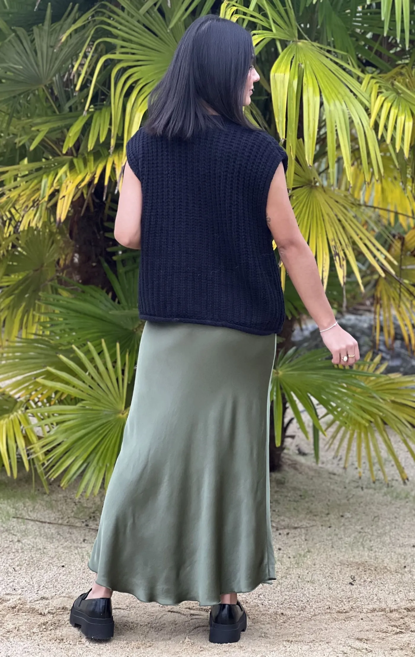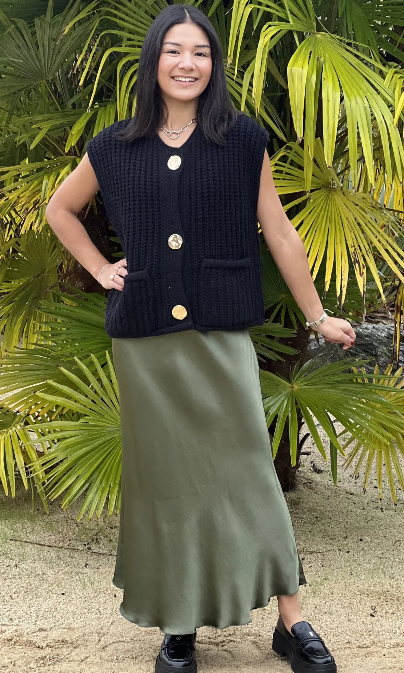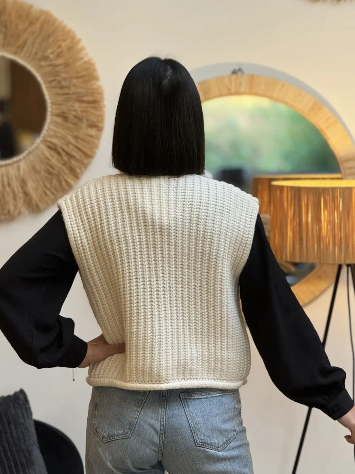 - Gilet sans manche 3 gros boutons + 2 poches devant mailles torsadées