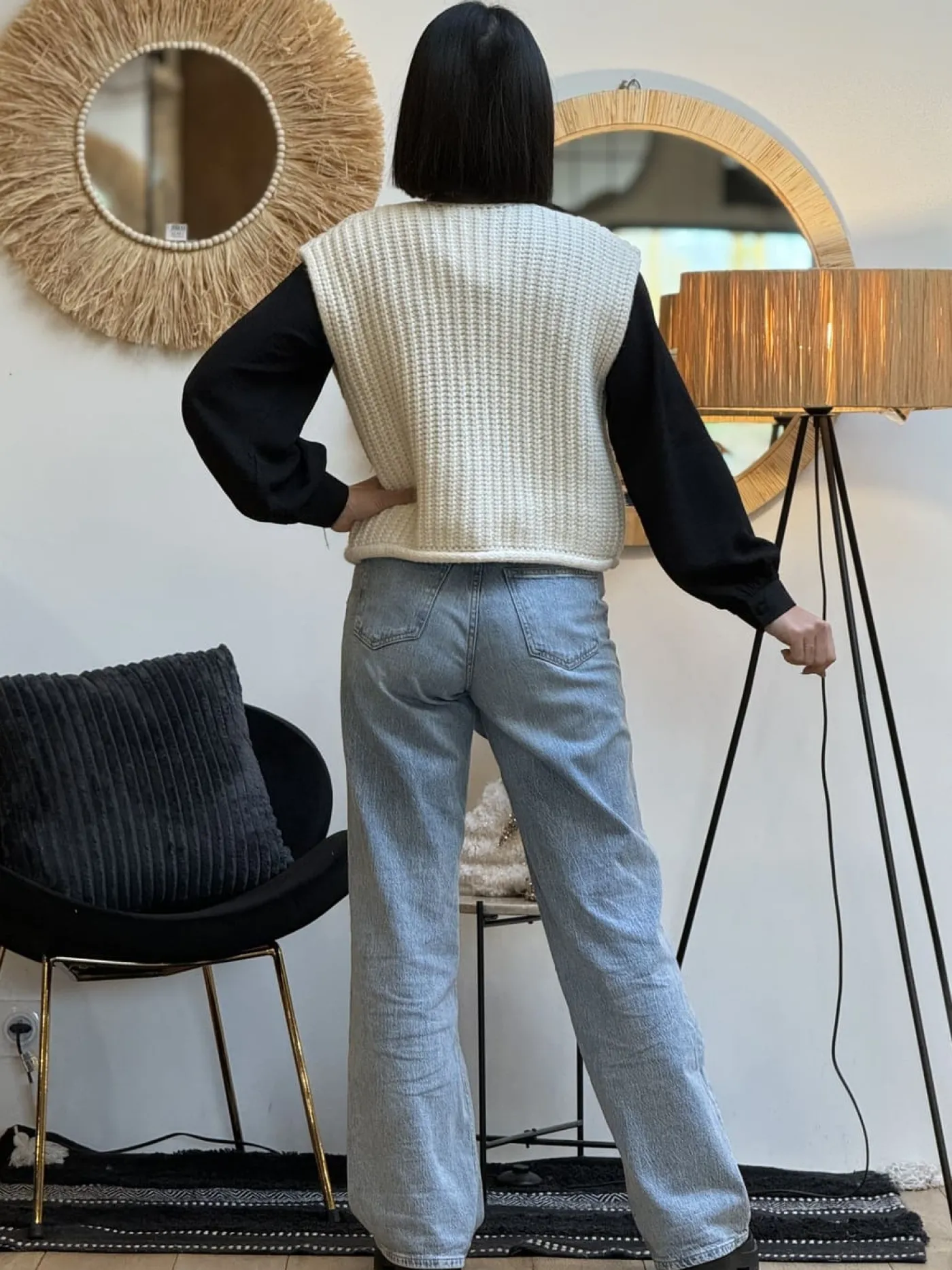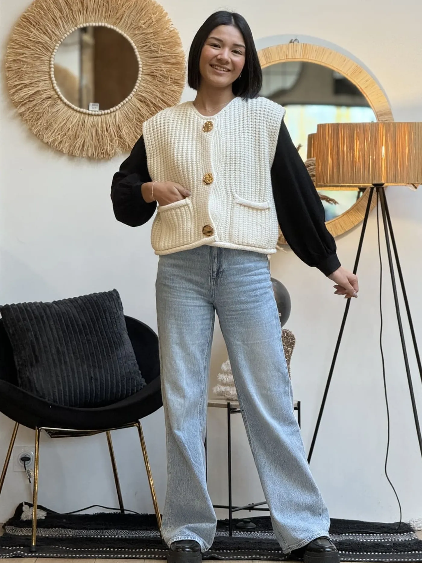 Gilet sans manche 3 gros boutons + 2 poches devant mailles torsadéesTaille : Mathilde mesure 1m65. Elle porte la tail…