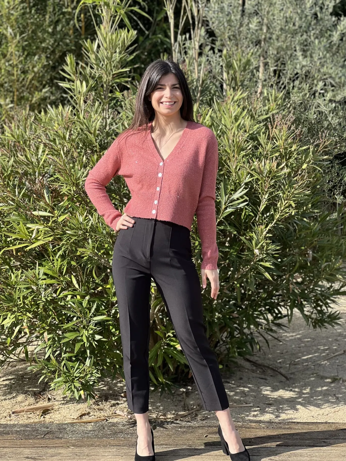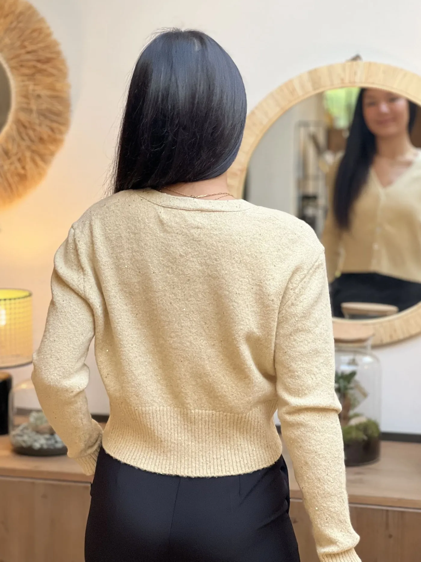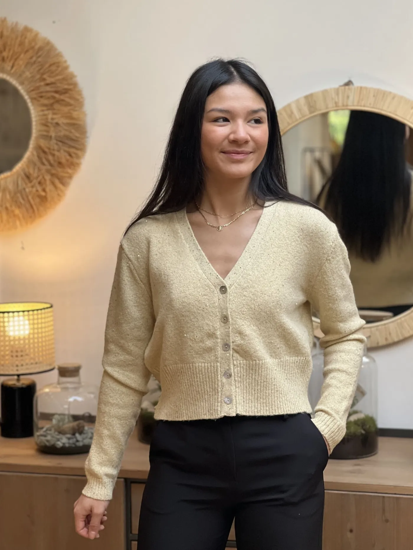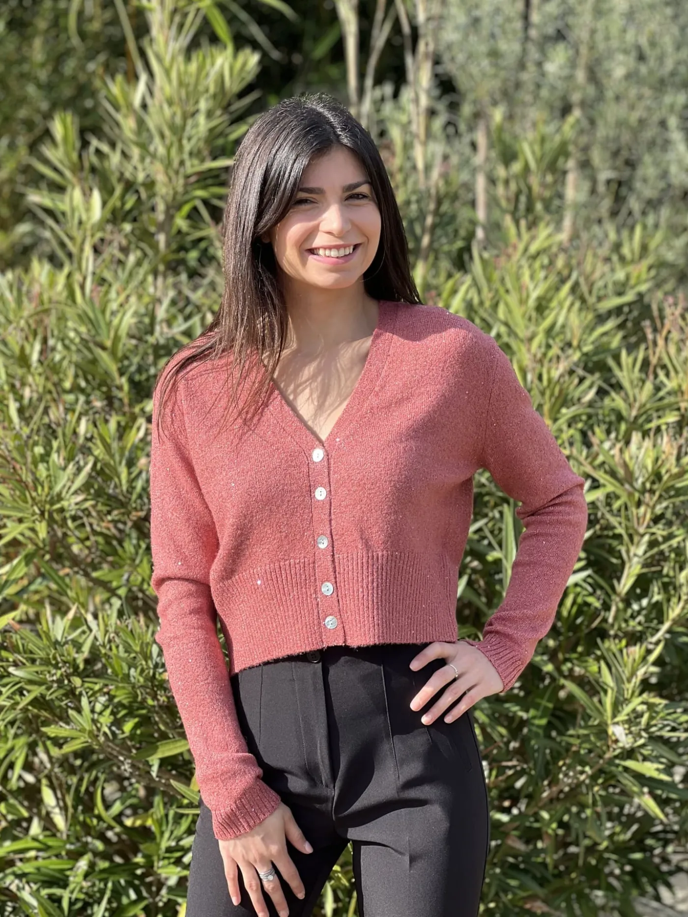 Gilet court à ml col v avec petits boutonsTaille : Justine mesure 1m69 et Louann mesure 1m64. Elles portent la taille …