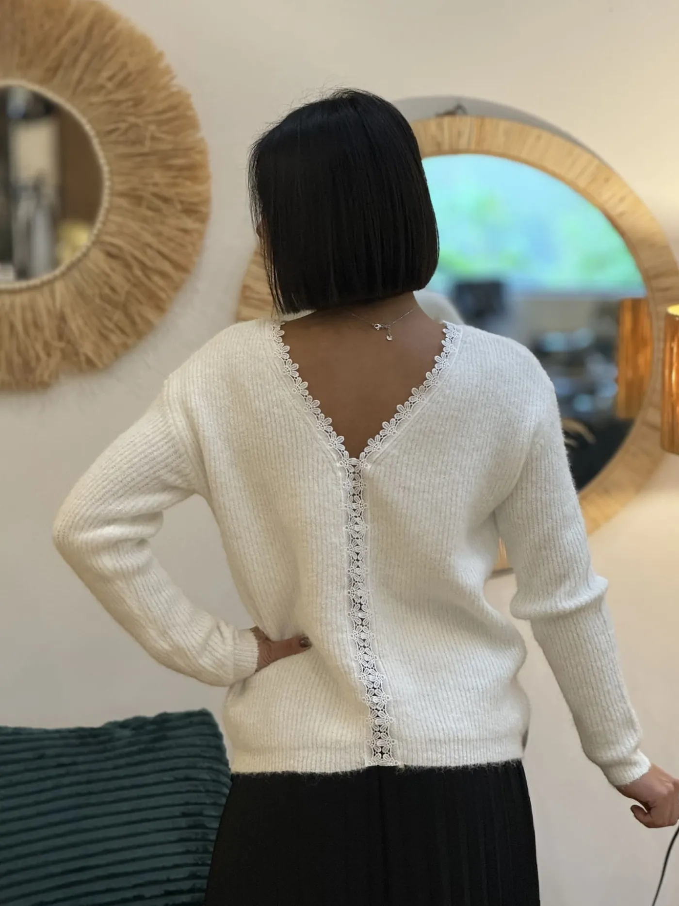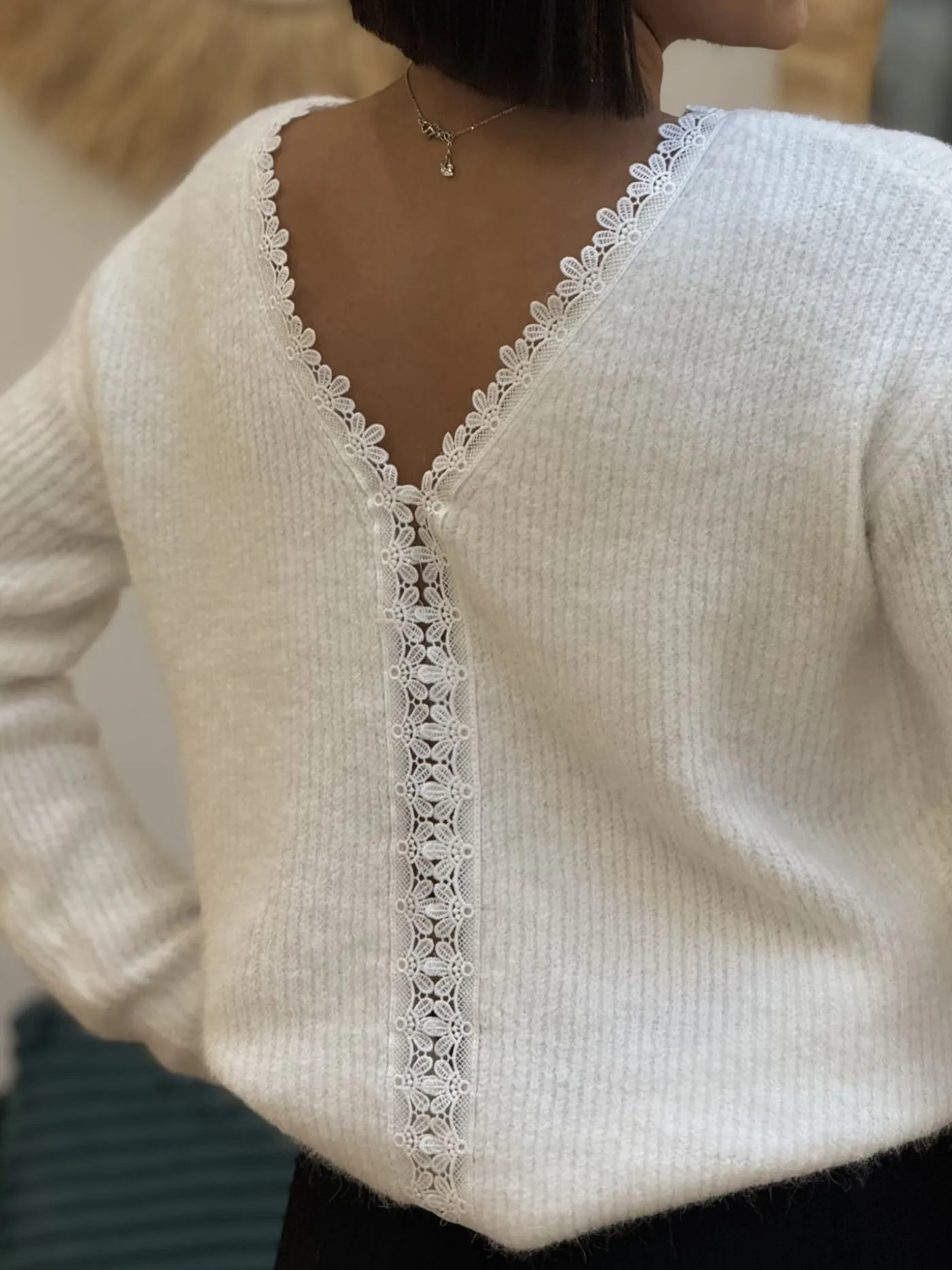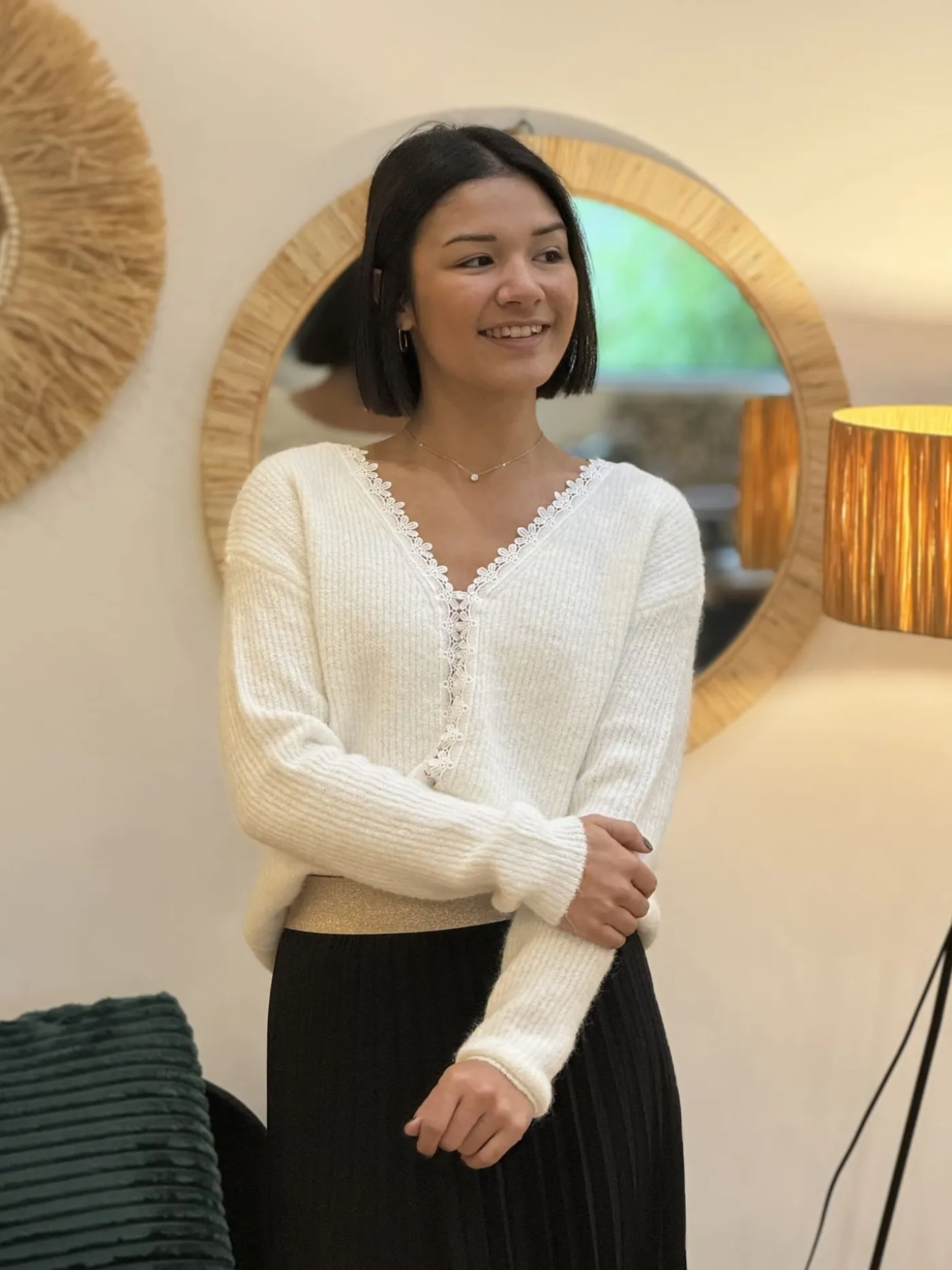 PULL À ML col v dentelle fleurieTaille : Mathilde mesure 1m65 et Justine mesure 1m69. Elles portent la taille S/M p…