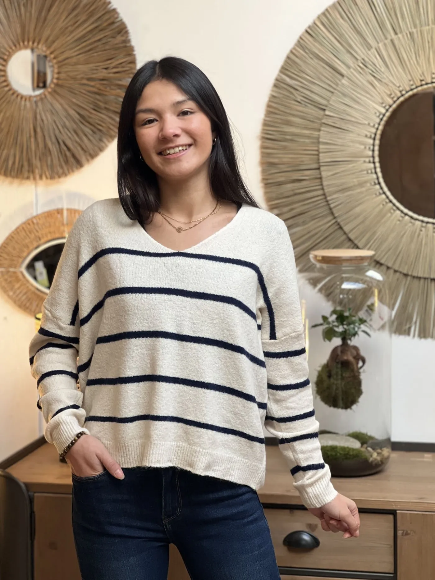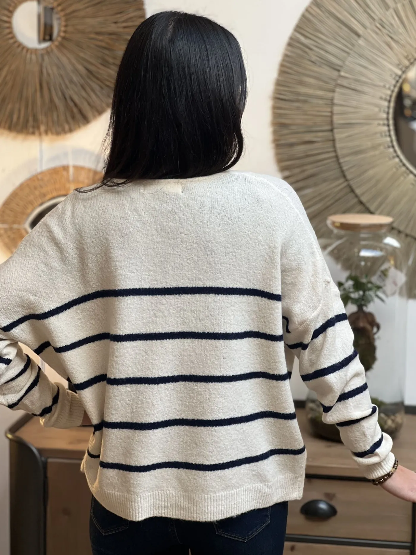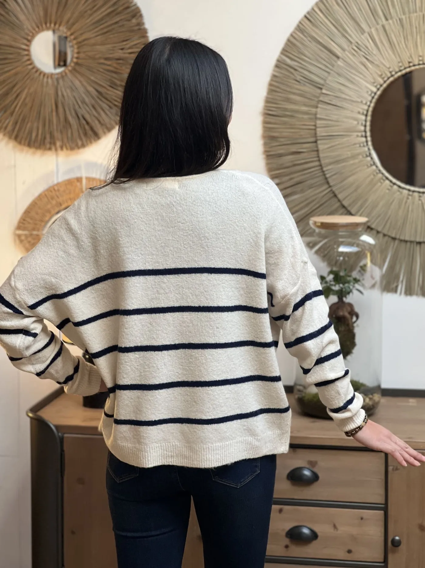 - Pull large ML col v avec rayures bleu marine