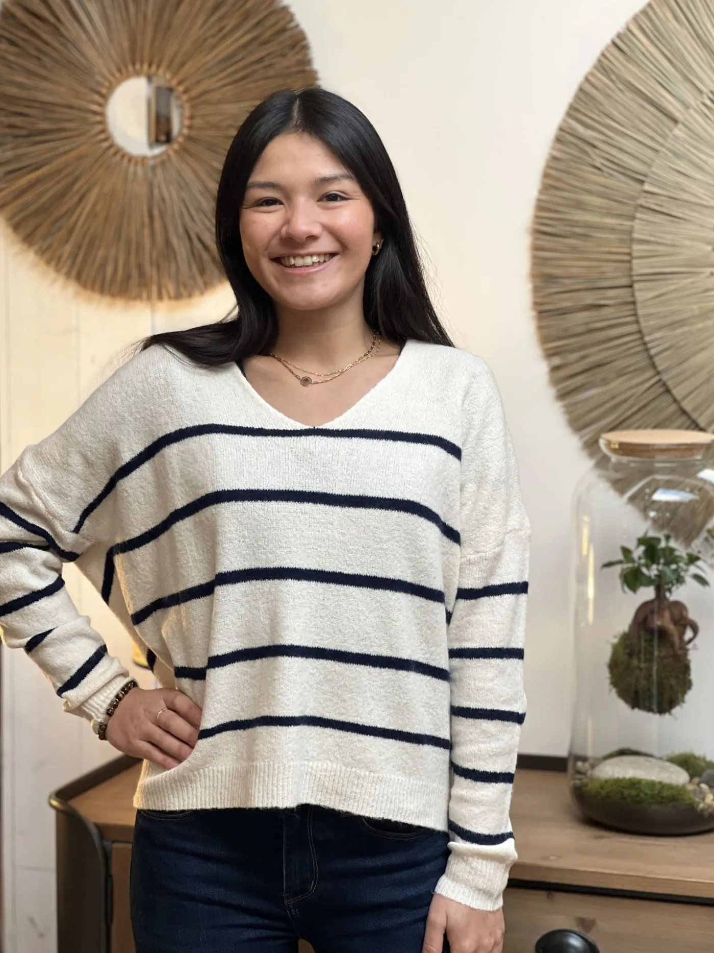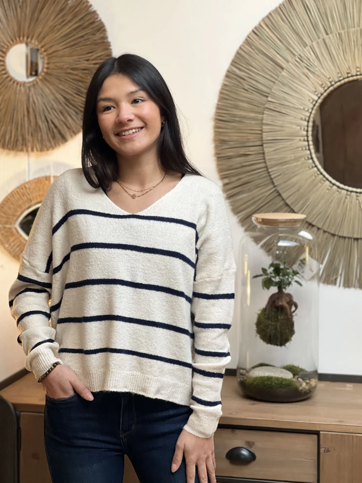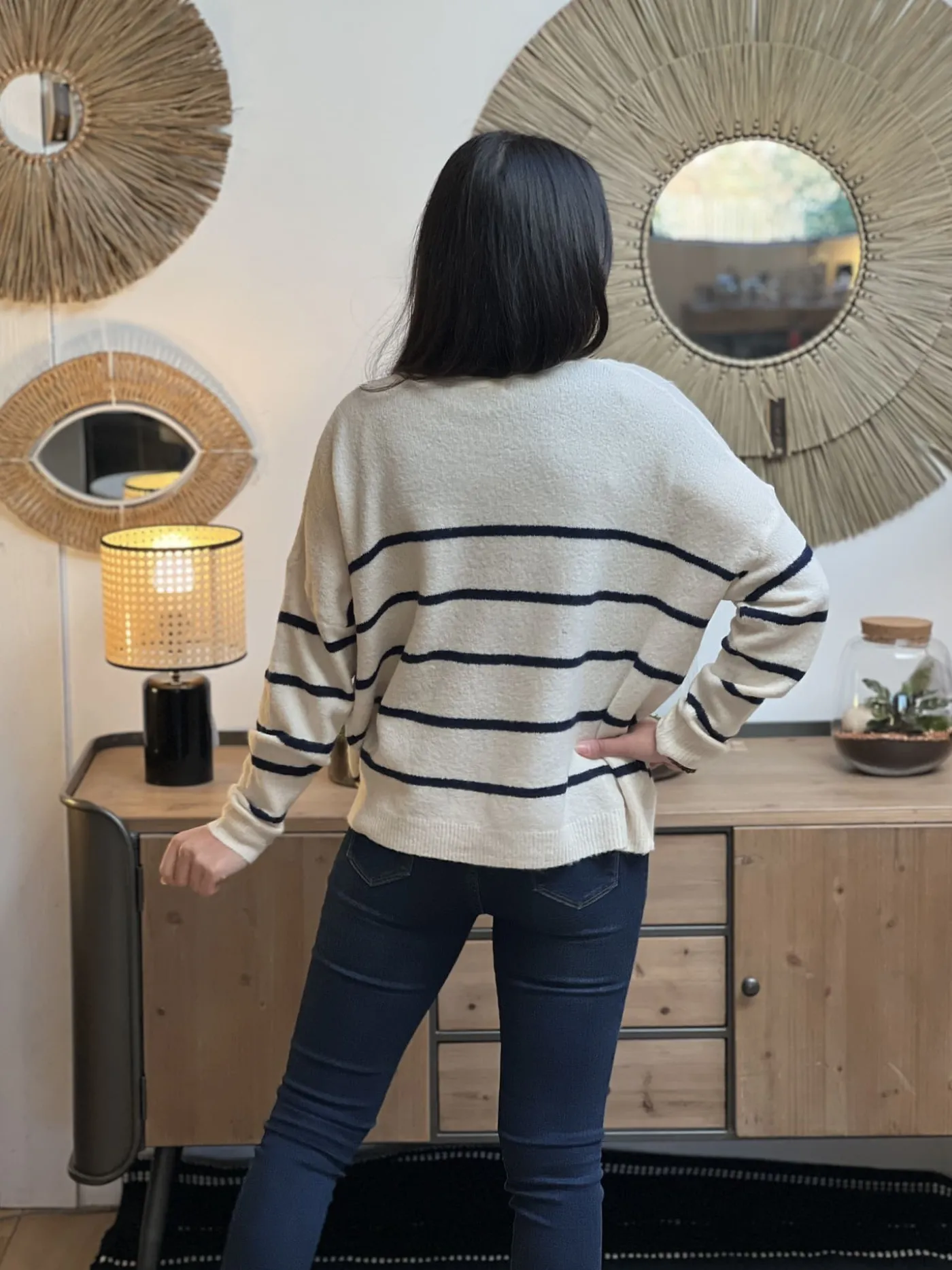 - Pull large ML col v avec rayures bleu marine