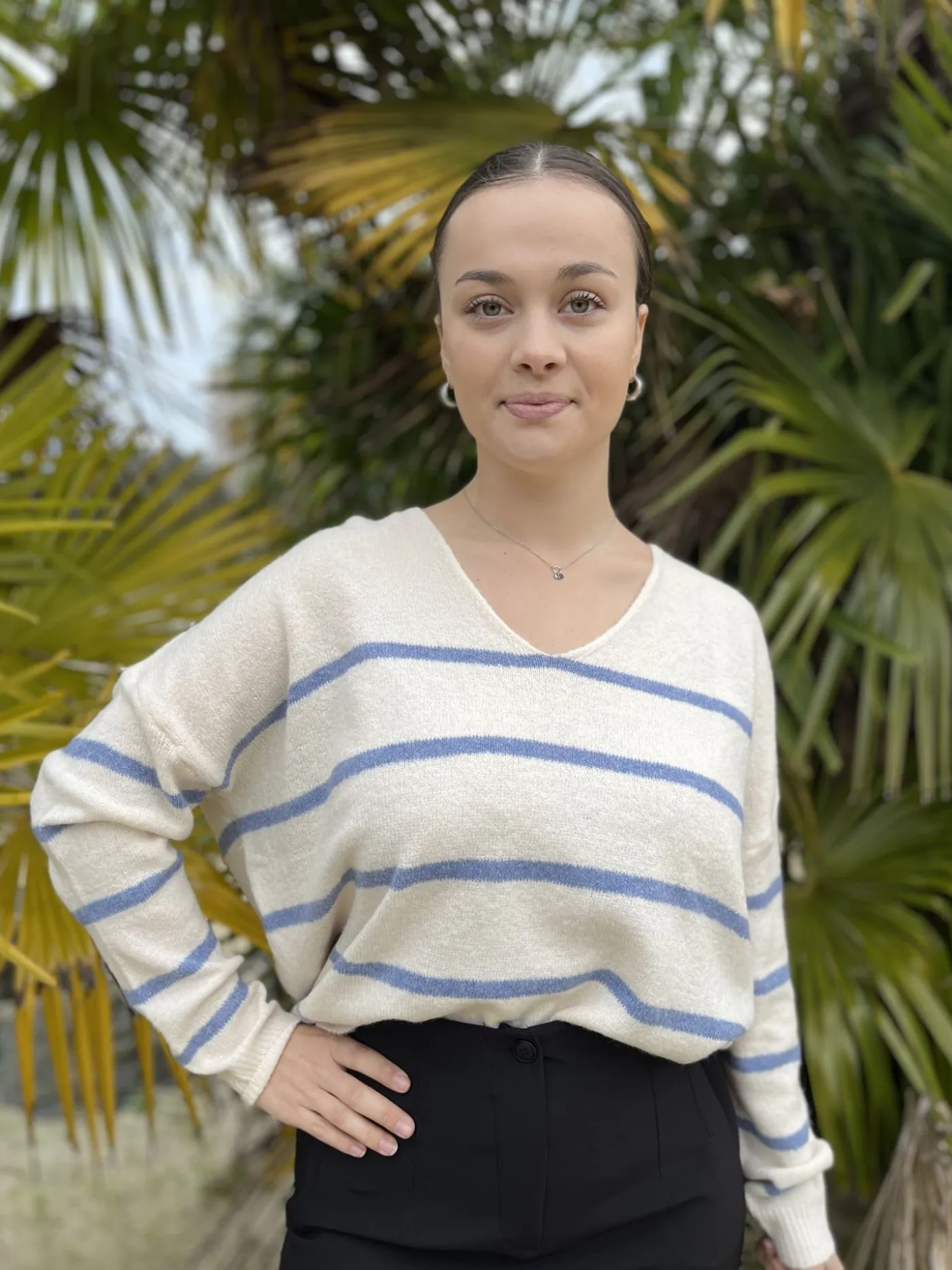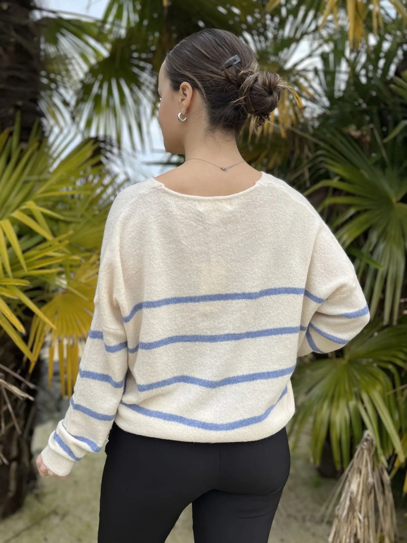 Pull large ML col v avec rayures bleu marineTaille : Mathilde mesure 1m65. Elle porte la taille Taille unique pour ce…
