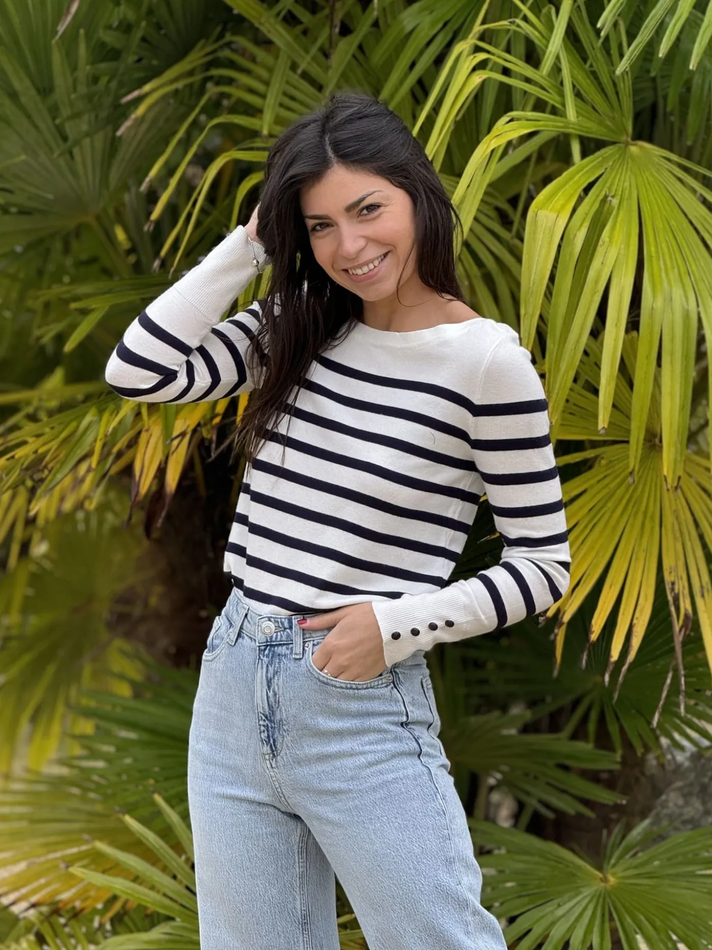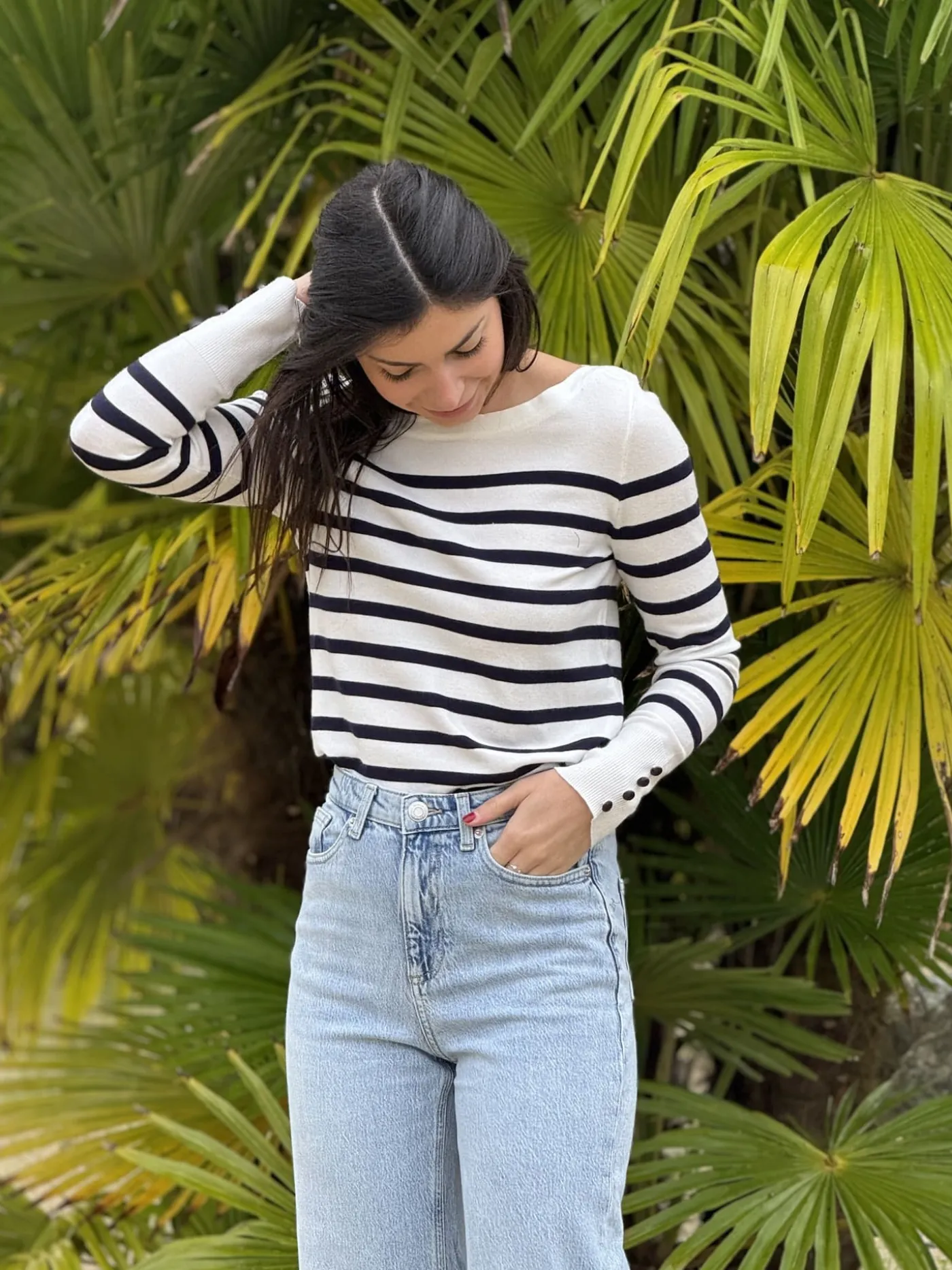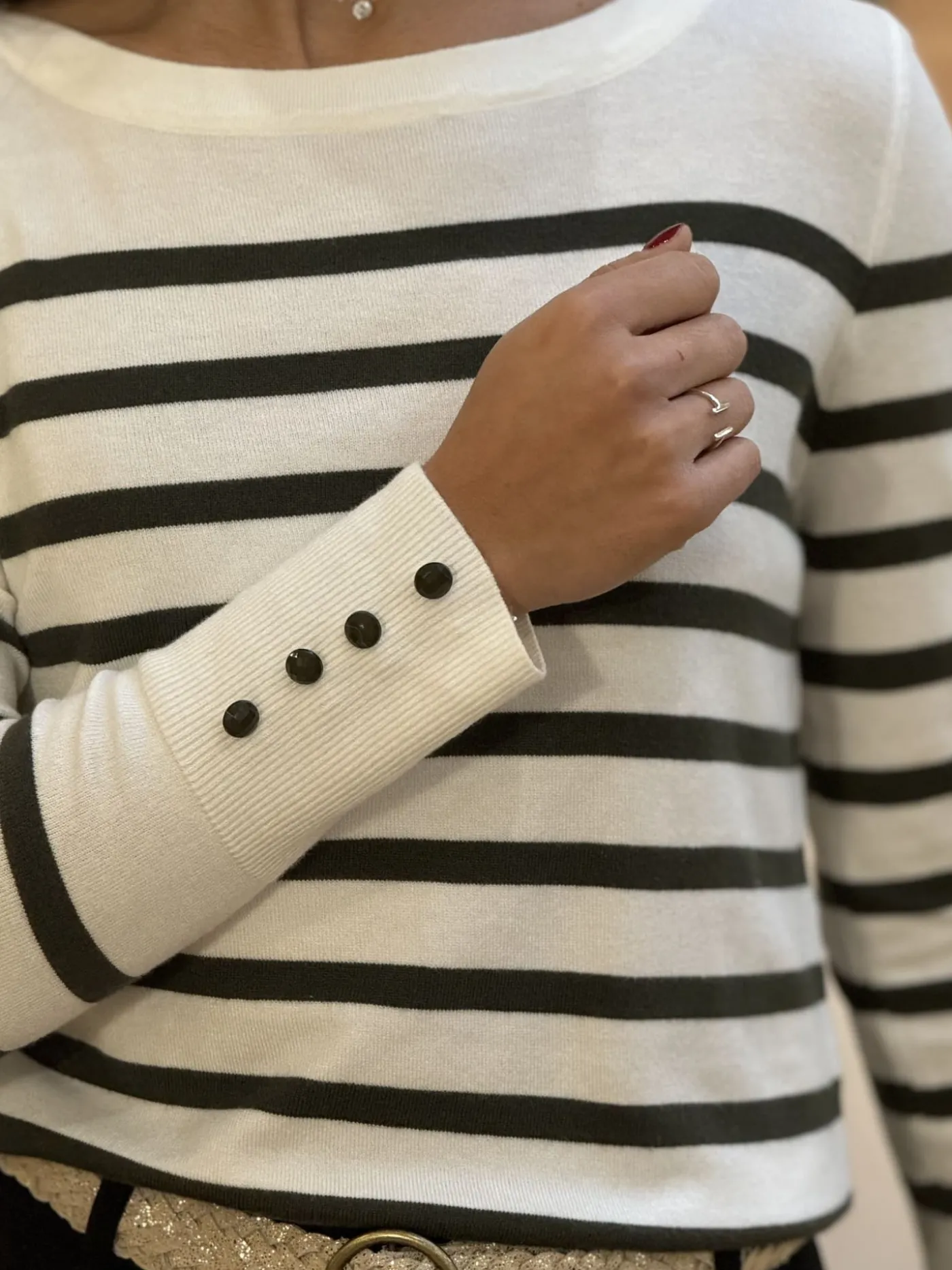 Pull à ml col rond avec boutons sur manche doré- imprimé marinièreTaille : Mathilde mesure 1m65. Elle porte la tail…