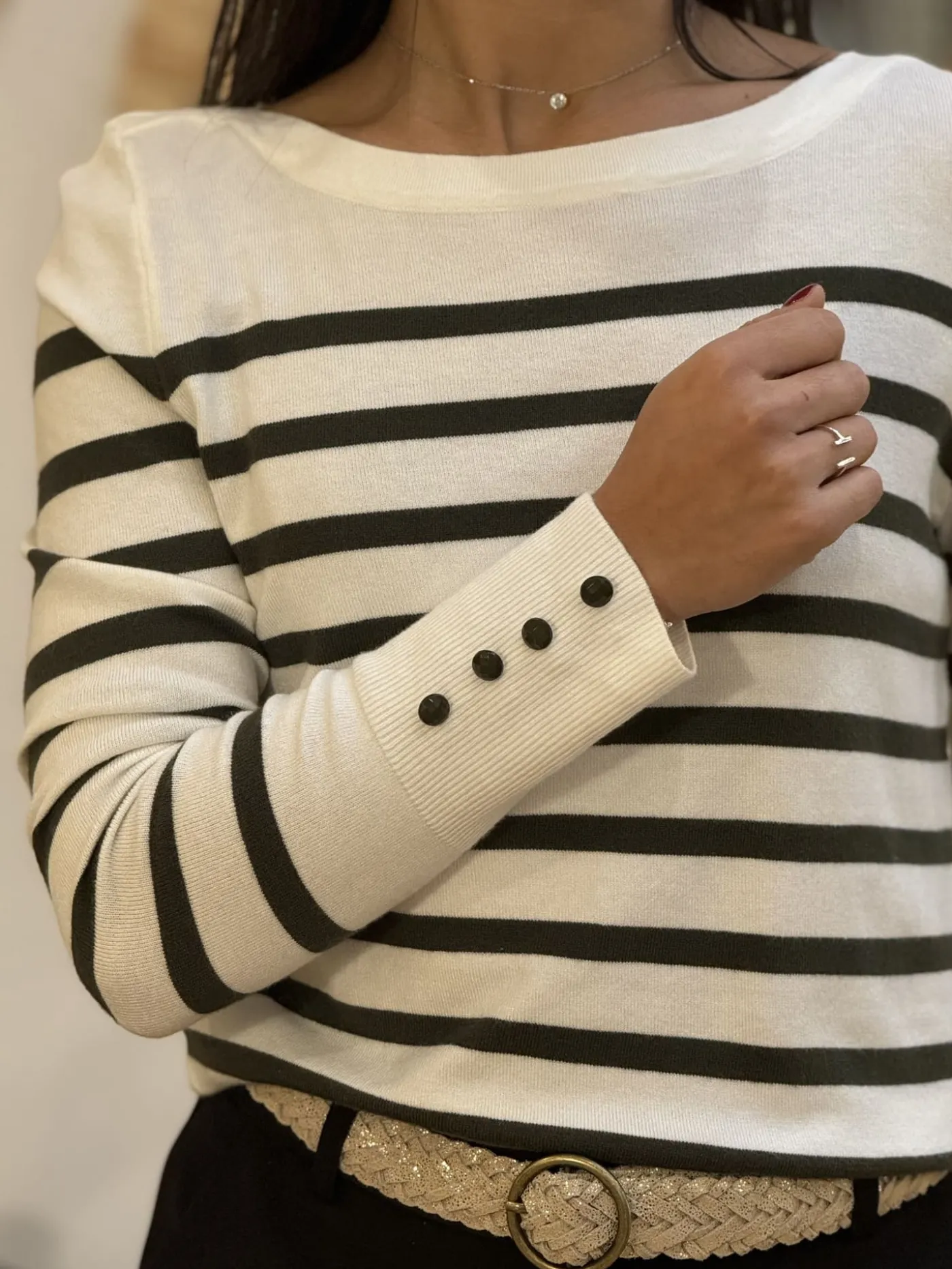 - Pull à ml col rond avec boutons sur manche doré- imprimé marinière