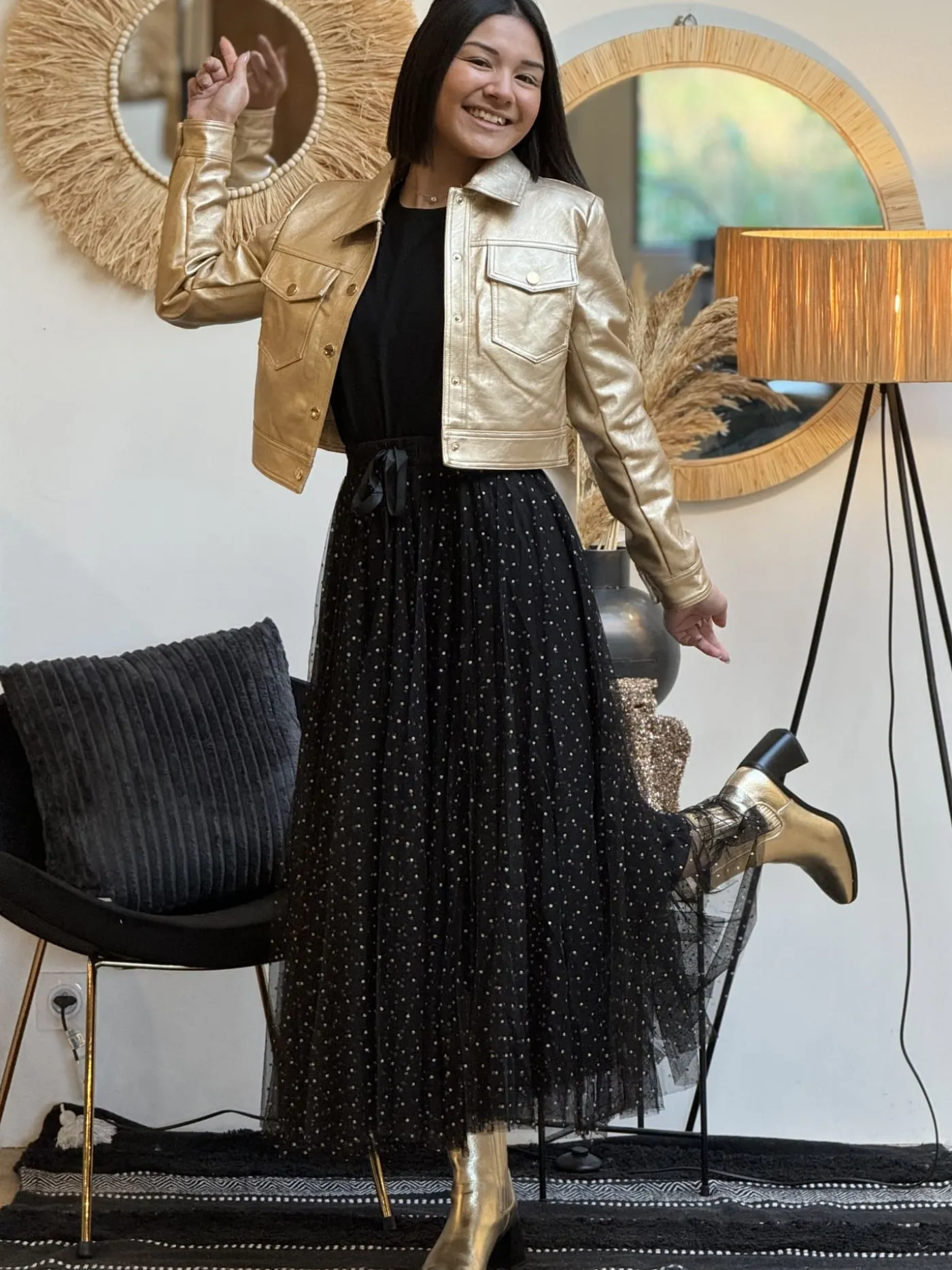 JUPE LONGUE EN TULLE À POIS DORÉSTaille : Mathilde mesure 1m65. Elle porte la taille S pour ce modèle. Nous vous …