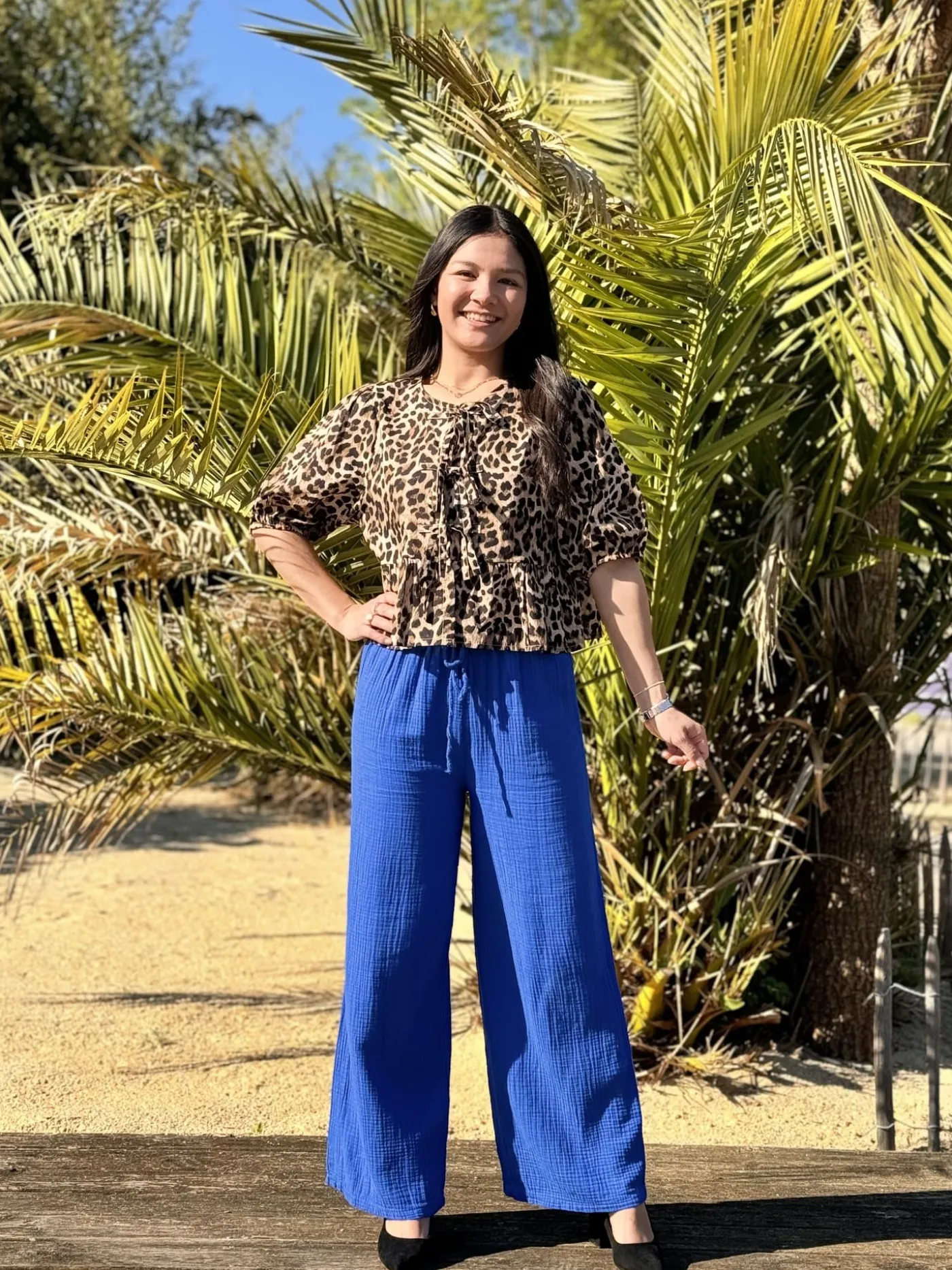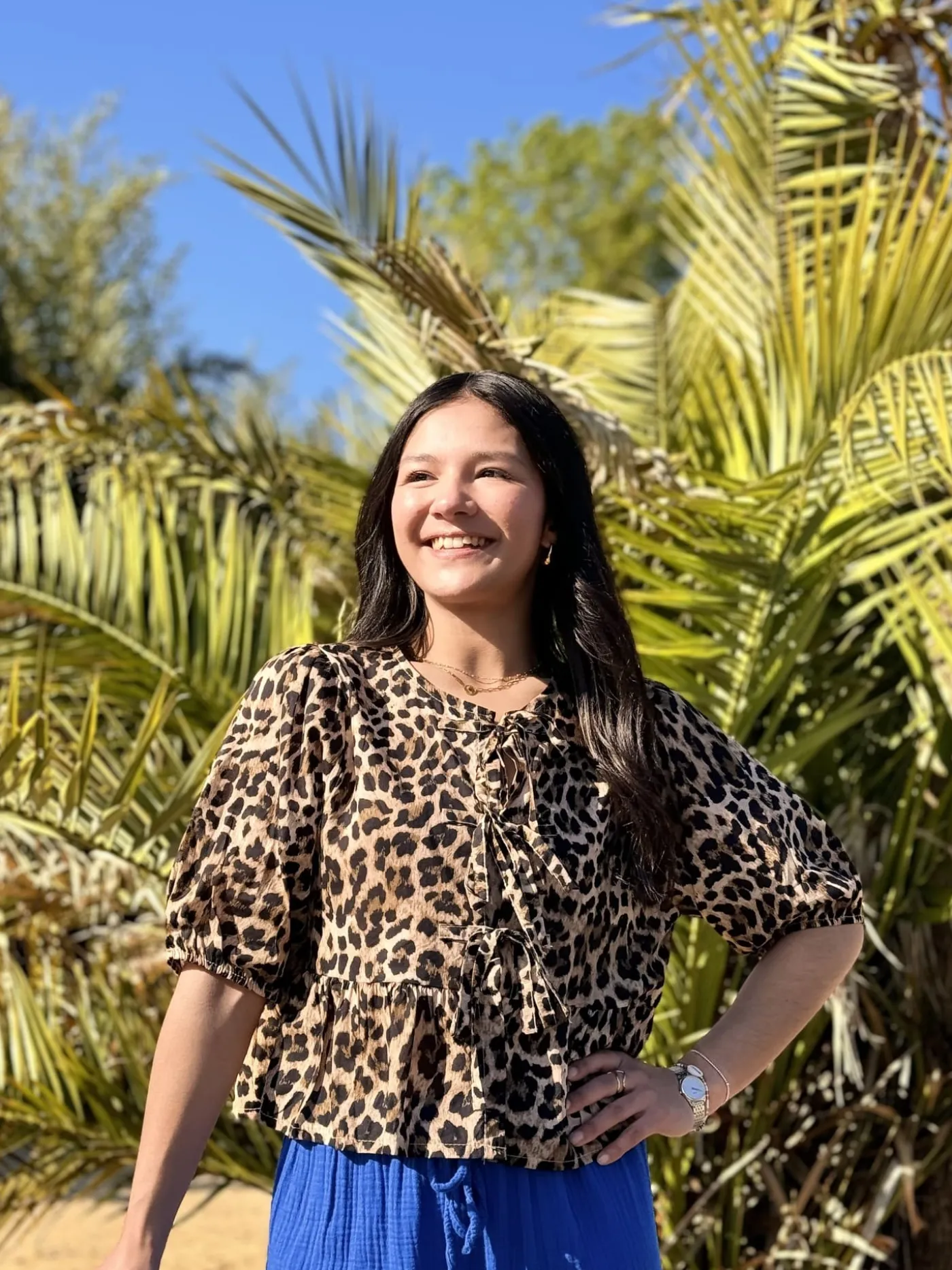 Blouse à manches 3/4 + nœuds devant – imprimé léopardTaille : Mathilde mesure 1m65. Elle porte la taille unique po…