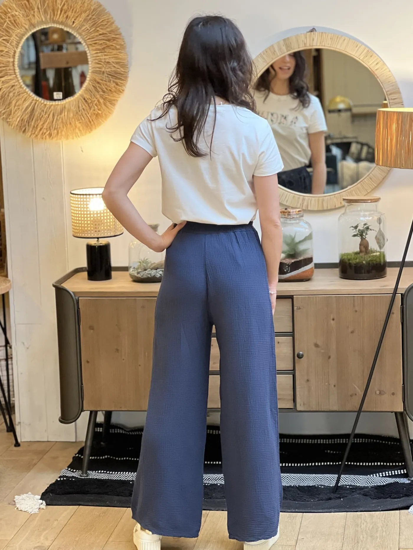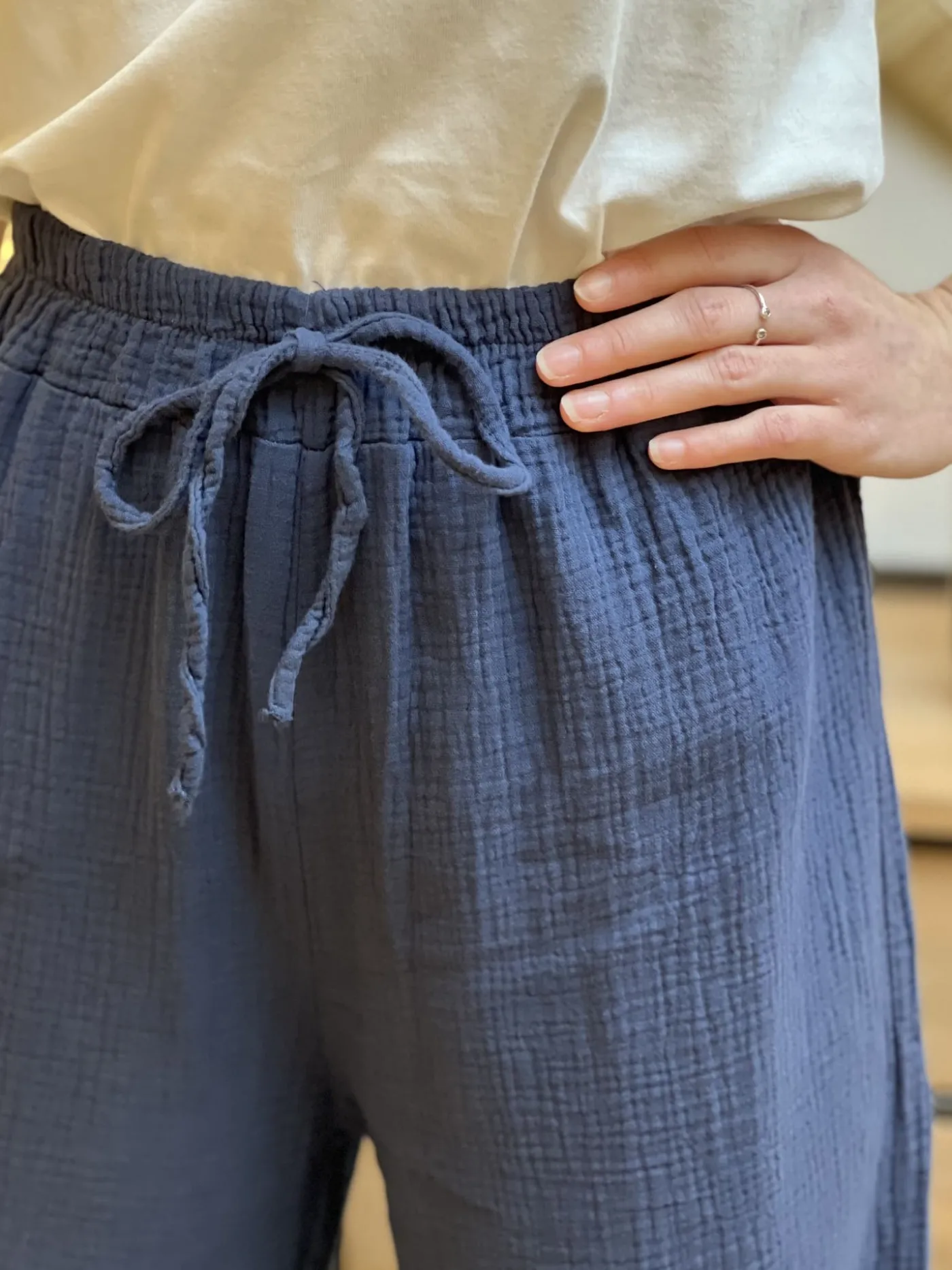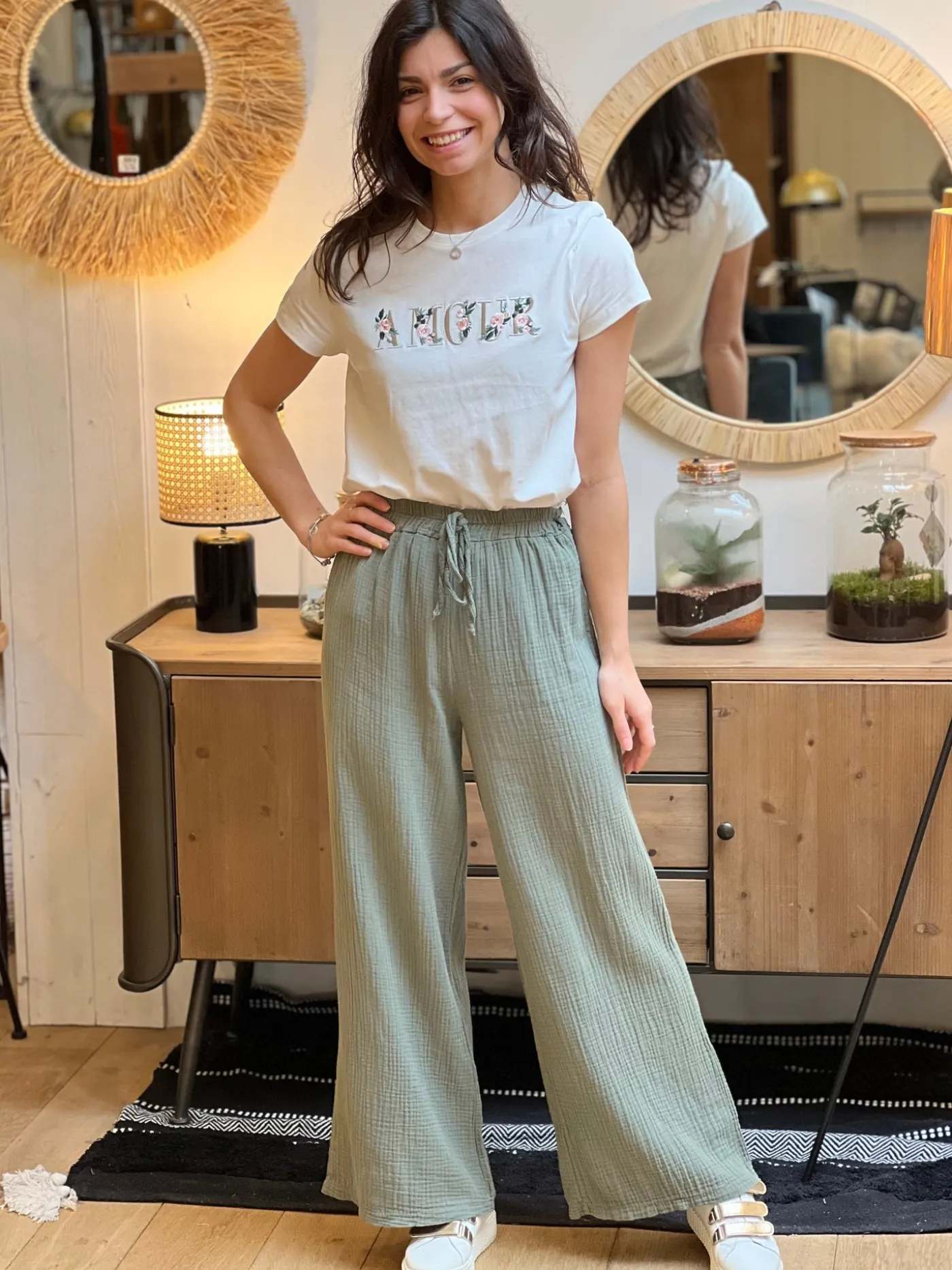 Pantalon large en gaze de cotonTaille : Justine mesure 1m69, Mathilde mesure 1m65 et Juliette mesure 1m63. Elles porten…