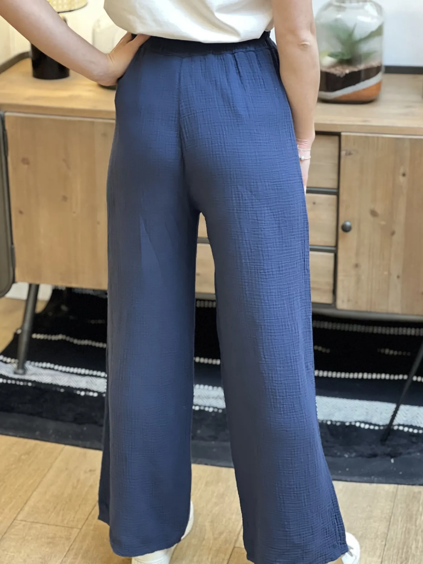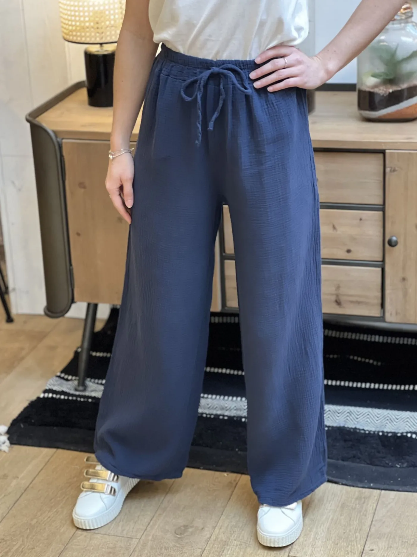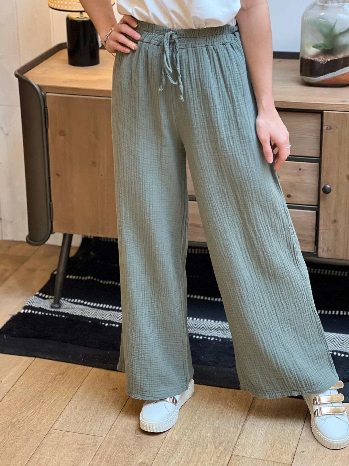 Pantalon large en gaze de cotonTaille : Justine mesure 1m69, Mathilde mesure 1m65 et Juliette mesure 1m63. Elles porten…
