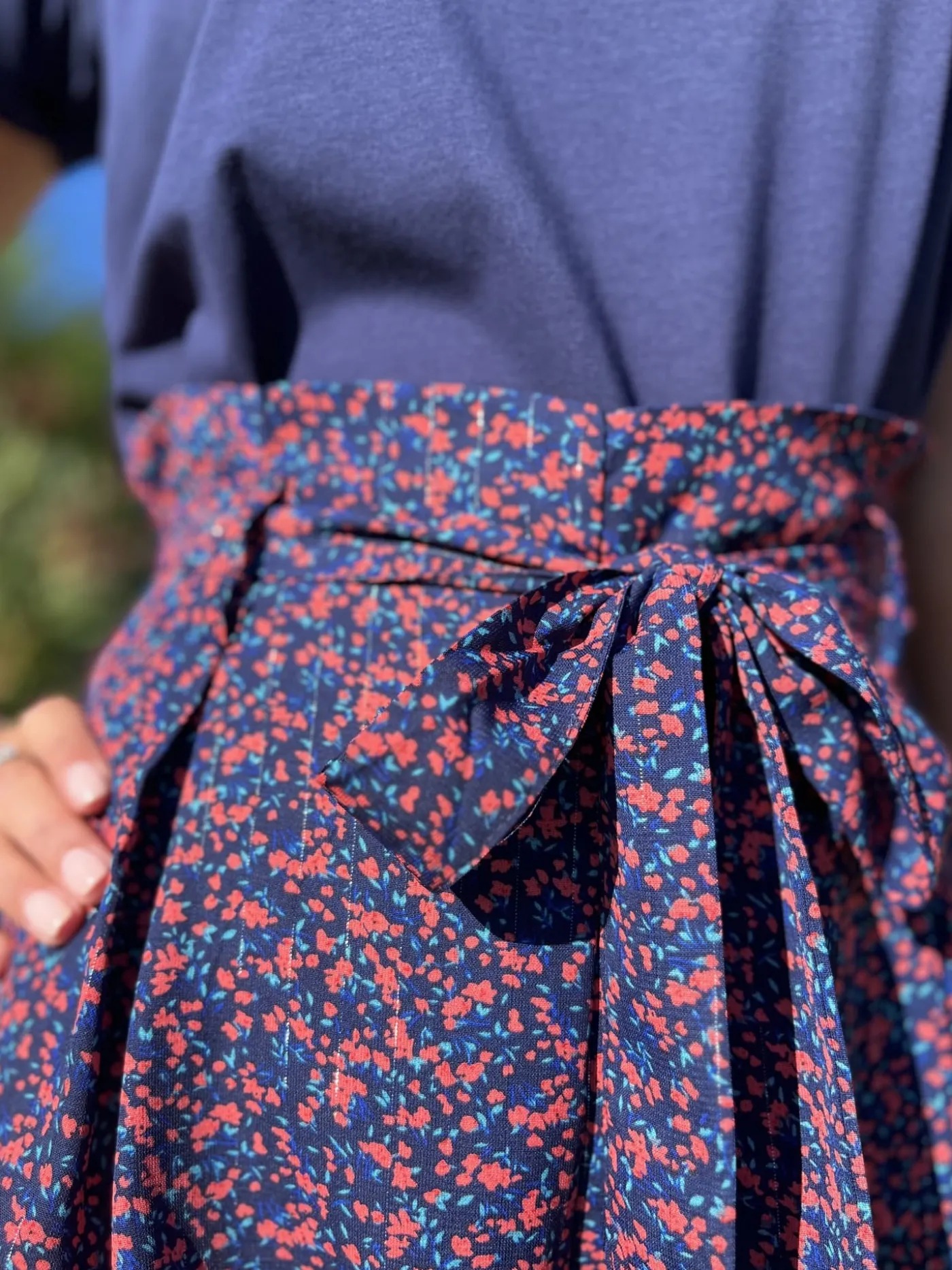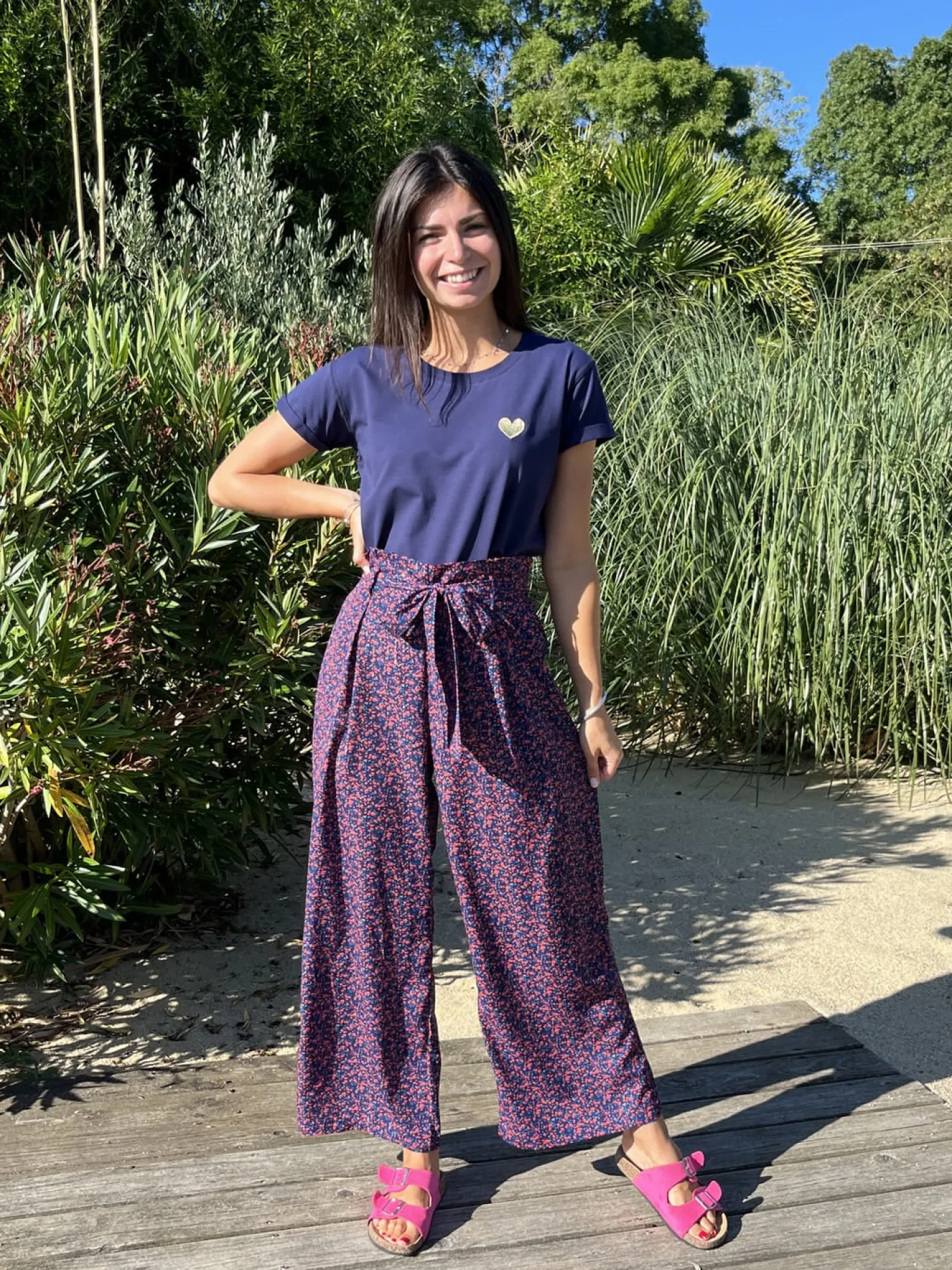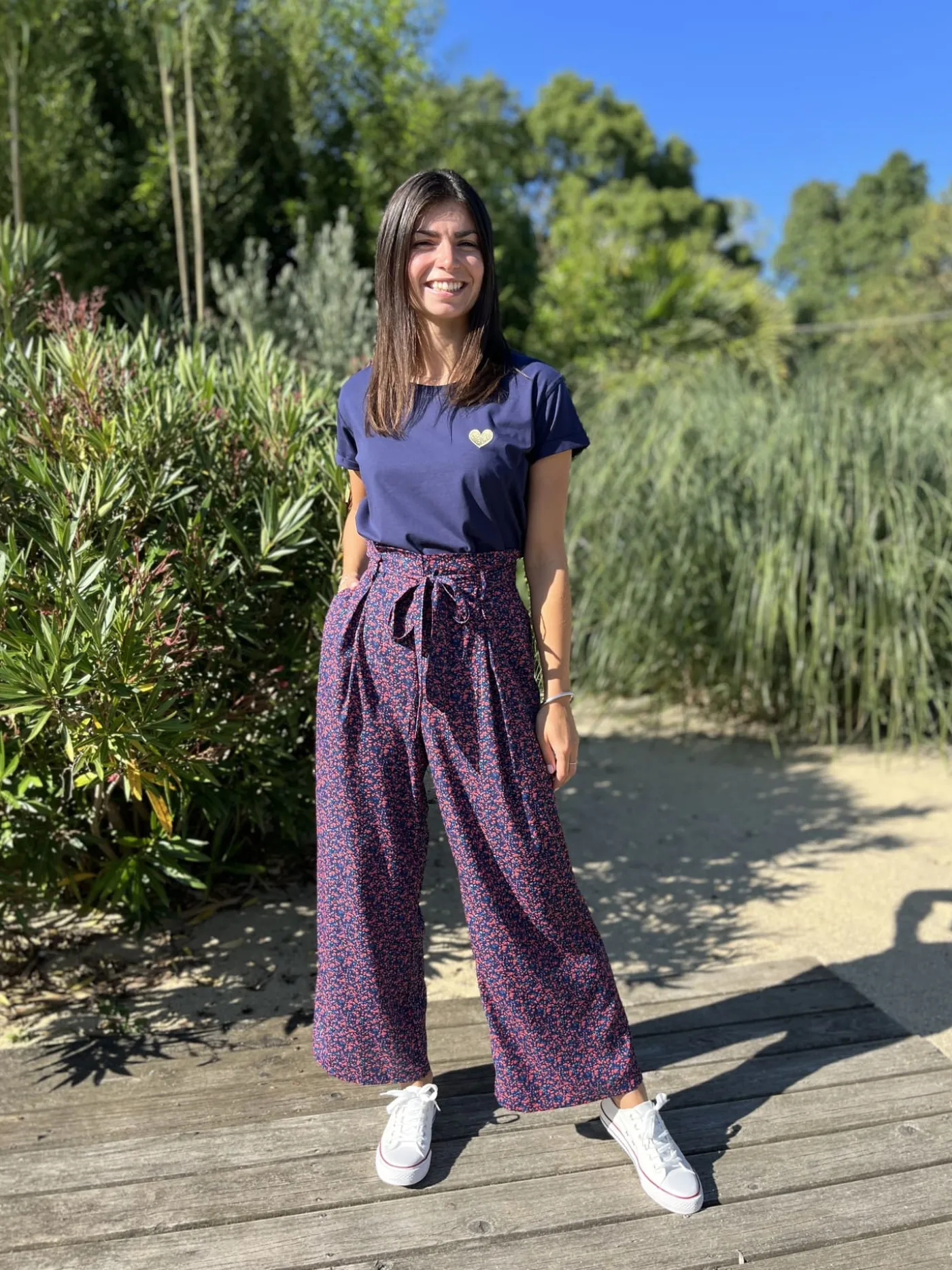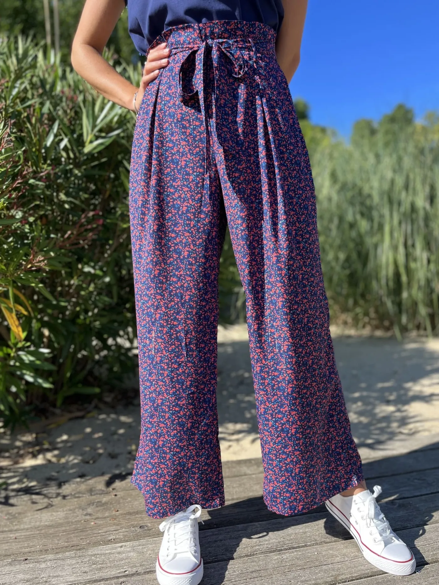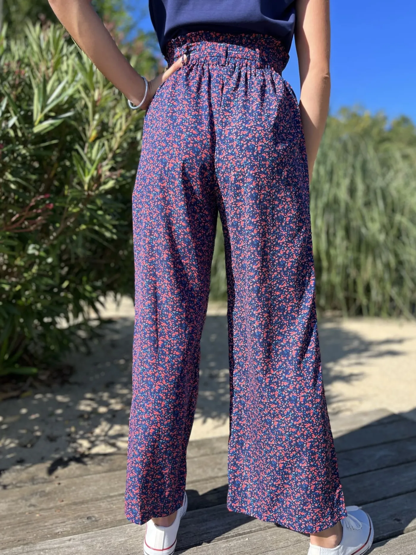 PANTALON LARGE FLUIDE – IMPRIMÉ PETITES FLEURS BLEU ROSETaille : Justine mesure 1m69. Elle porte la taille S/M po…