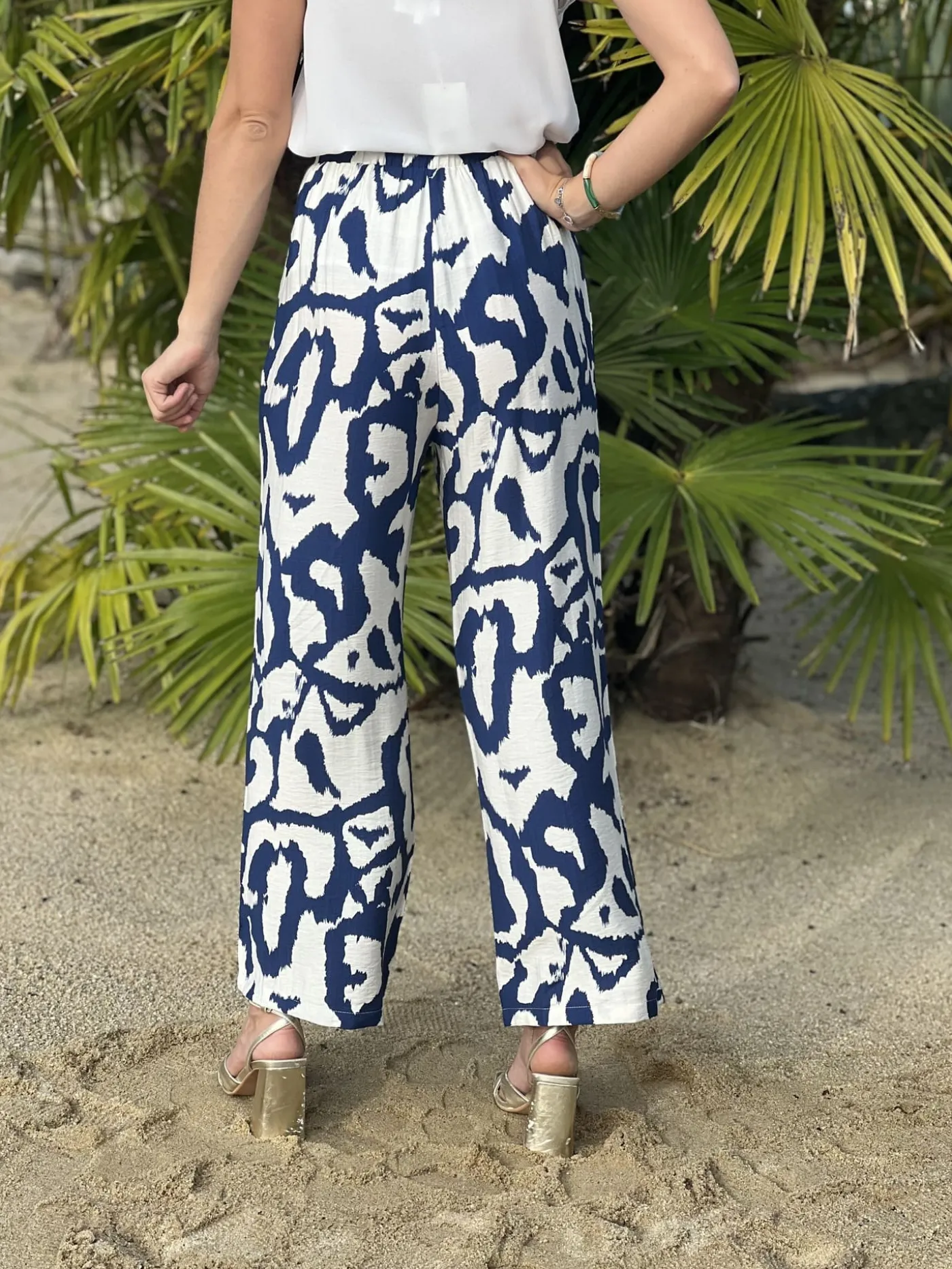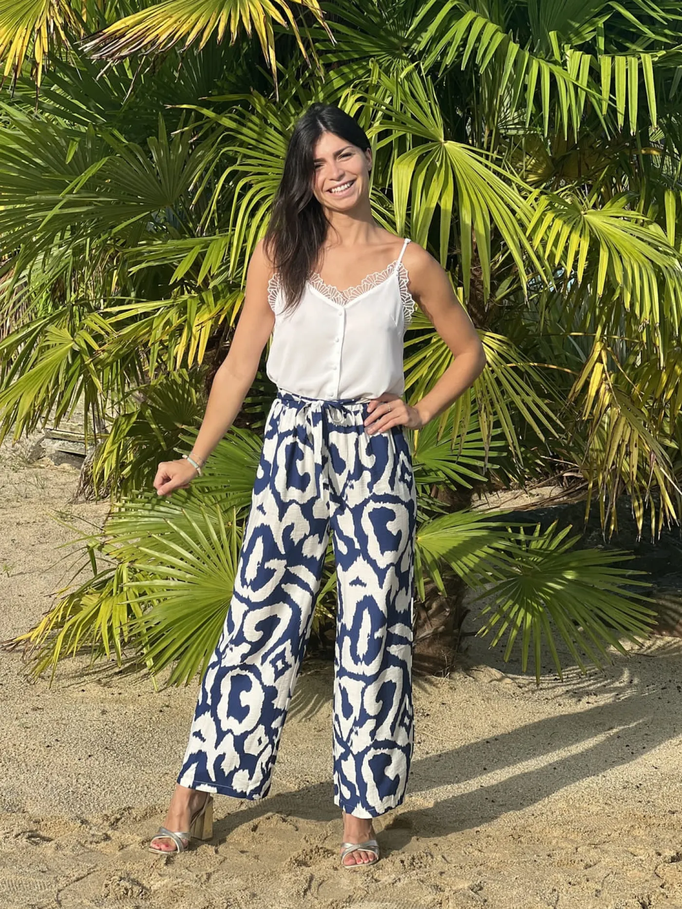 - PANTALON LARGE FLUIDE CEINTURE À LA TAILLE IMPRIMé tacheté marine et blanc