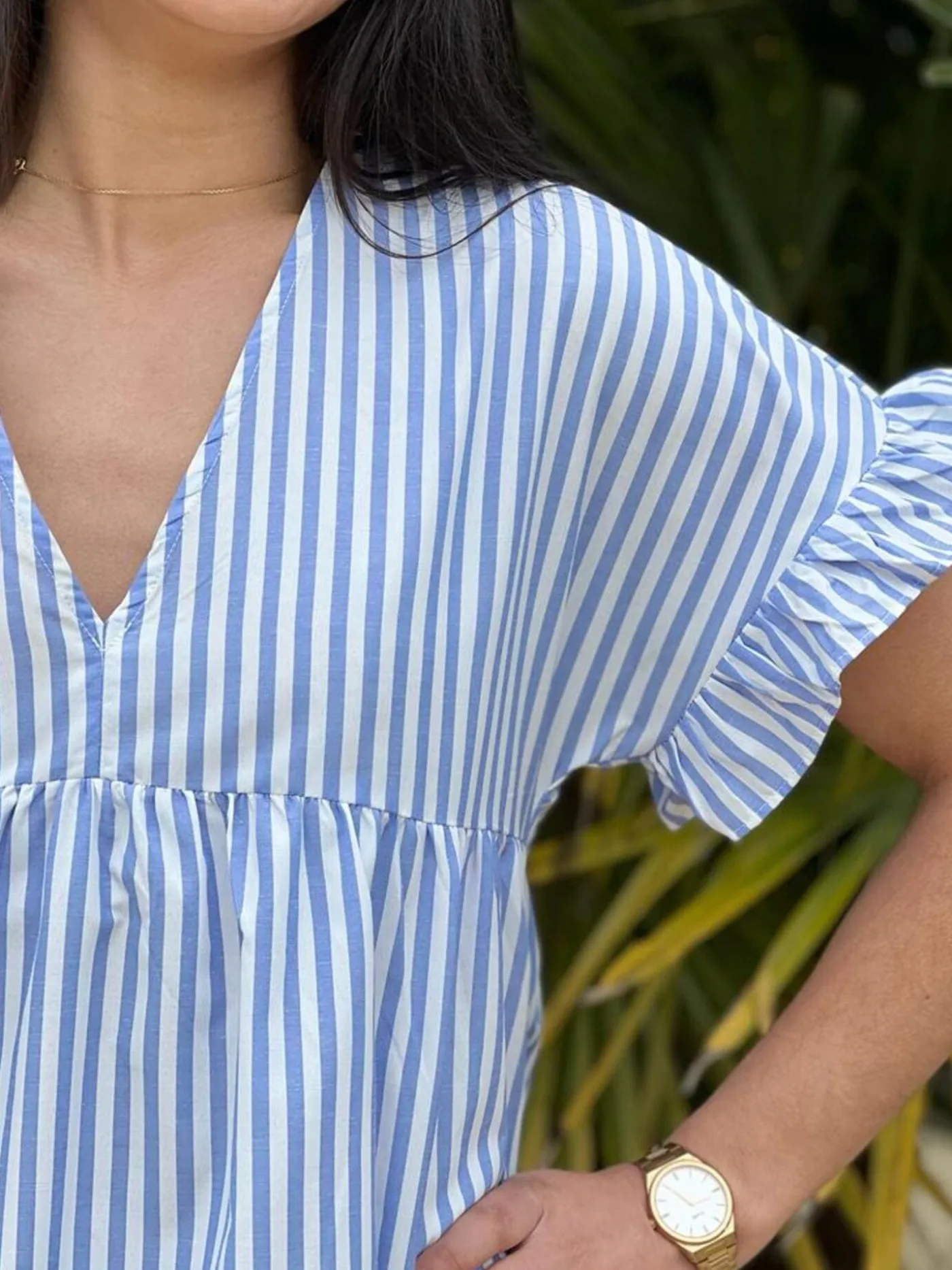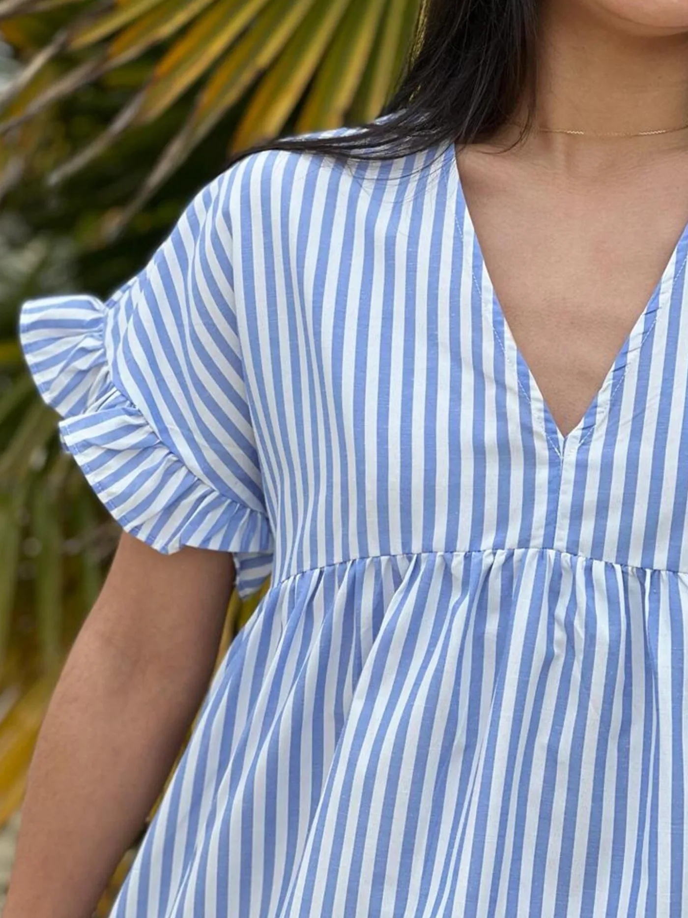 ROBE MANCHE COURTE COL V MOTIF VIOLETTaille : Mathilde mesure 1m65. Elle porte la taille S/M pour ce modèle. Taill…