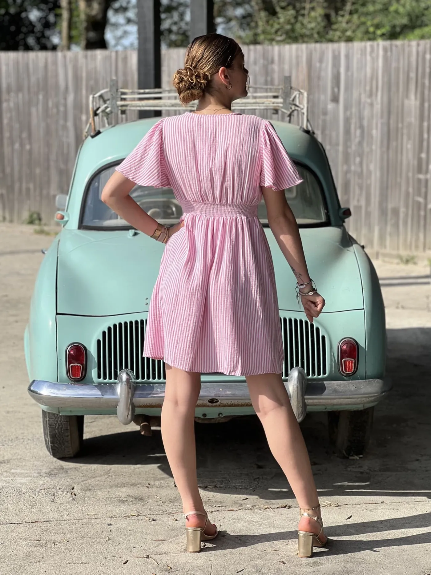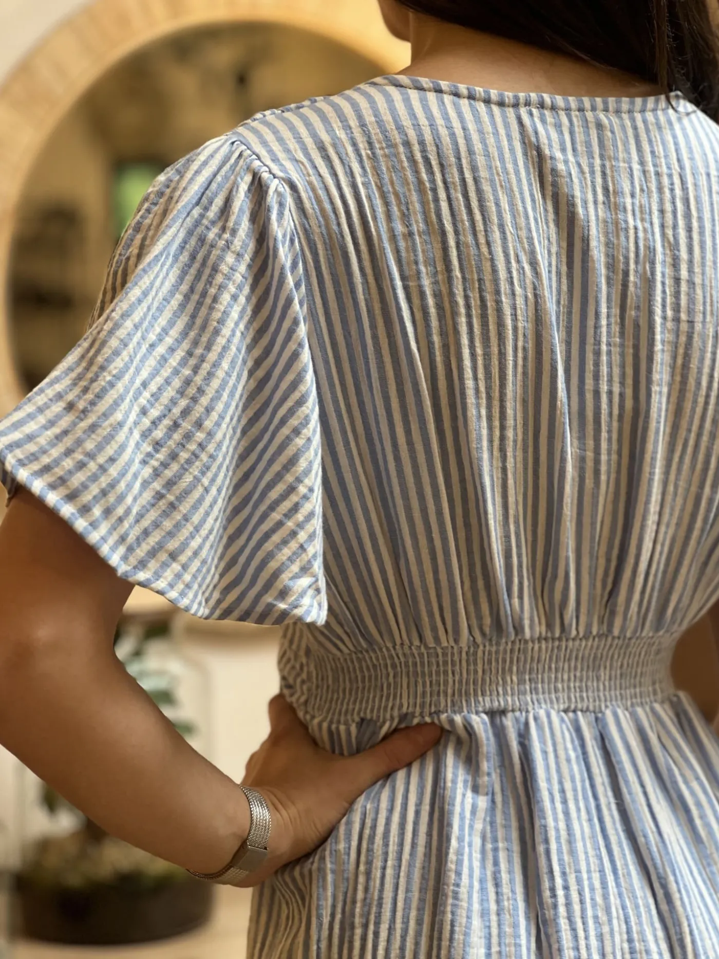 ROBE COURTE A MC COL V – RAYURES BLEU CLAIRES ET BLANCHESTaille : Justine mesure 1m69. Elle porte la taille S/M pour c…