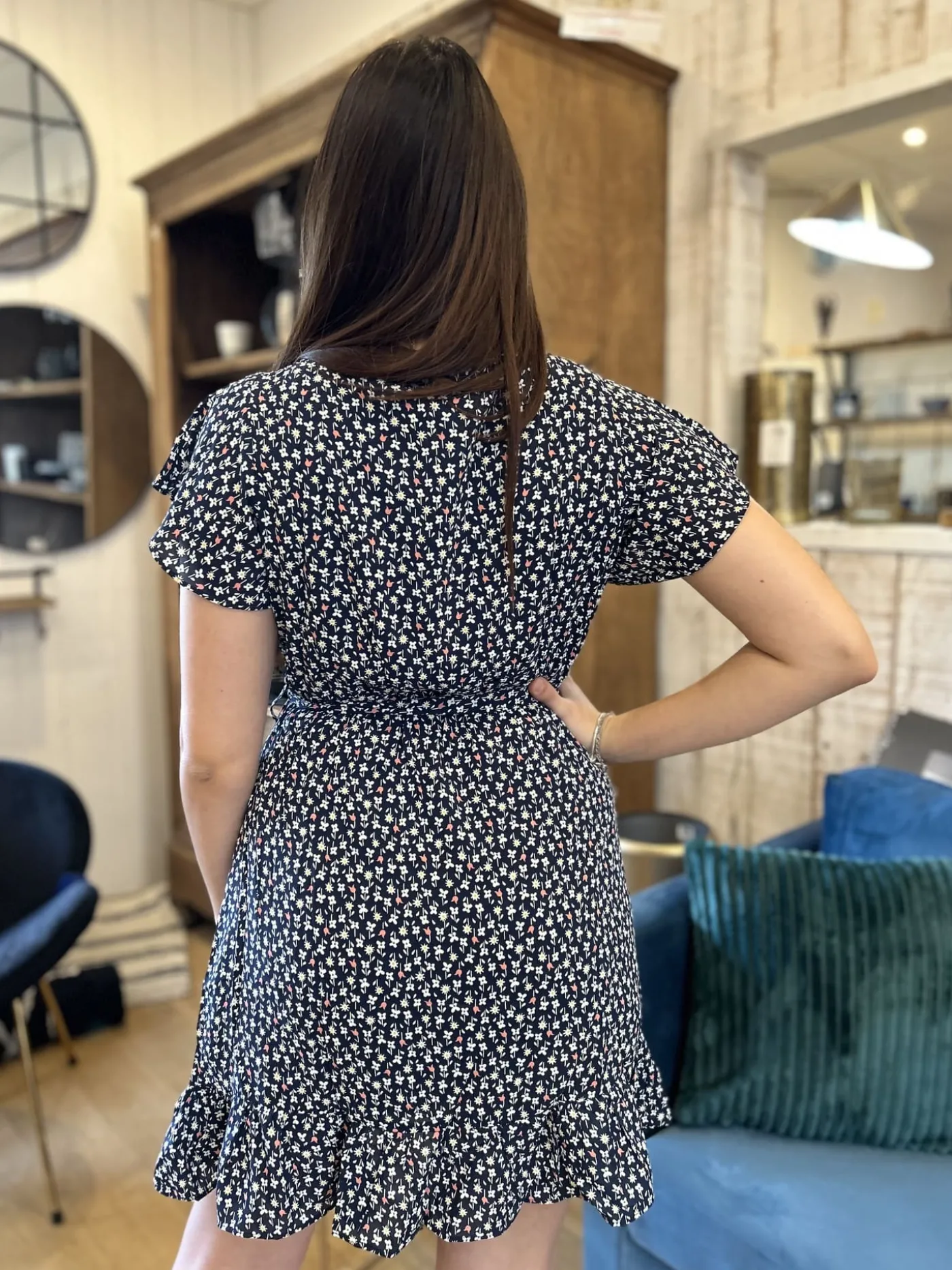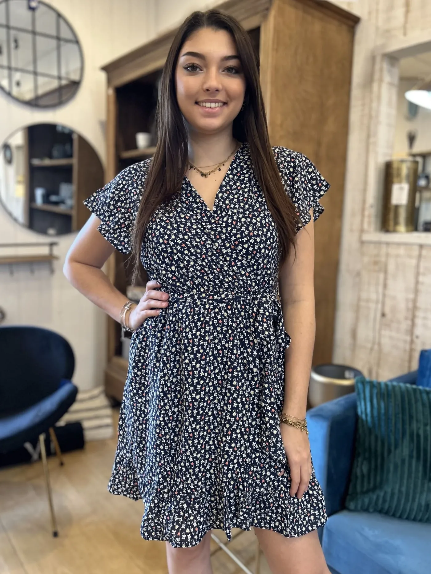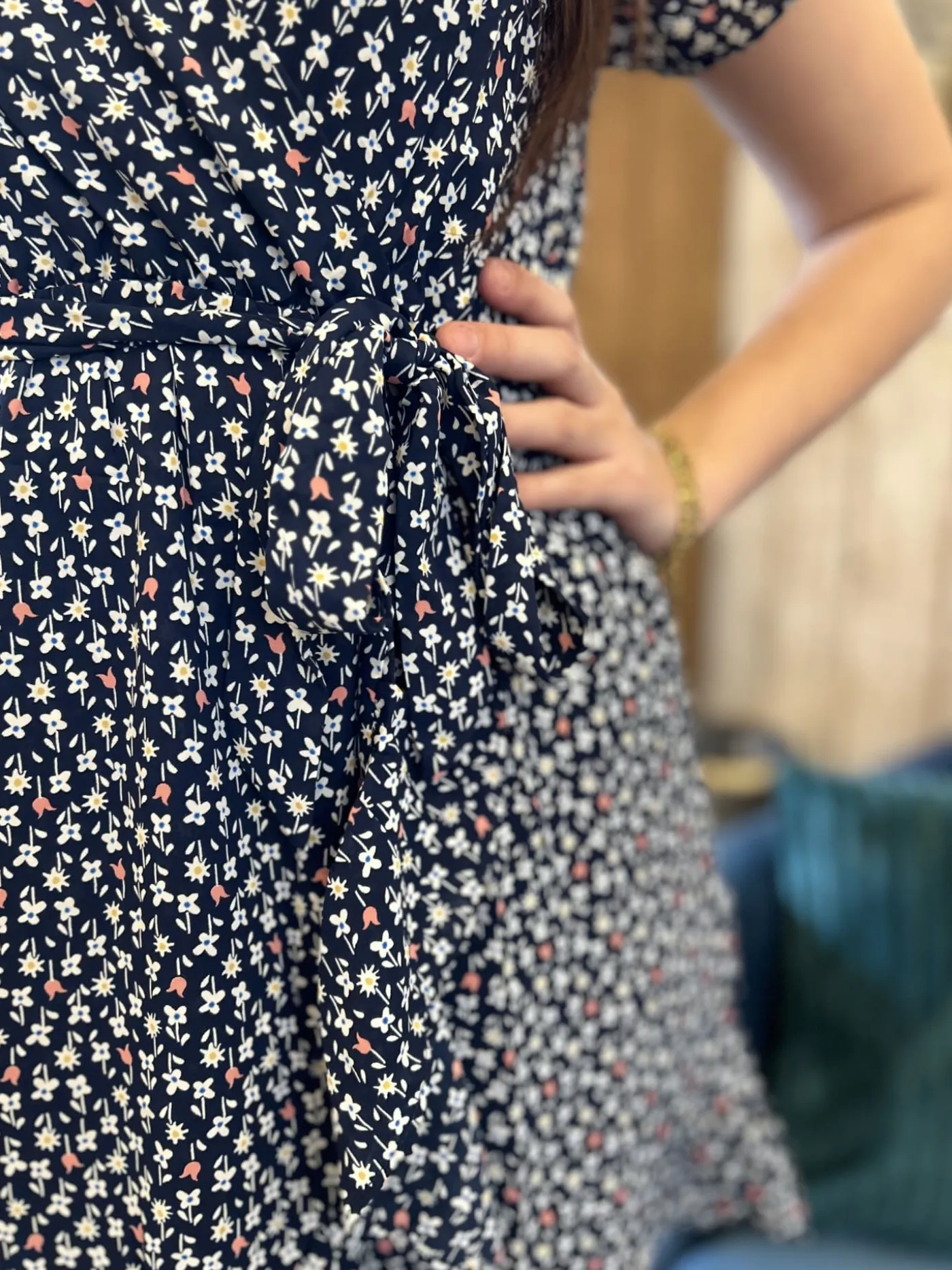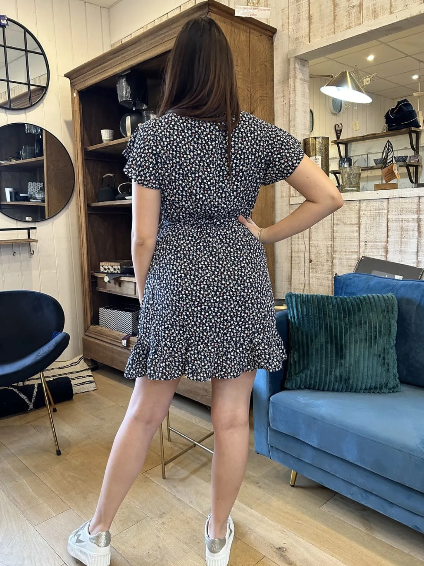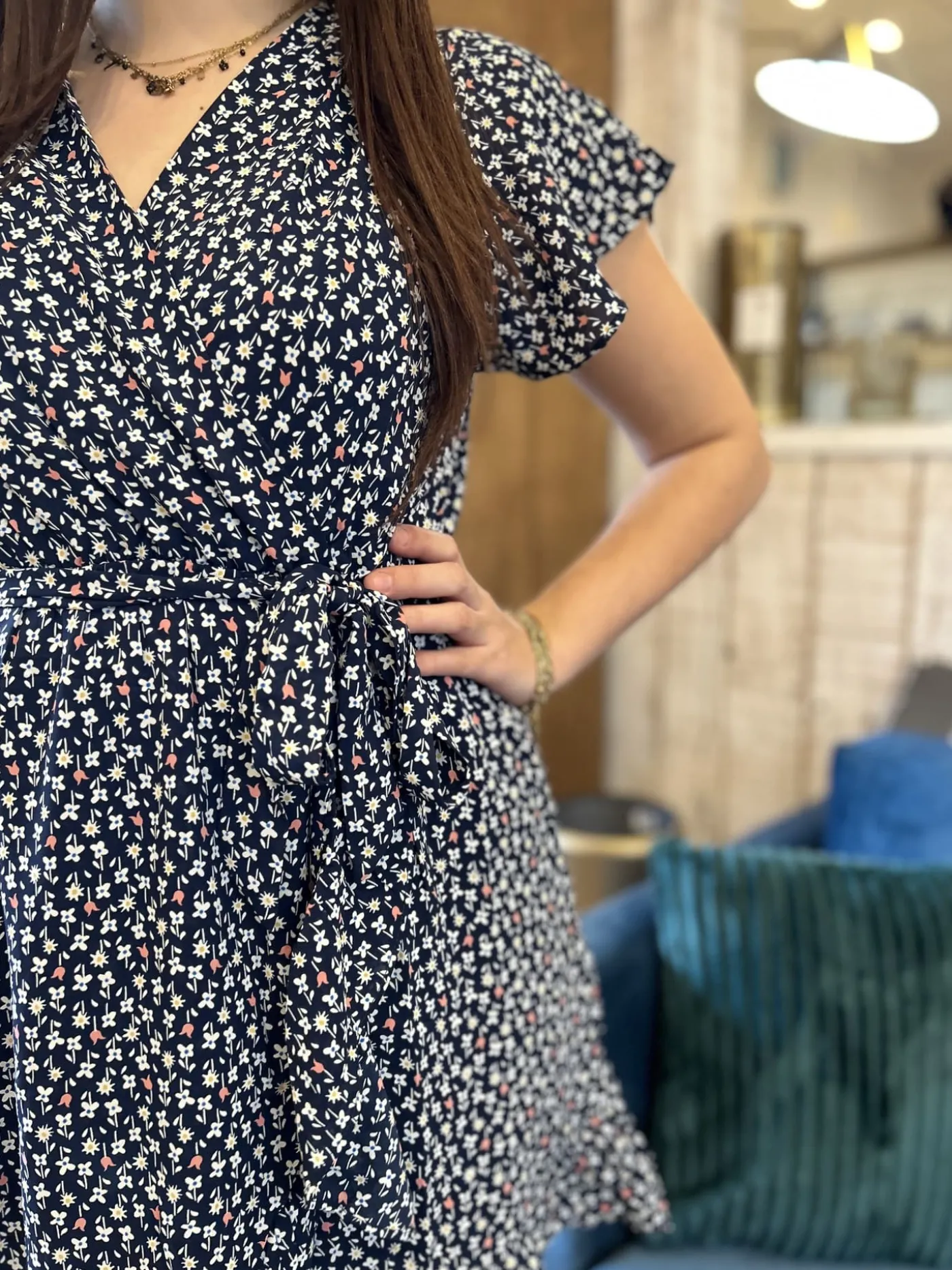 - Robe courte à mc col cache cœur – ceinture à la taille – imprimé