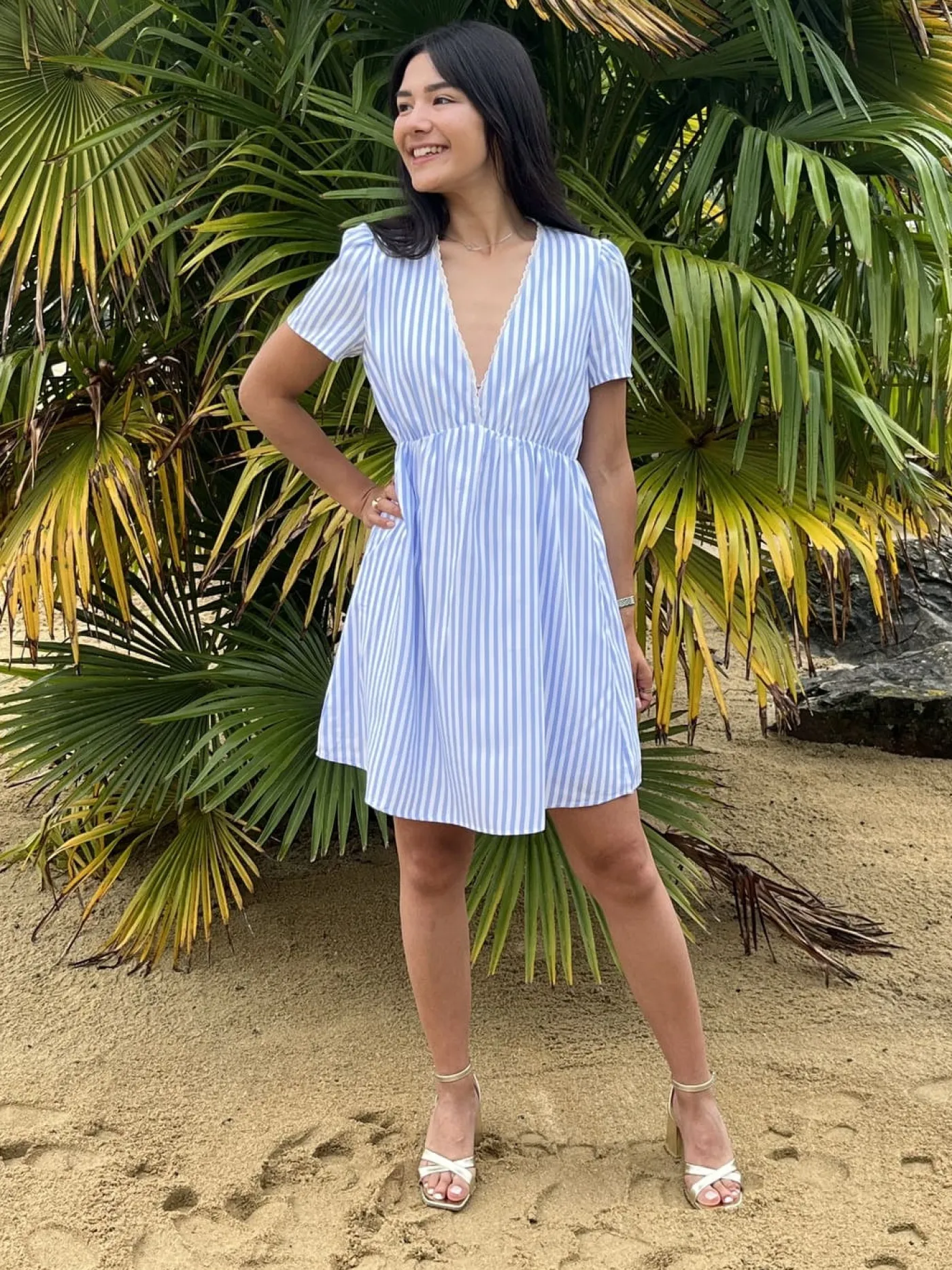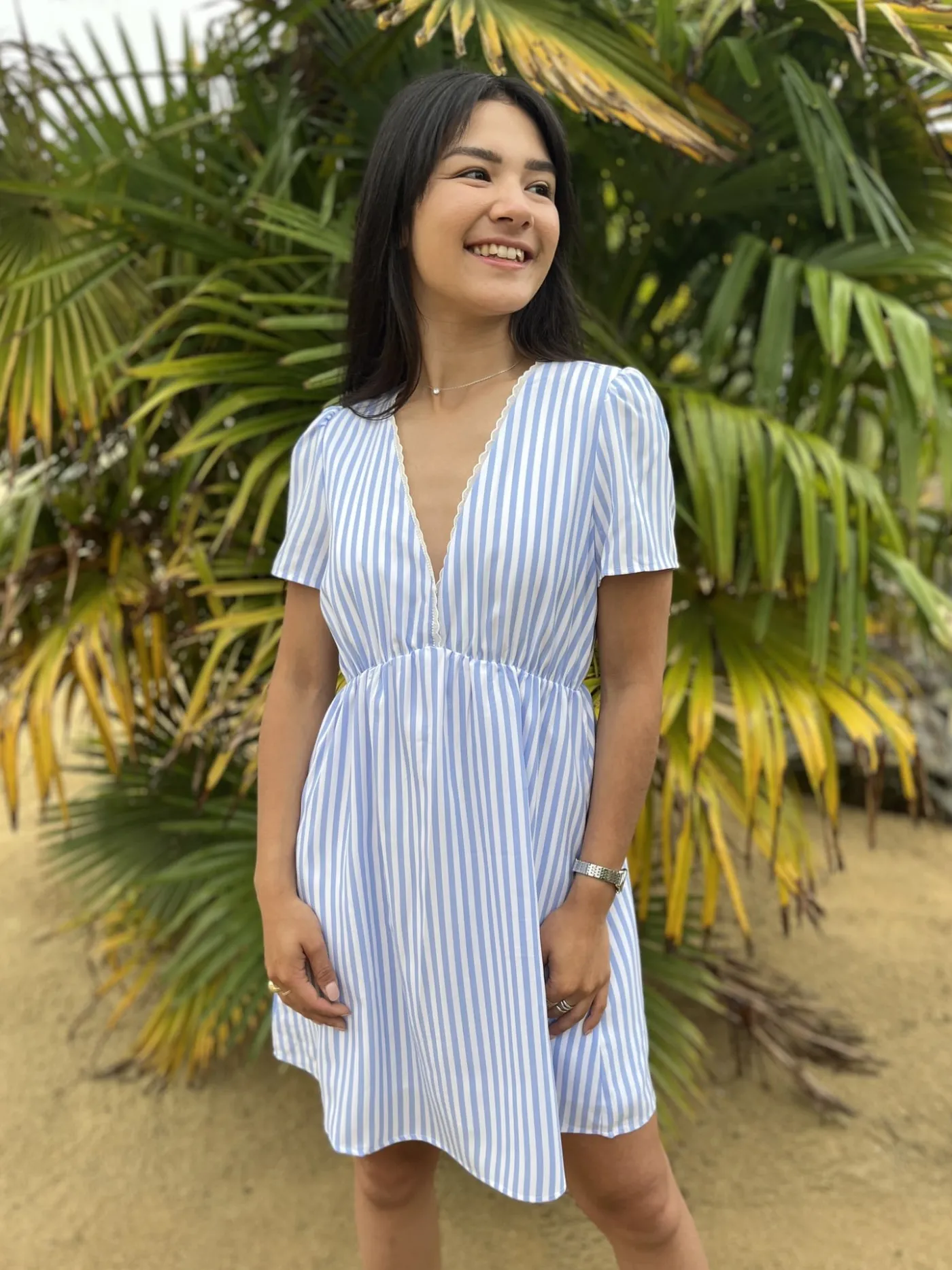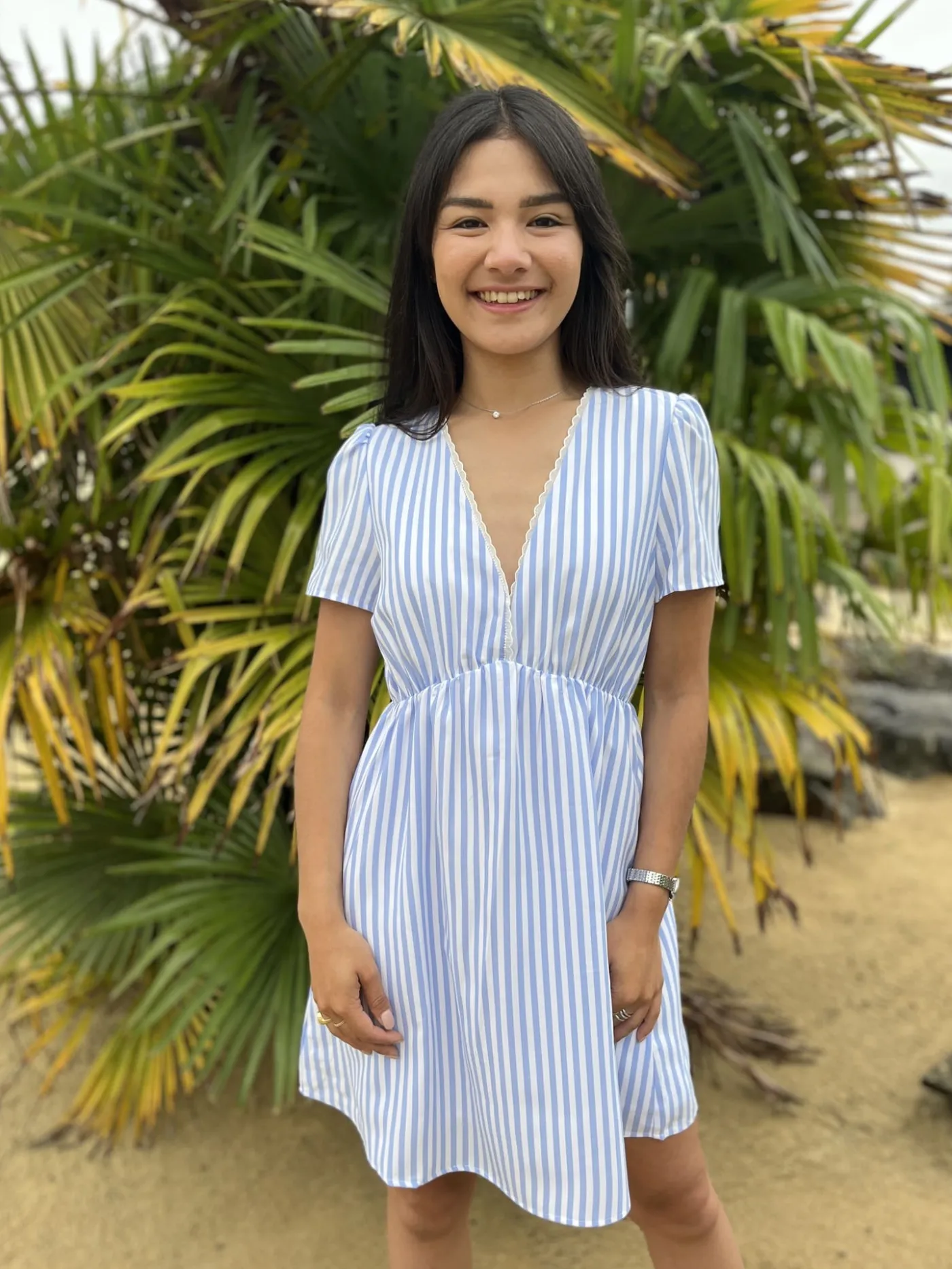 ROBE COURTE COL V MC – RAYURES BLANCHES ET BLEUTaille : Mathilde mesure 1m65. Elle porte la taille S pour ce modèle. N…