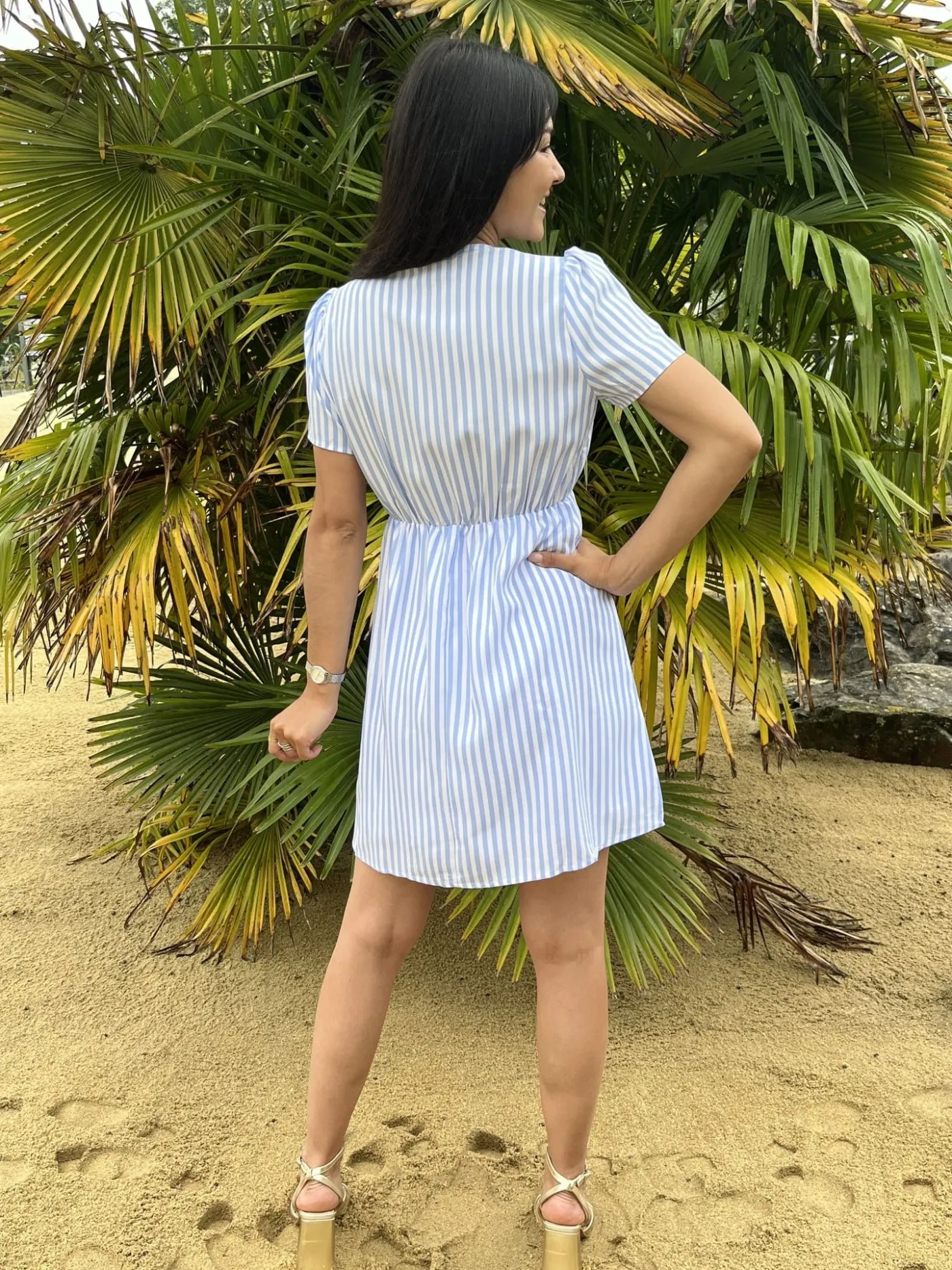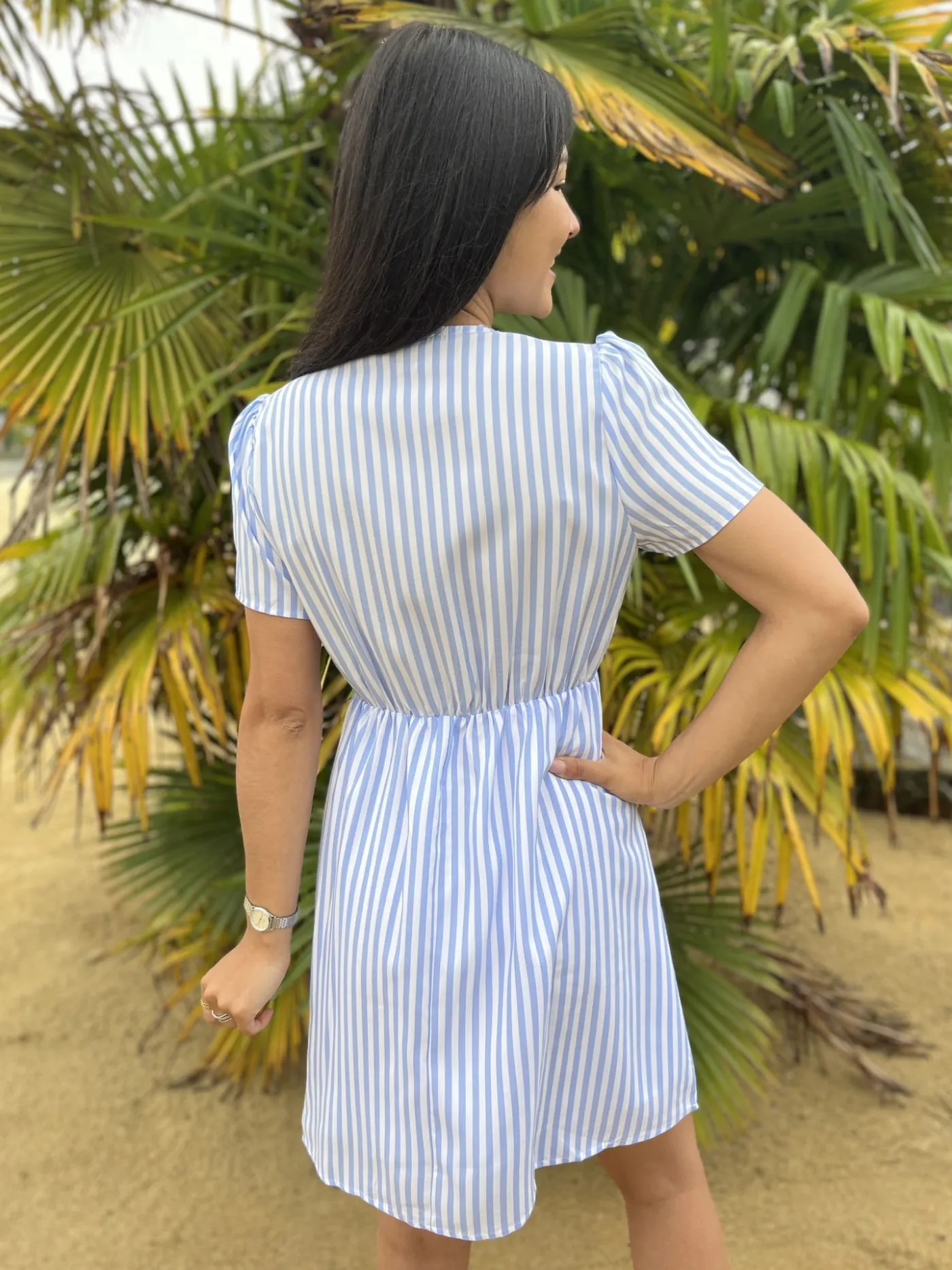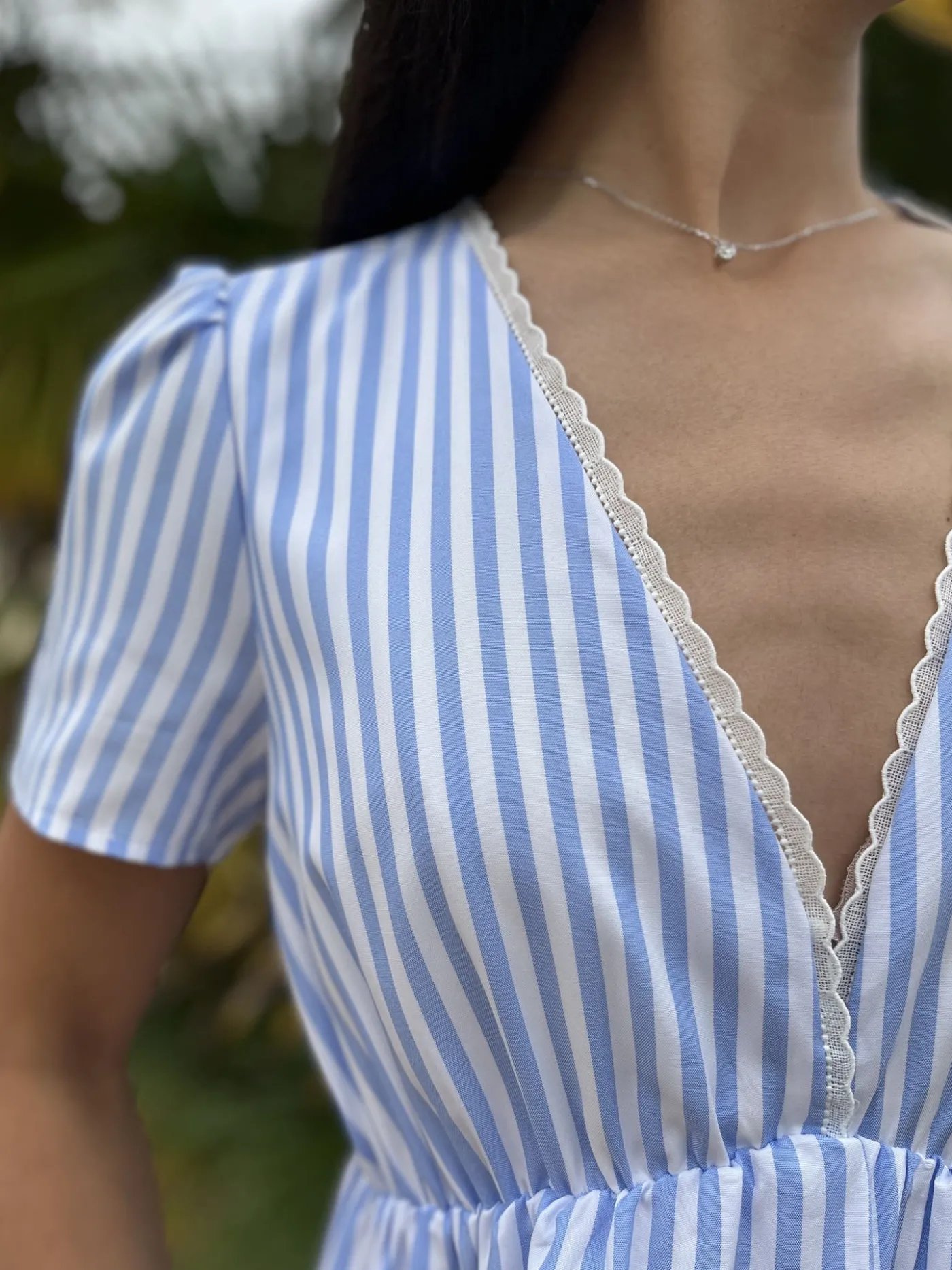 ROBE COURTE COL V MC – RAYURES BLANCHES ET BLEUTaille : Mathilde mesure 1m65. Elle porte la taille S pour ce modèle. N…