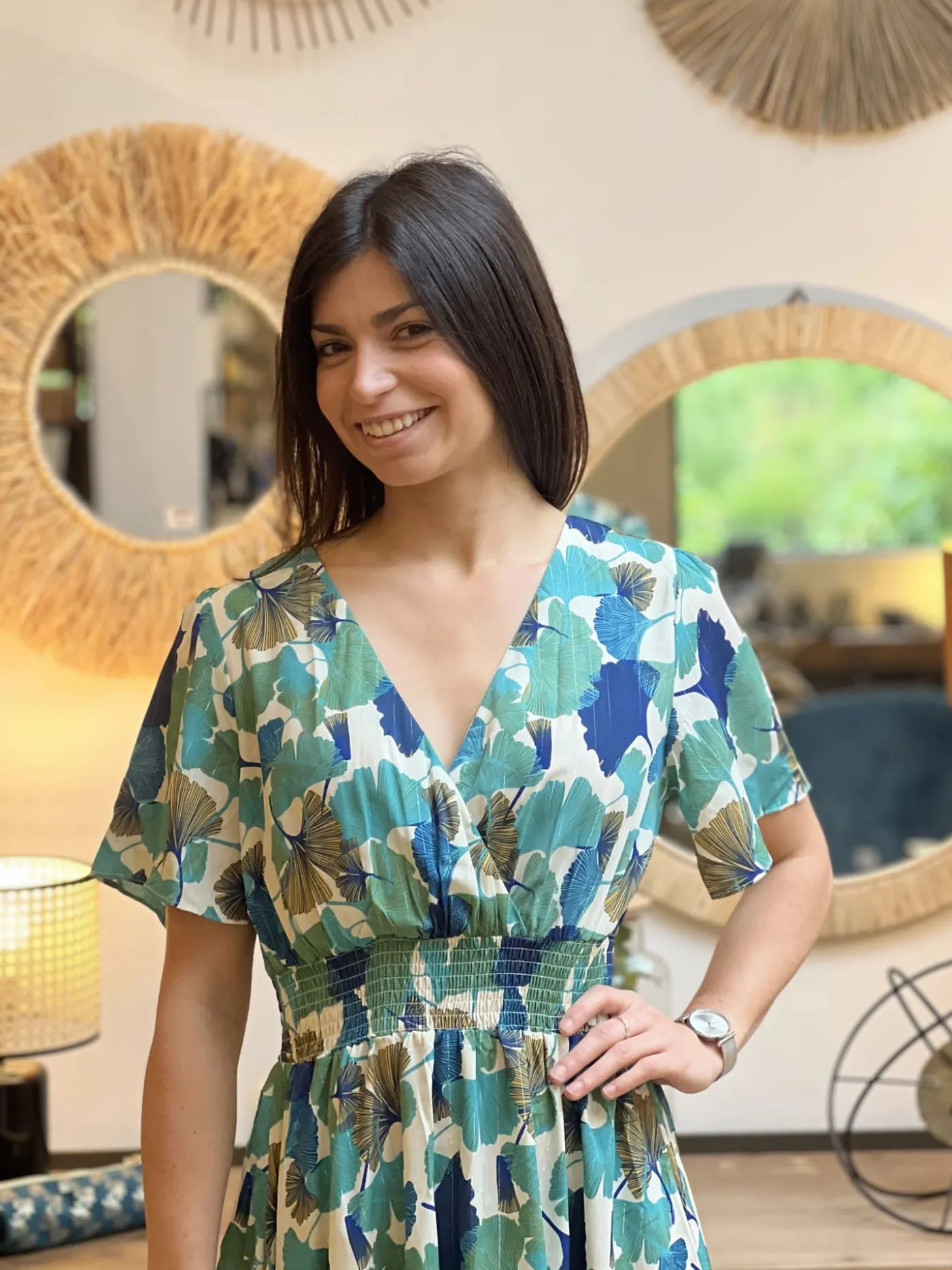 ROBE LONGUE MC IMPRIME FEUILLES FLEURSTaille : Justine mesure 1m69. Elle porte la taille S/M pour ce modèle. Taille…
