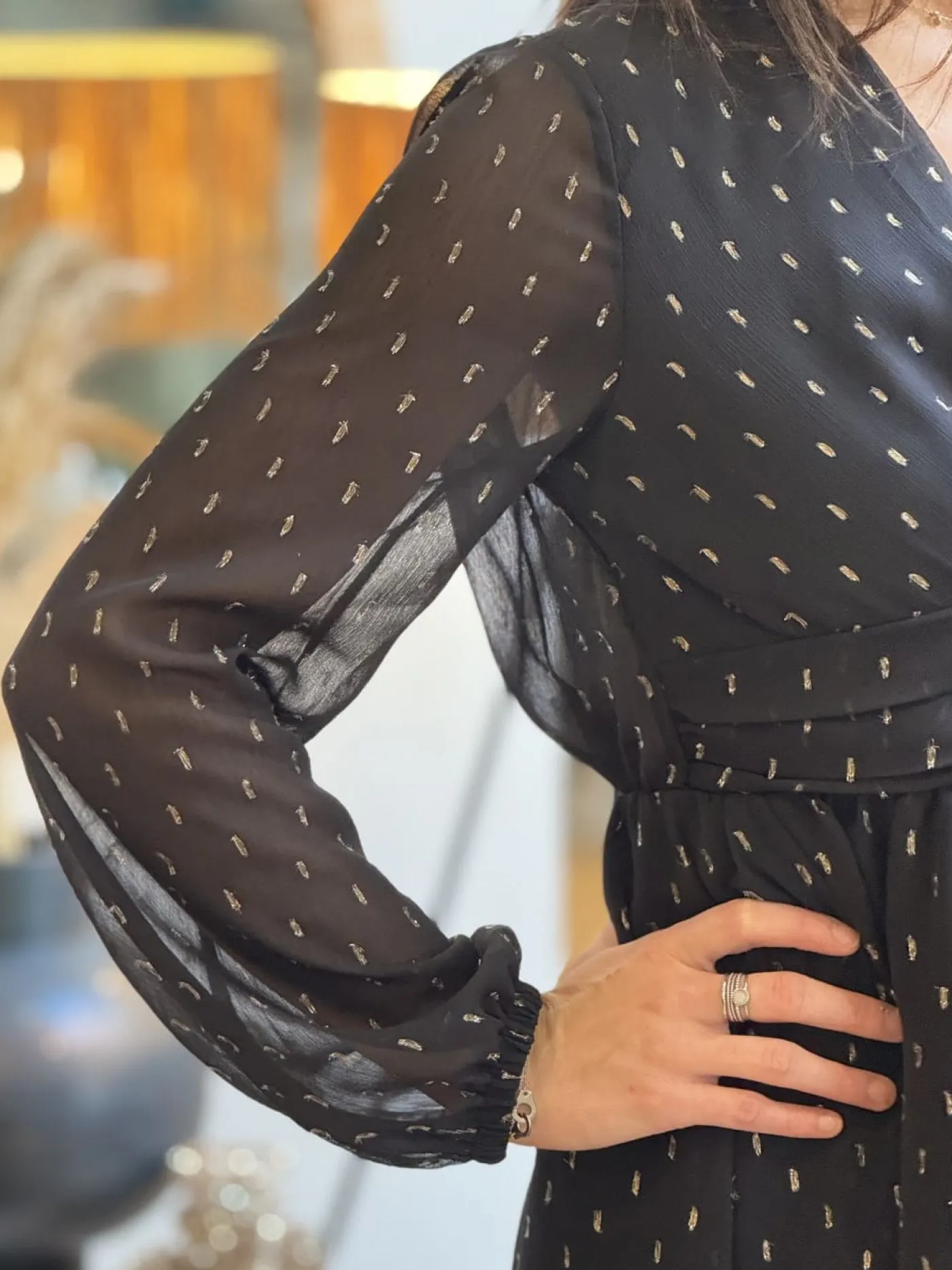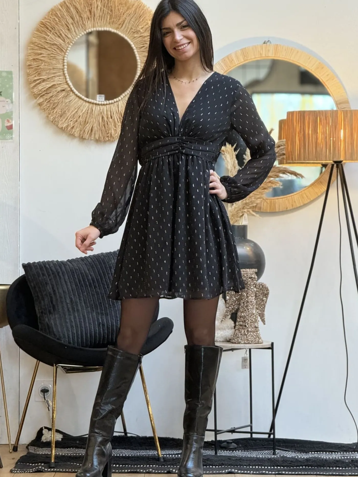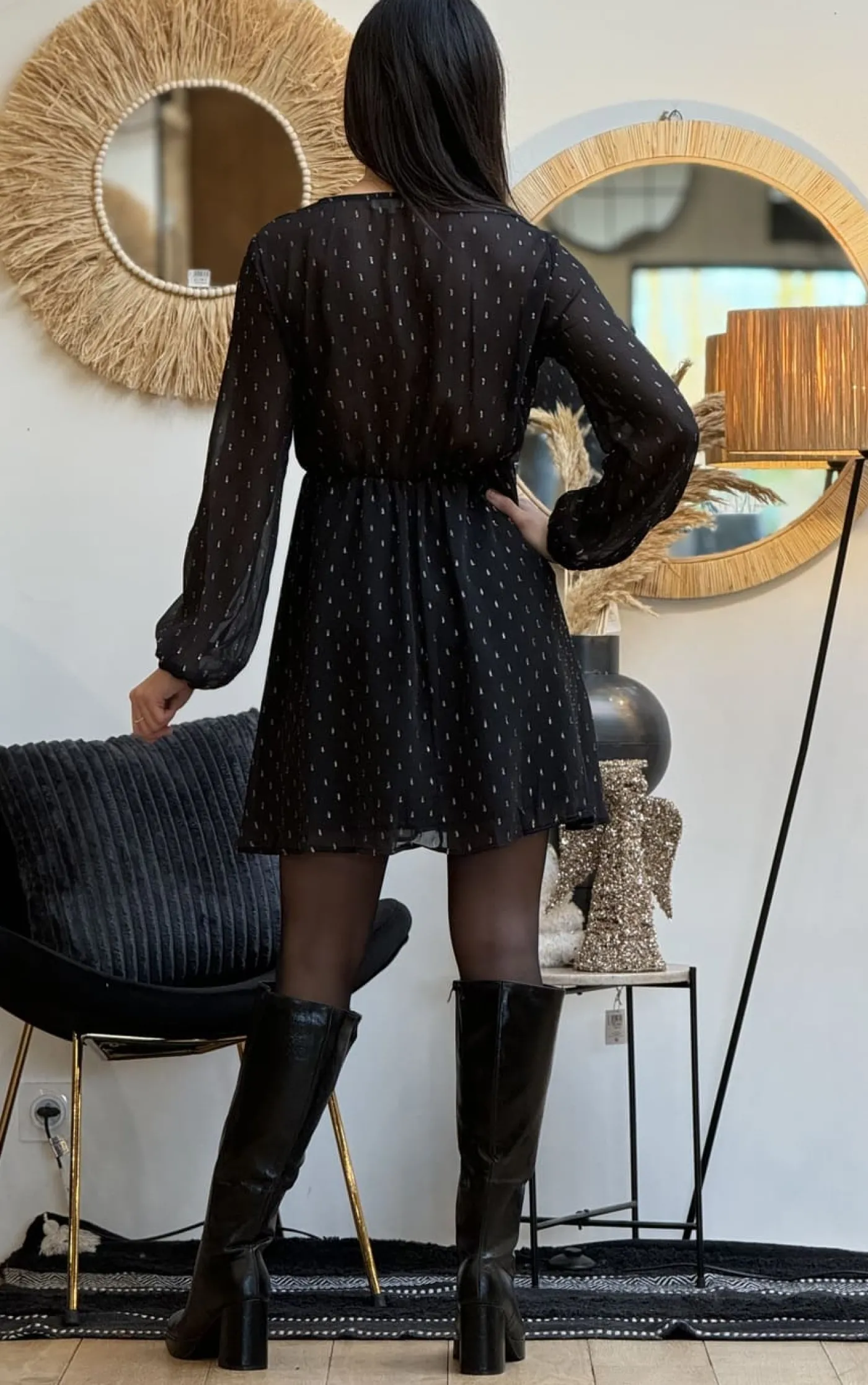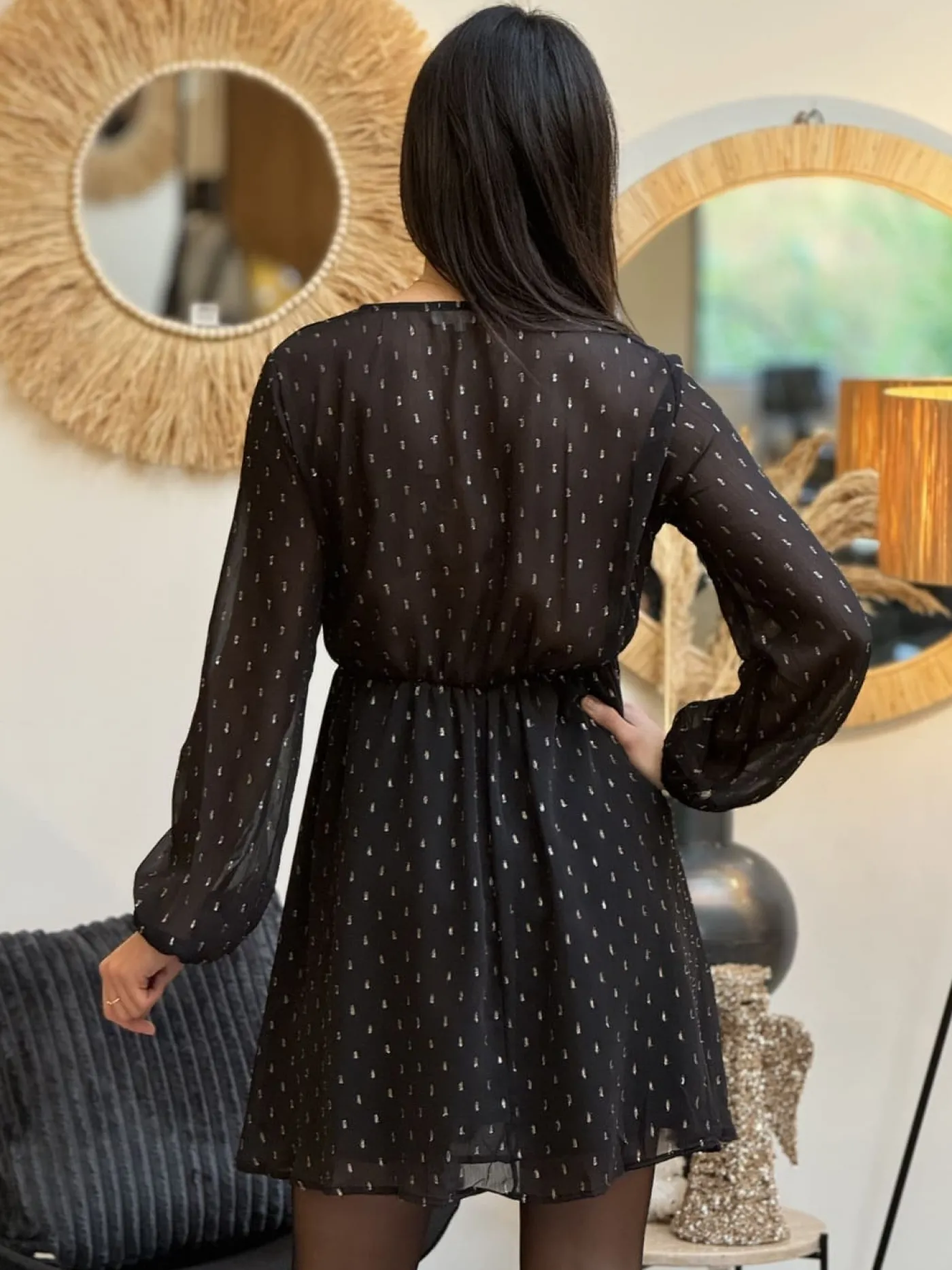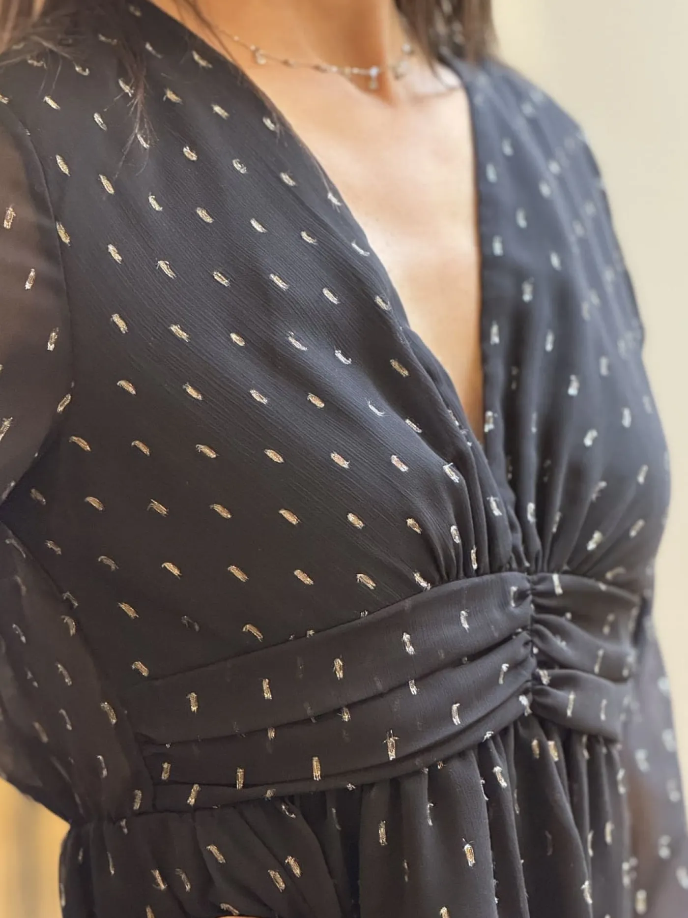- Robe courte à ml col v plongeant resserré à la taille imprimé pastille gold