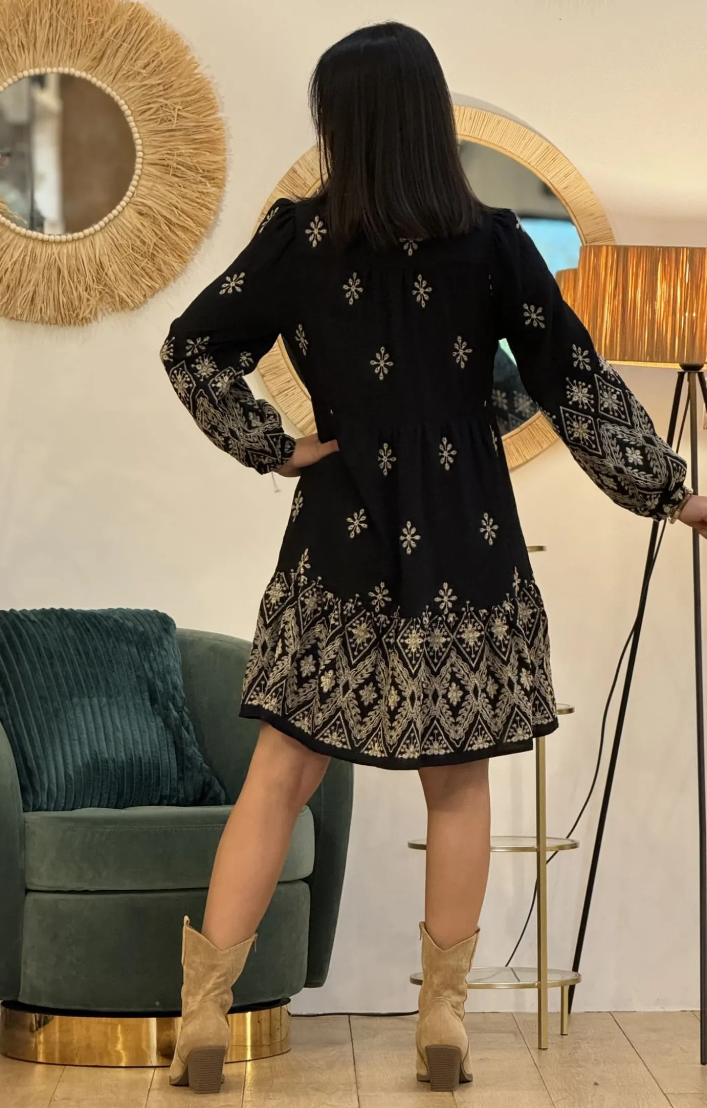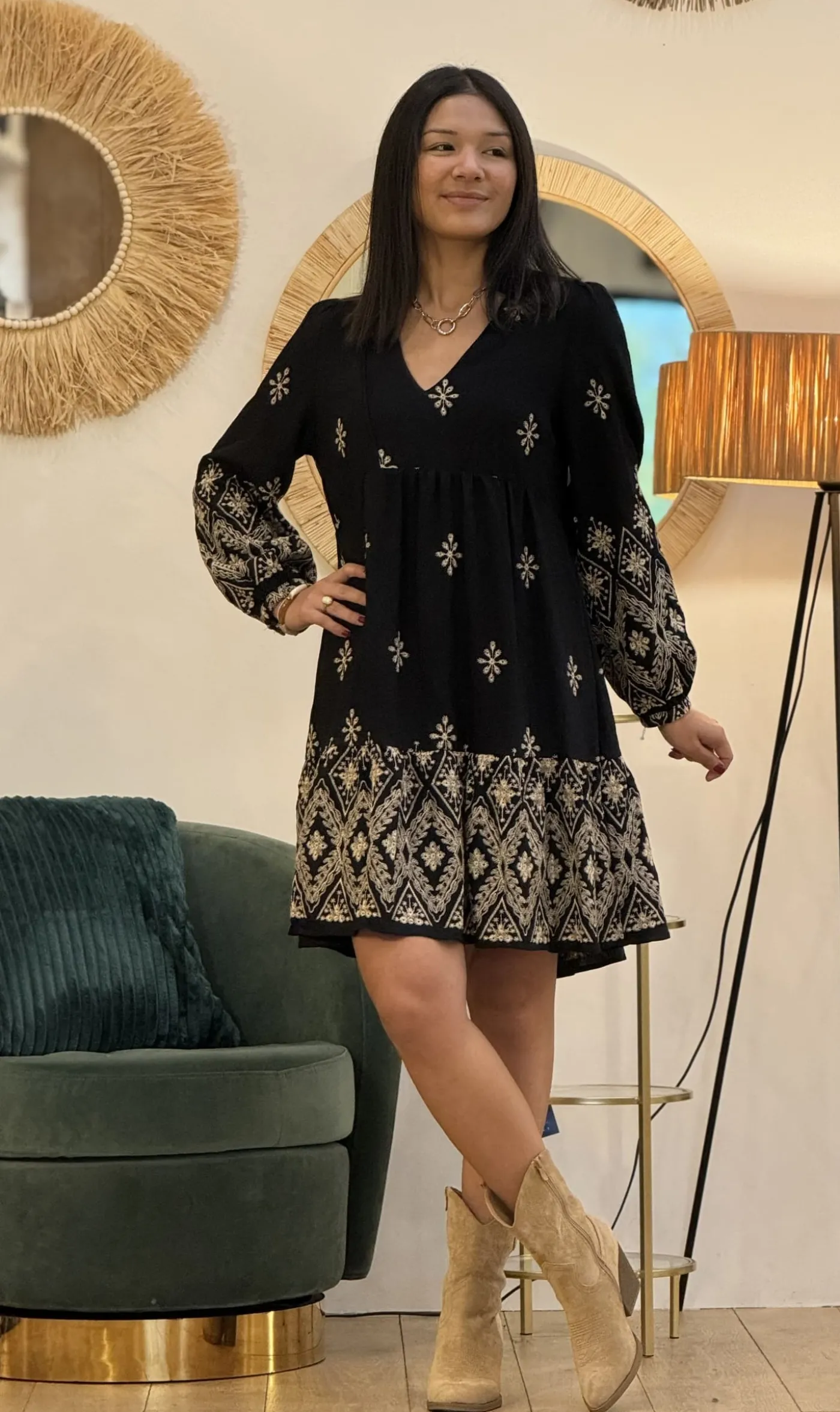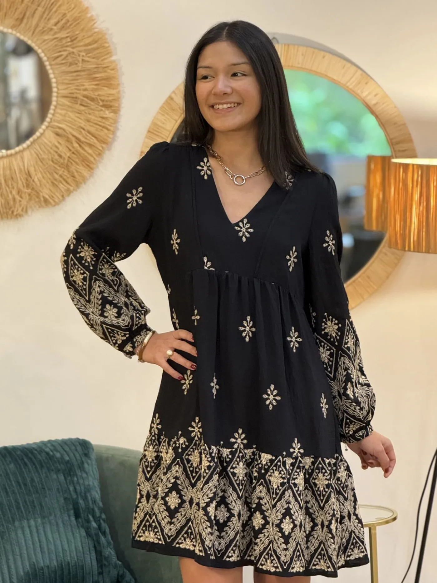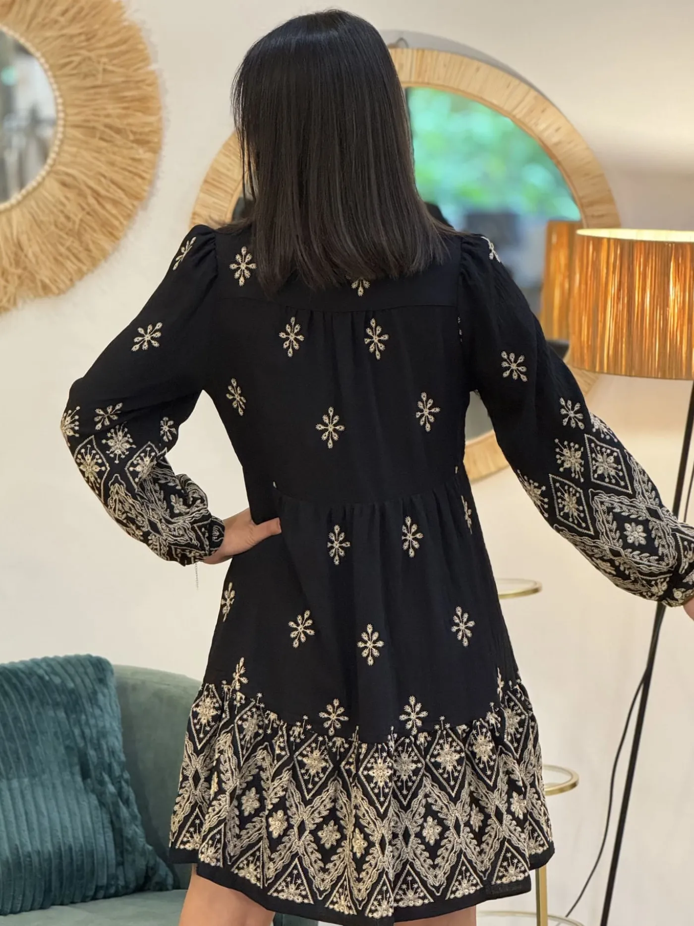 Robe courte style babydoll col v – imprimé flocon de fleurTaille : Mathilde mesure 1m65. Elle porte la taille S pour…