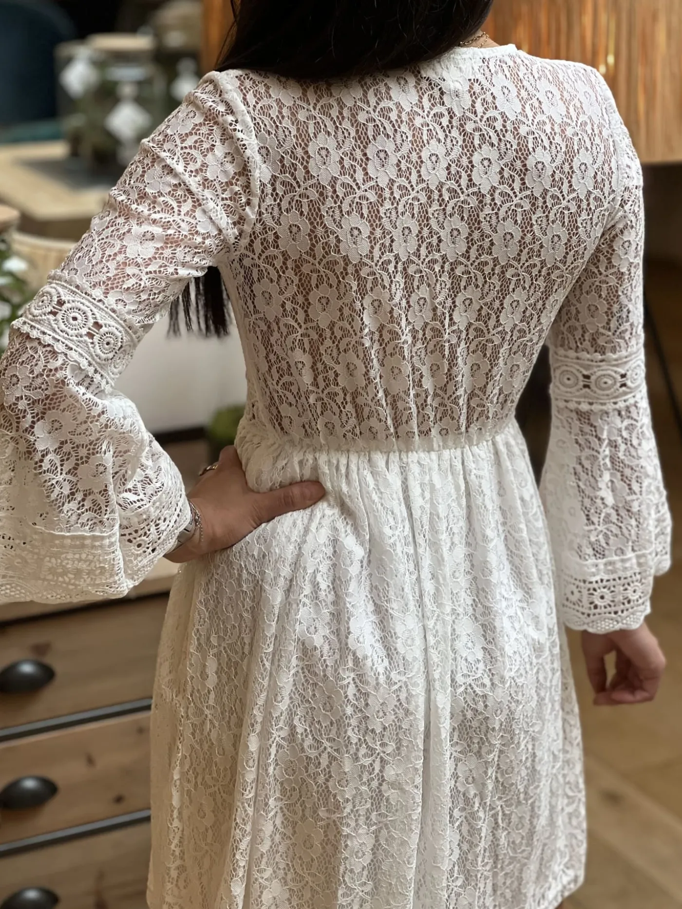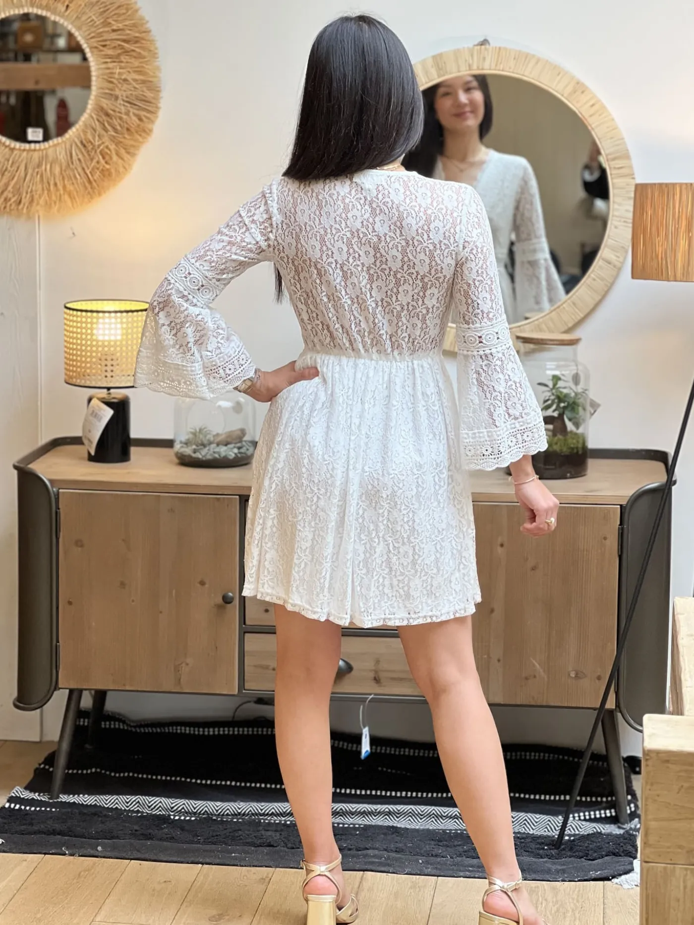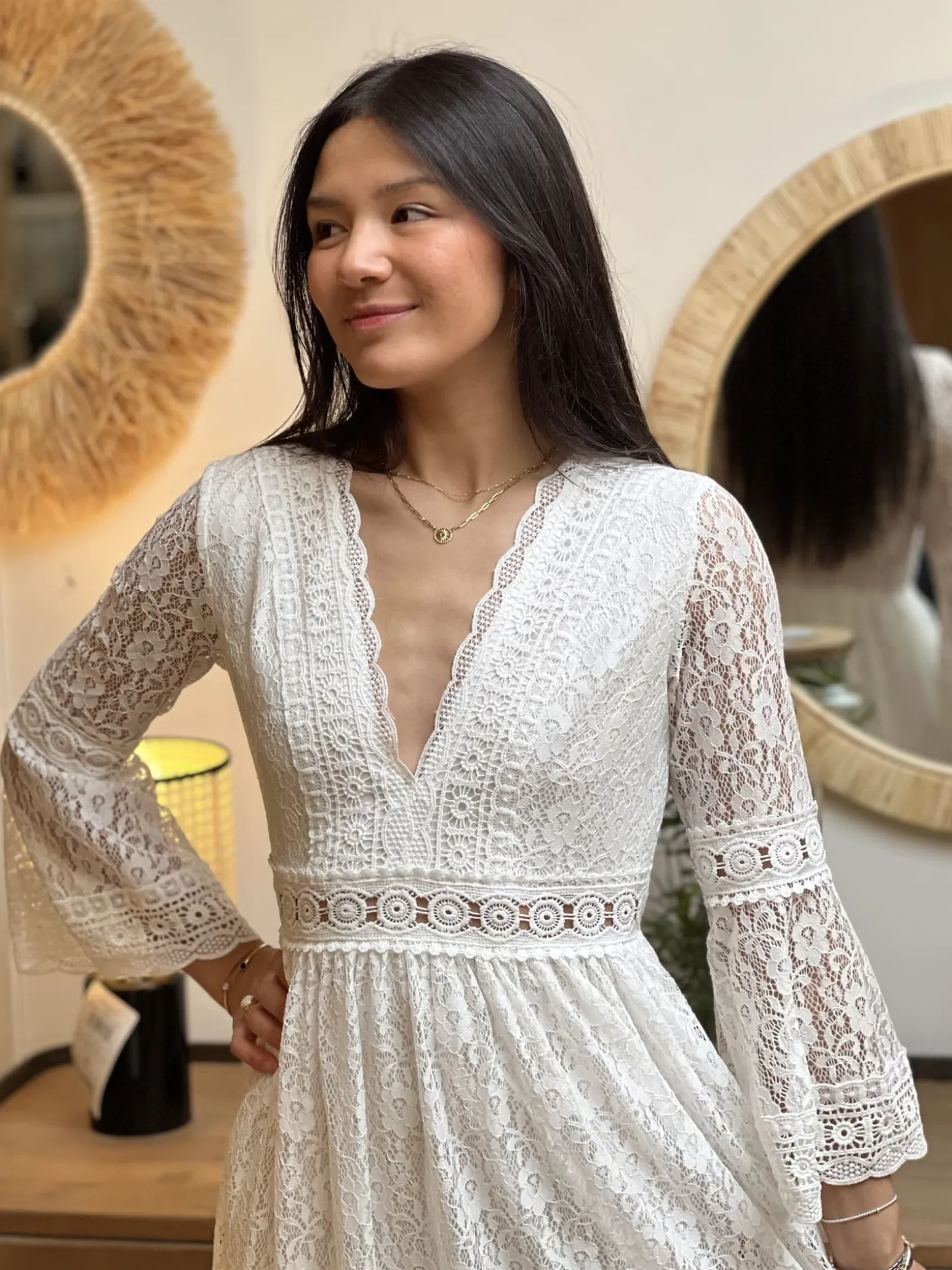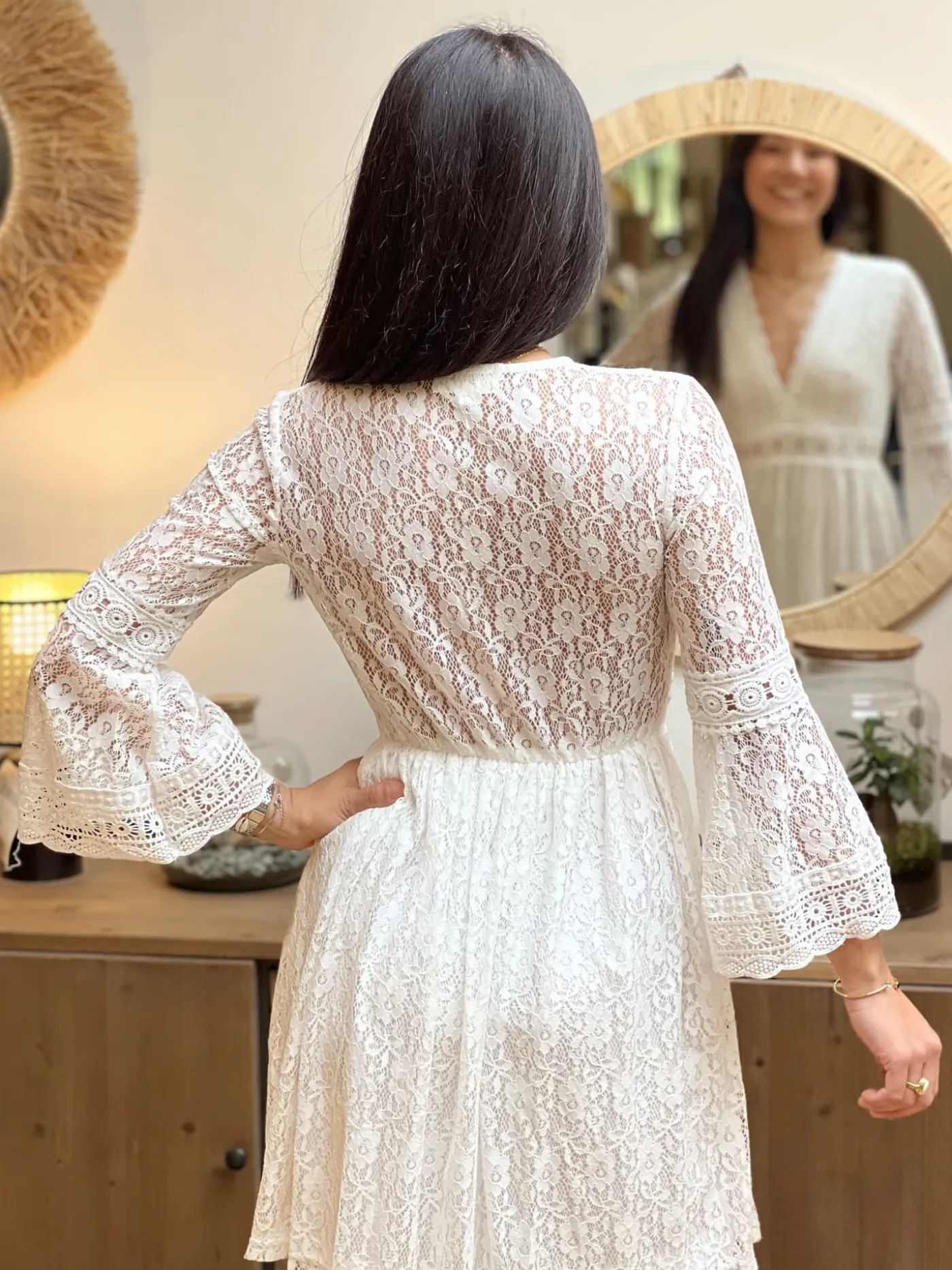 ROBE COURTE – COL V – ML – DENTELLE PARTOUT – BANDE SUR NOMBRIL AJOURÉETaille : Juliette mesure 1m63. Elle porte la ta…