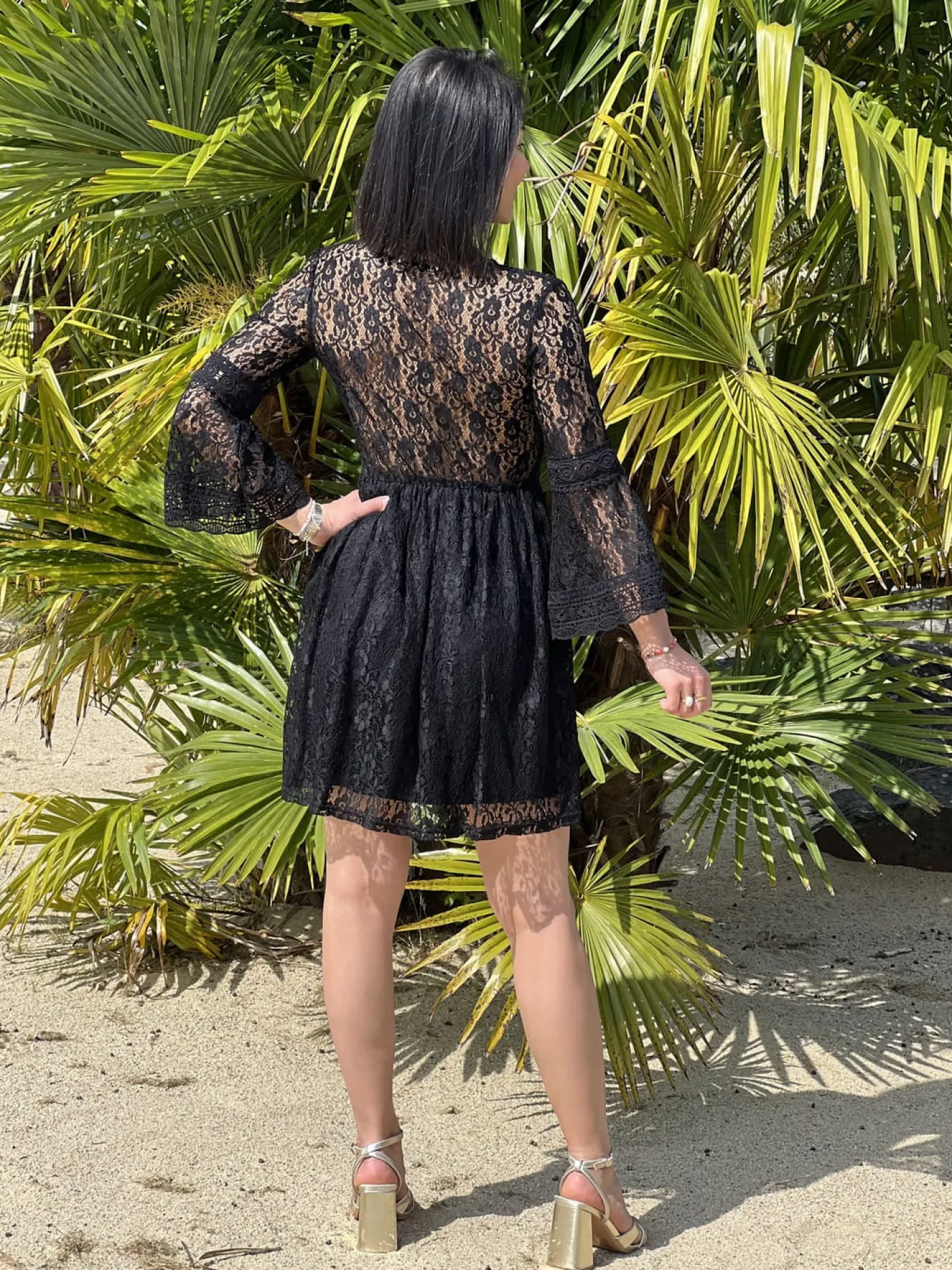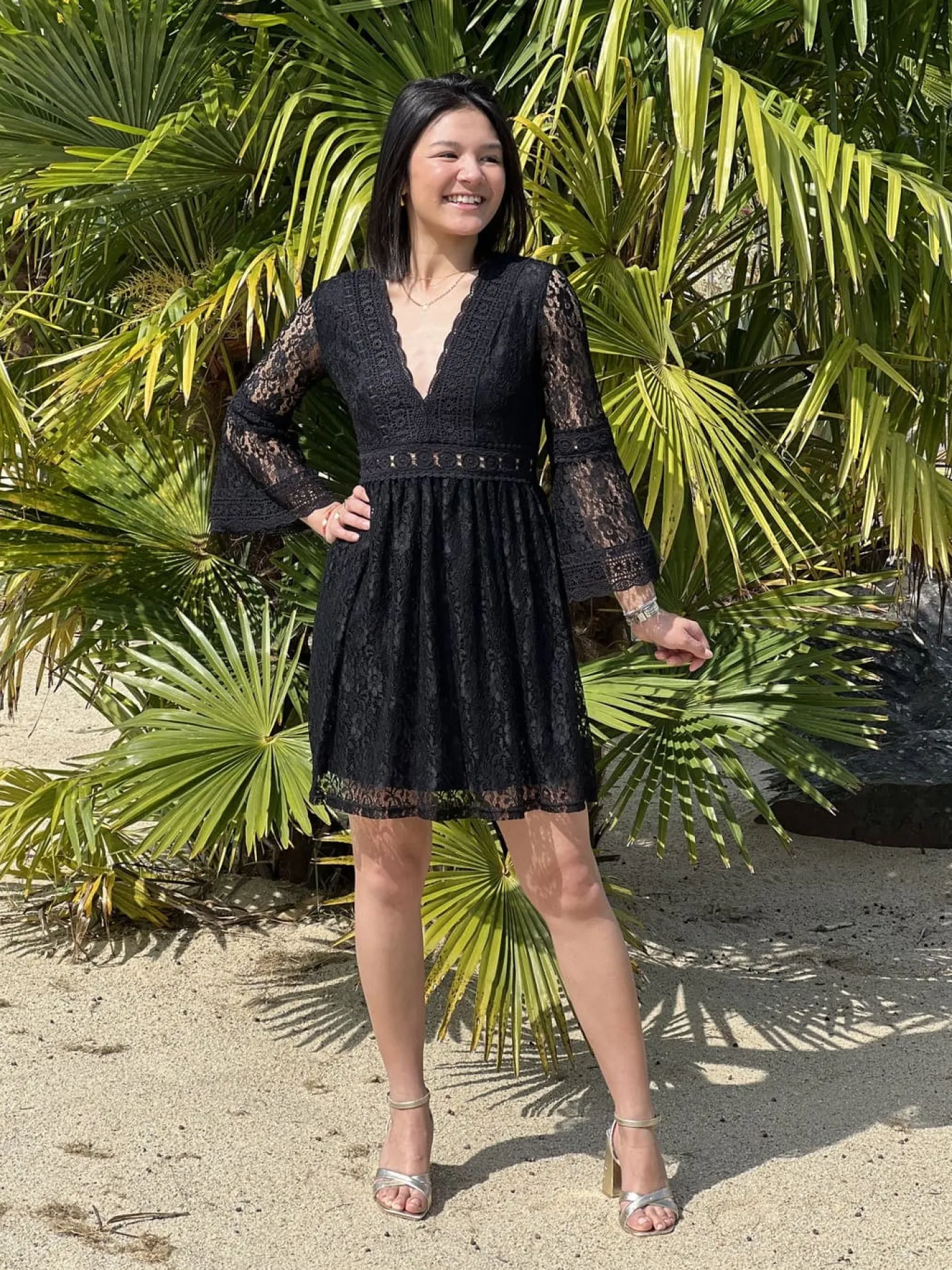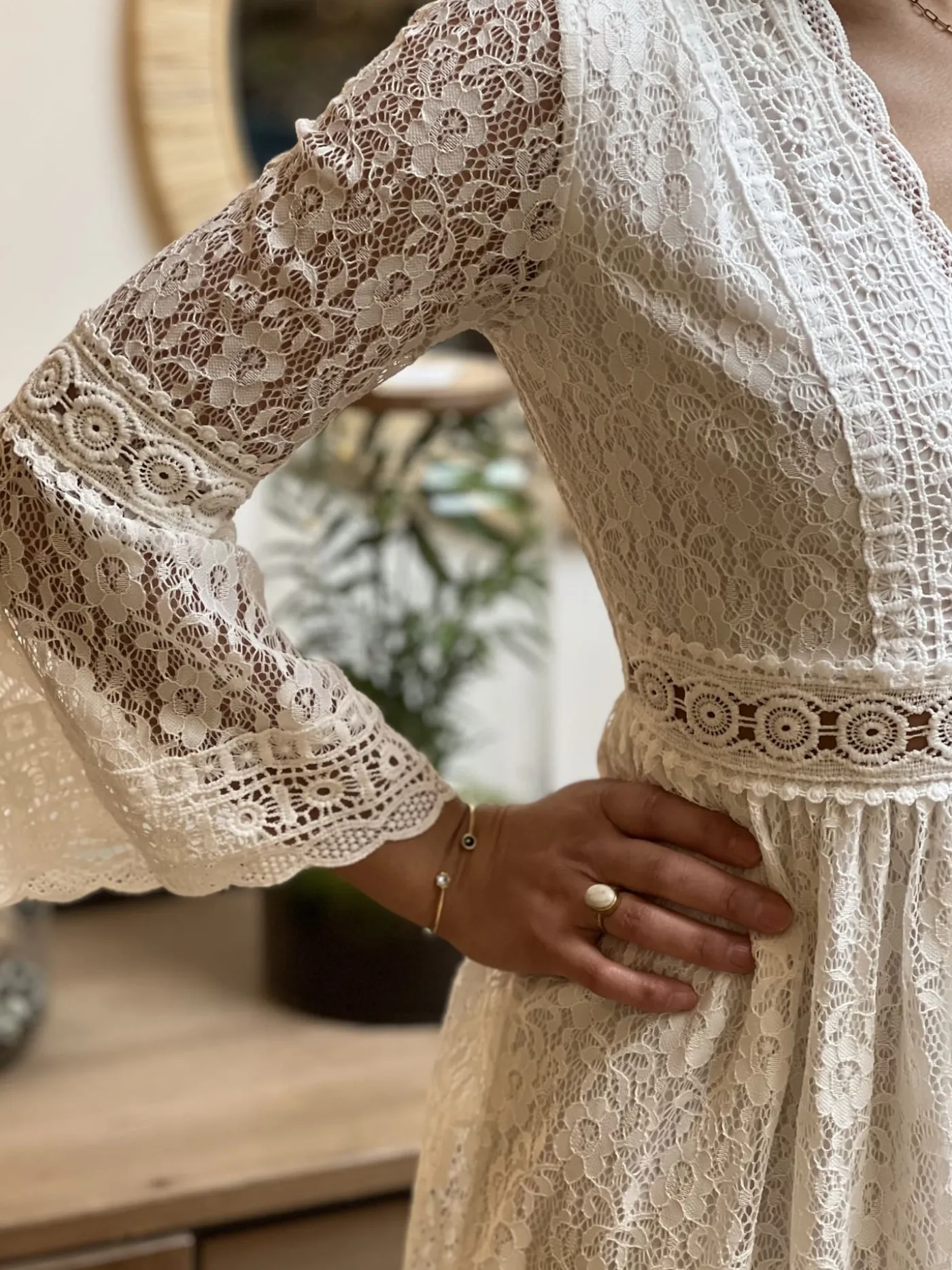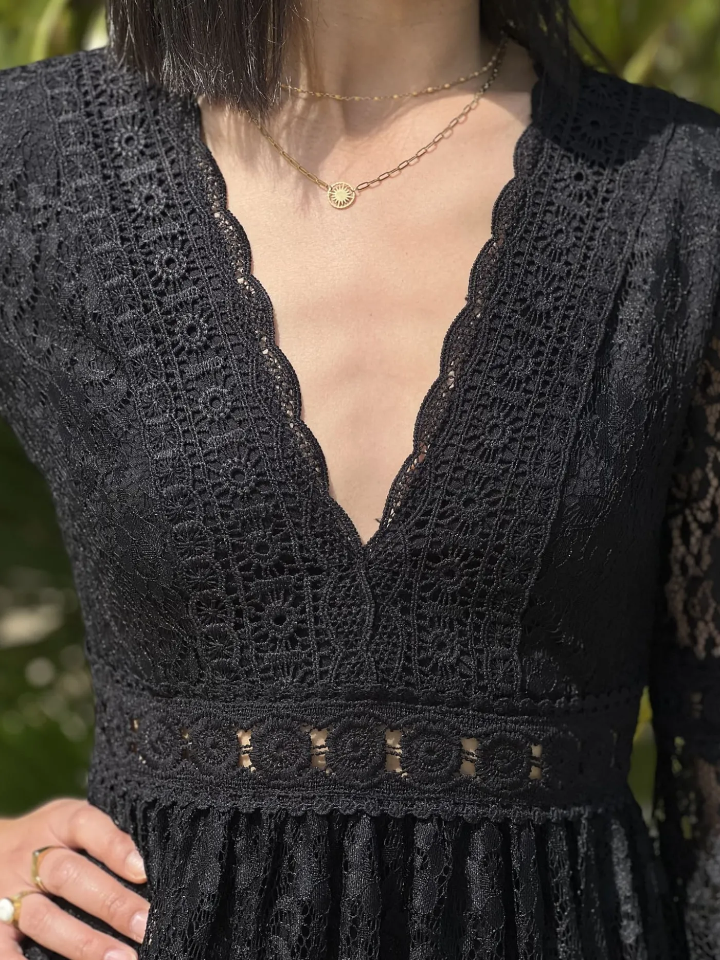 ROBE COURTE – COL V – ML – DENTELLE PARTOUT – BANDE SUR NOMBRIL AJOURÉETaille : Juliette mesure 1m63. Elle porte la ta…