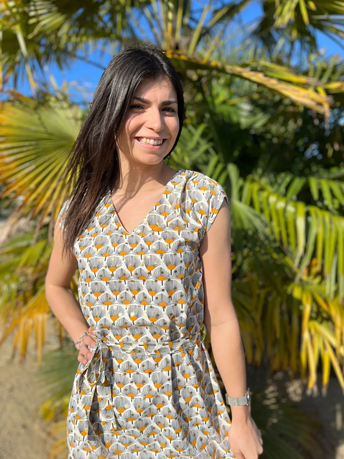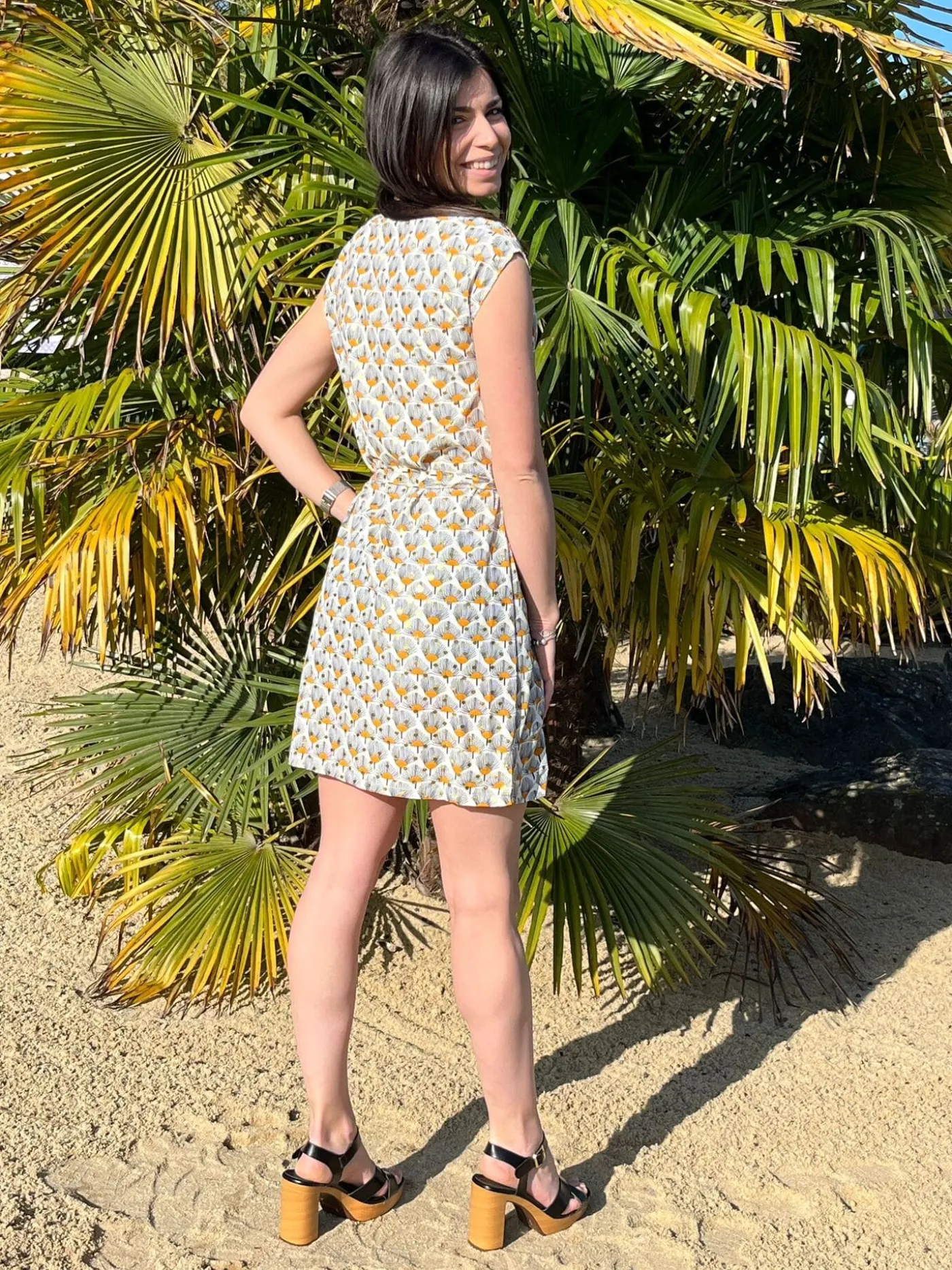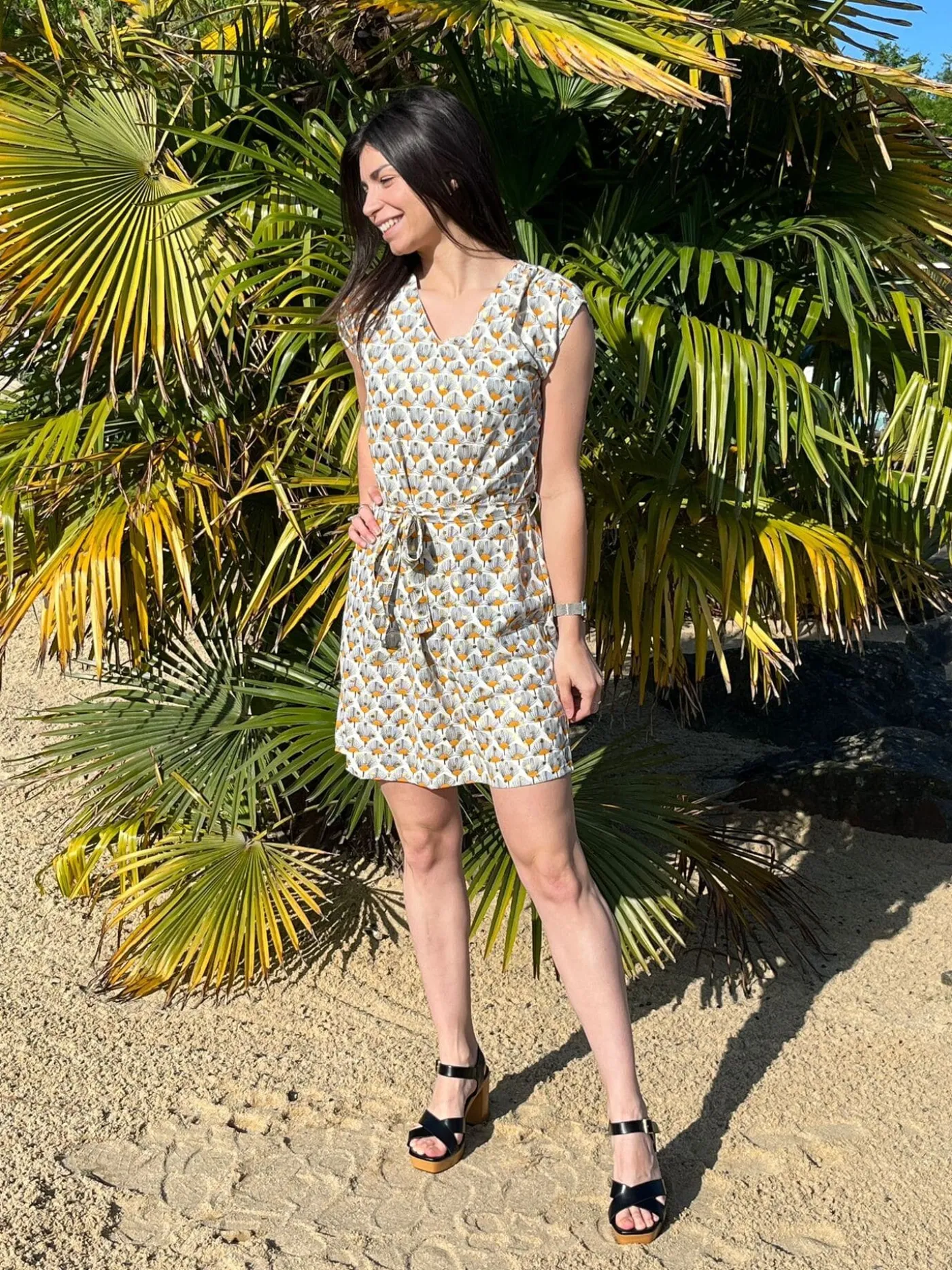 Robe courte à mc col v liseret dore – imprimé paon + pastille dore – ceinture à la tailleTaille : Justine mesure 1m…