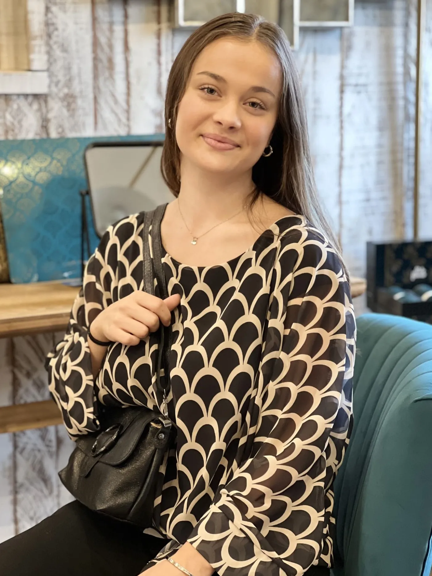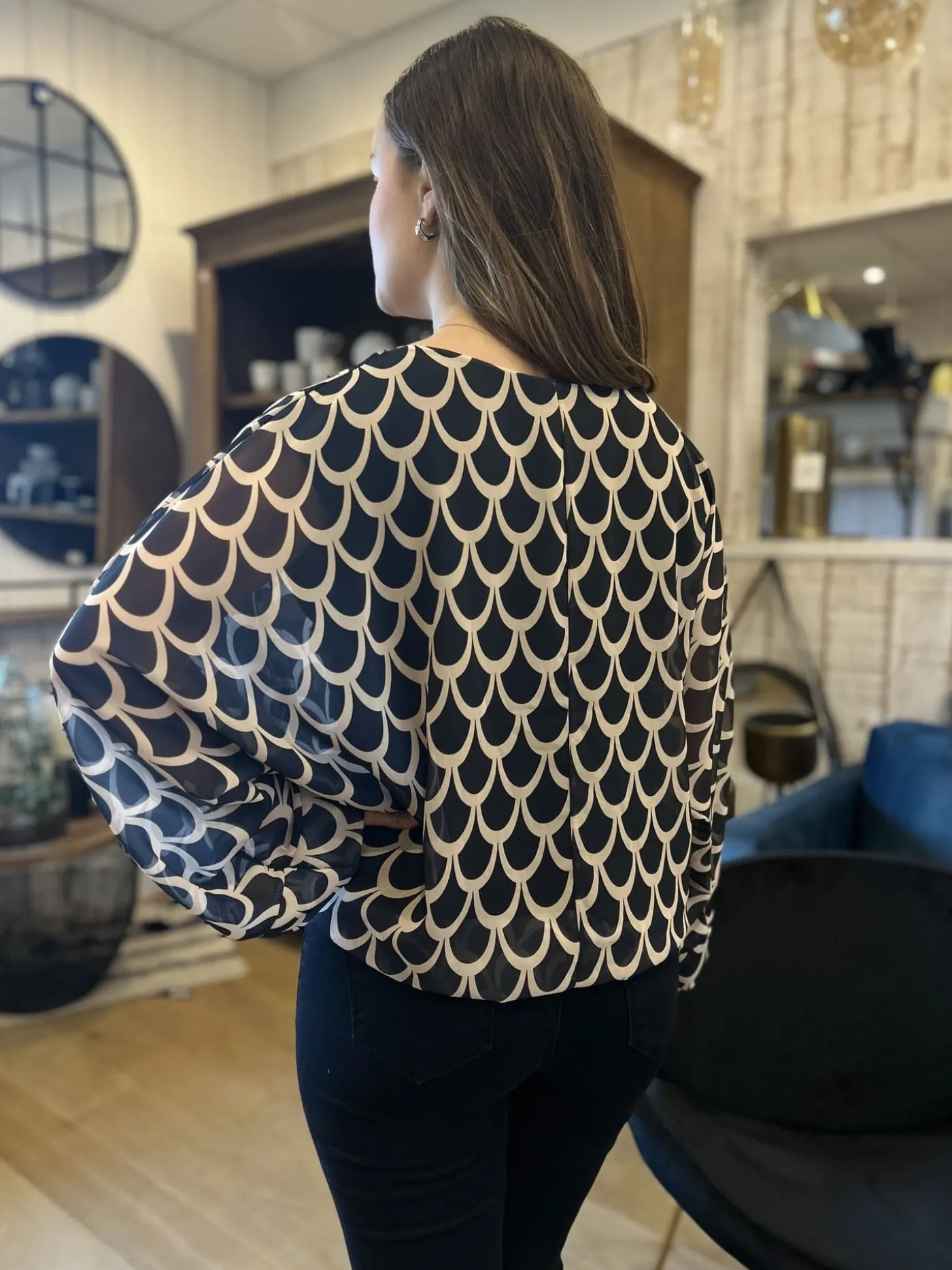 CHEMISE A ML COL ROND – IMPRIME ECAILLES + PETIT NŒUD EN BASTaille :Juliette mesure 1m63. Elle porte la taille Taille …