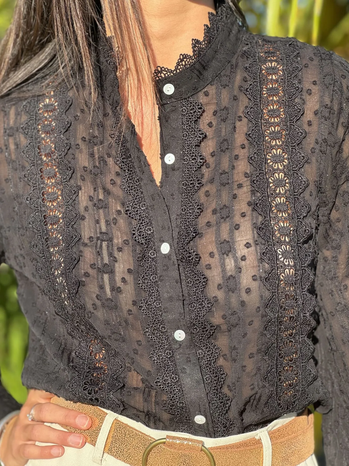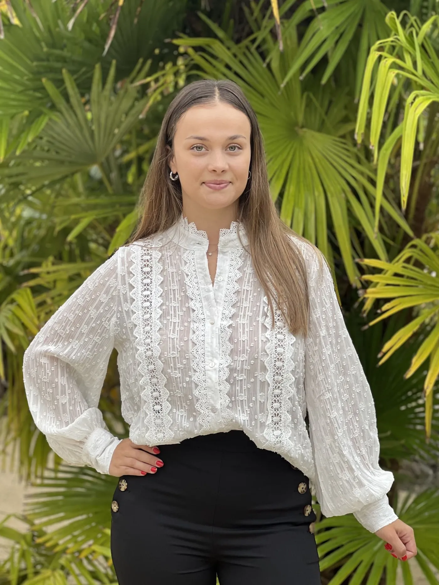 CHEMISIER À MANCHE LONGUE À DENTELLE – MANCHE RESSERRÉ AU BOUTTaille : Justine mesure 1m69 et Juliette mesure 1m63. …