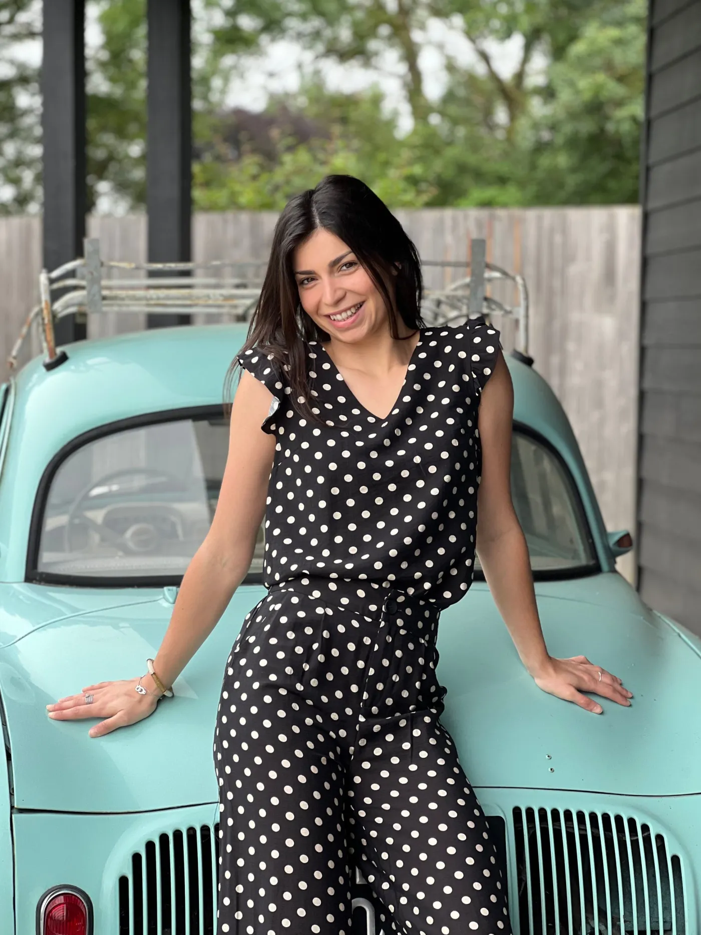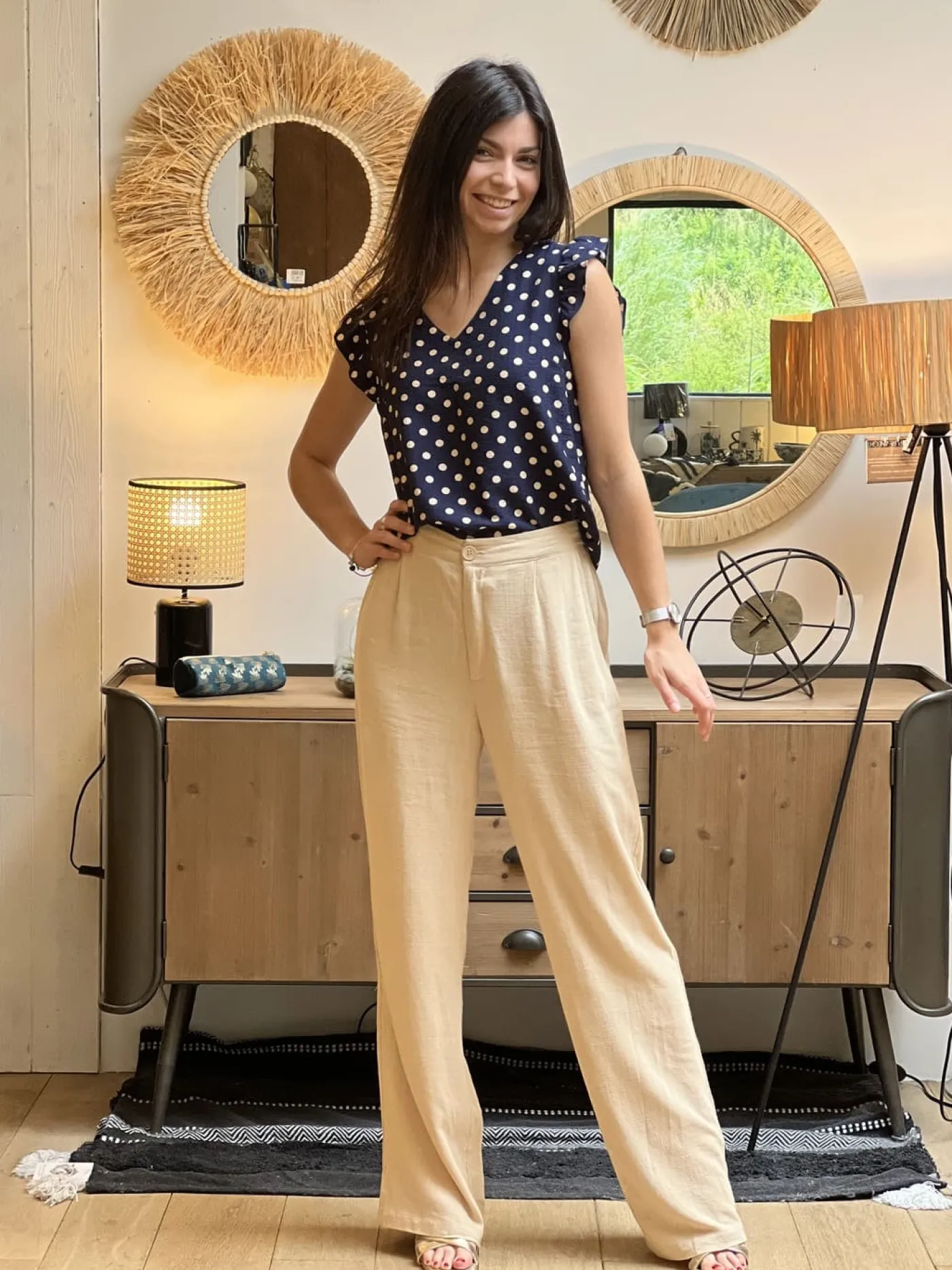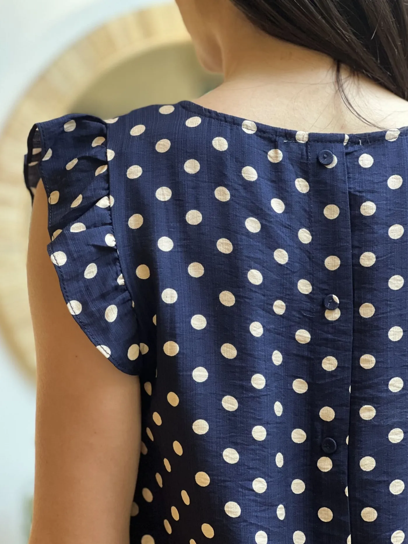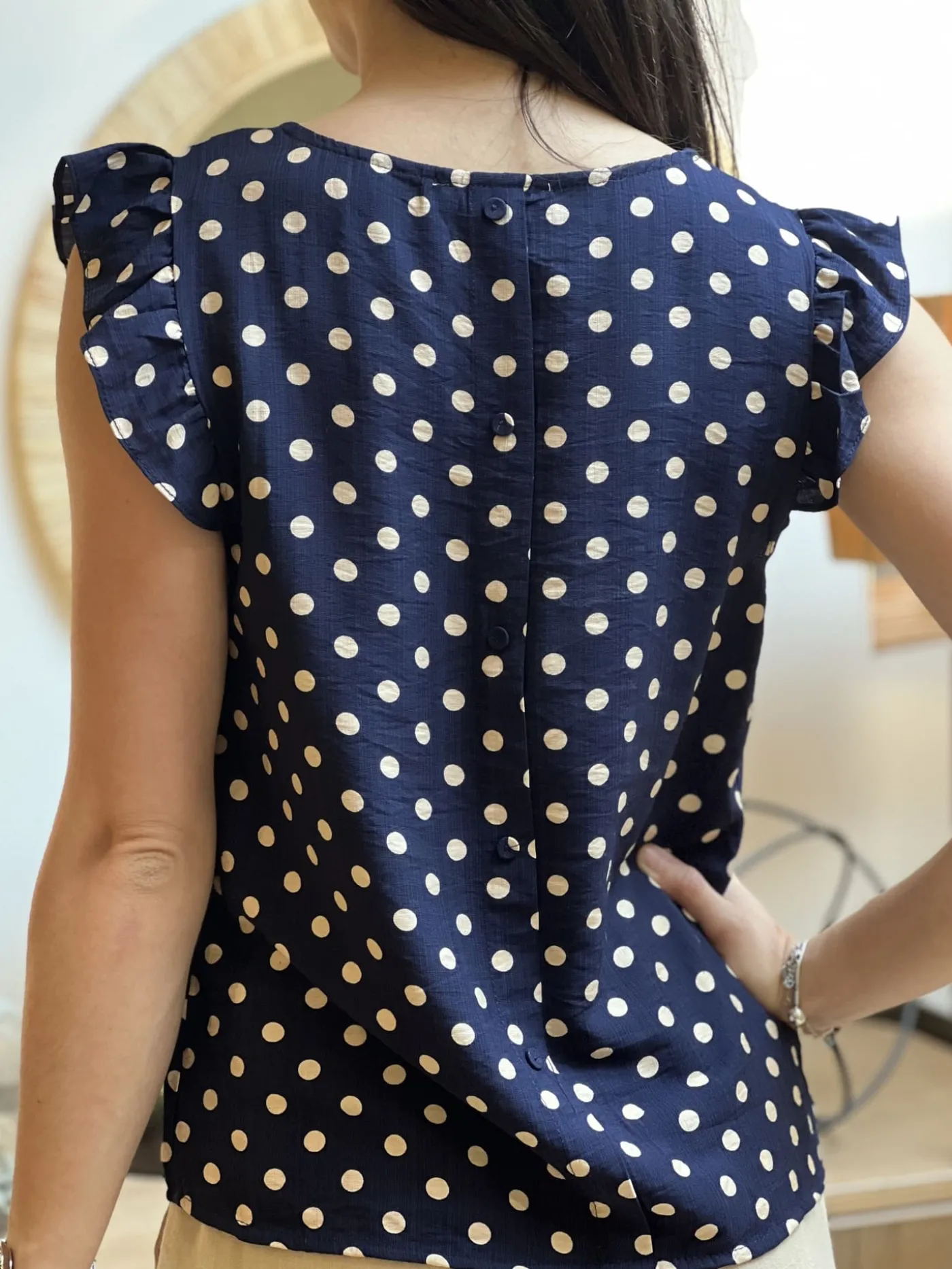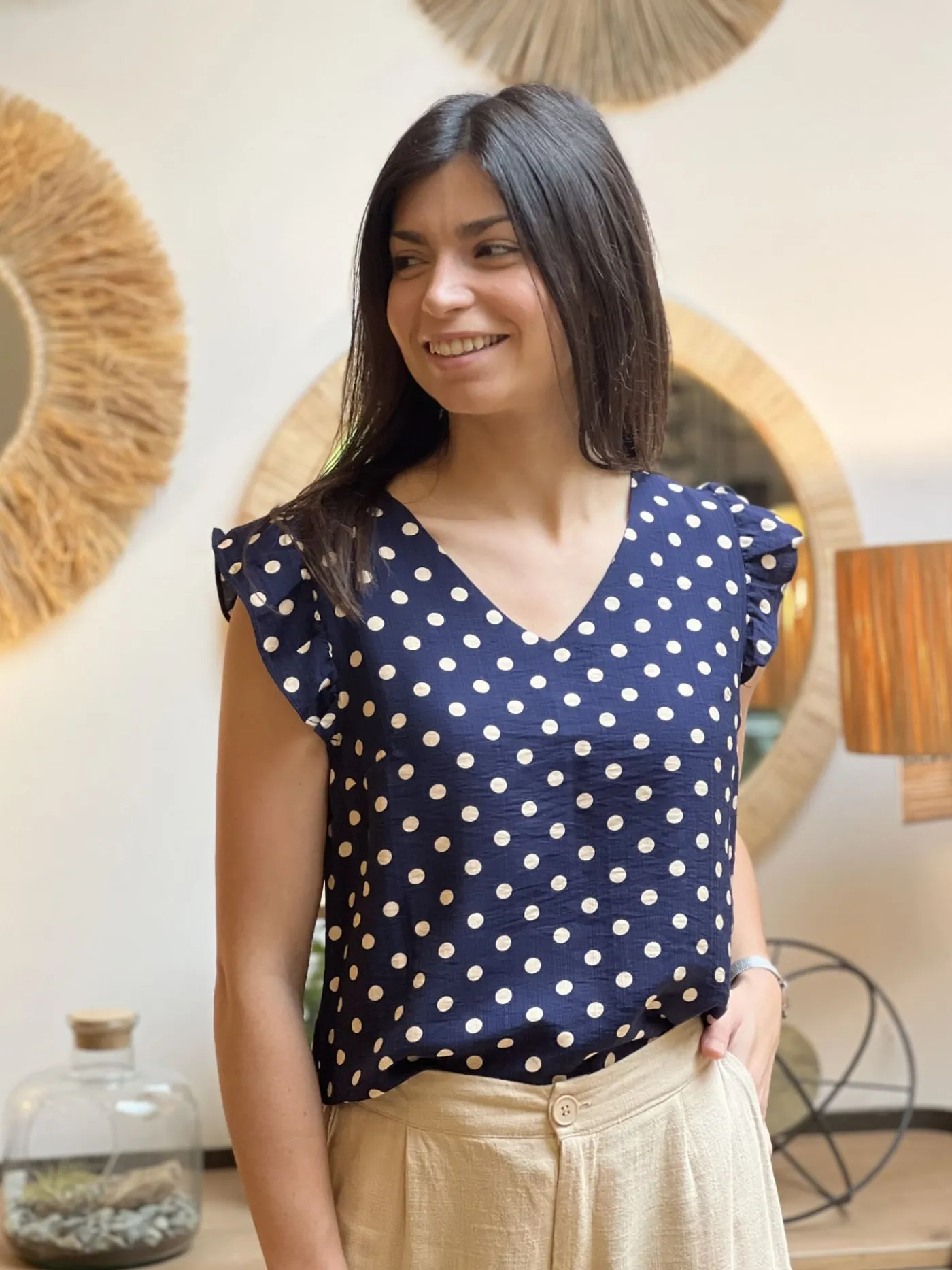 Top à mc froufrou col v imprimé pois blancJustine mesure 1m69. Elle porte la taille S pour ce modèle. Taille : S (3…