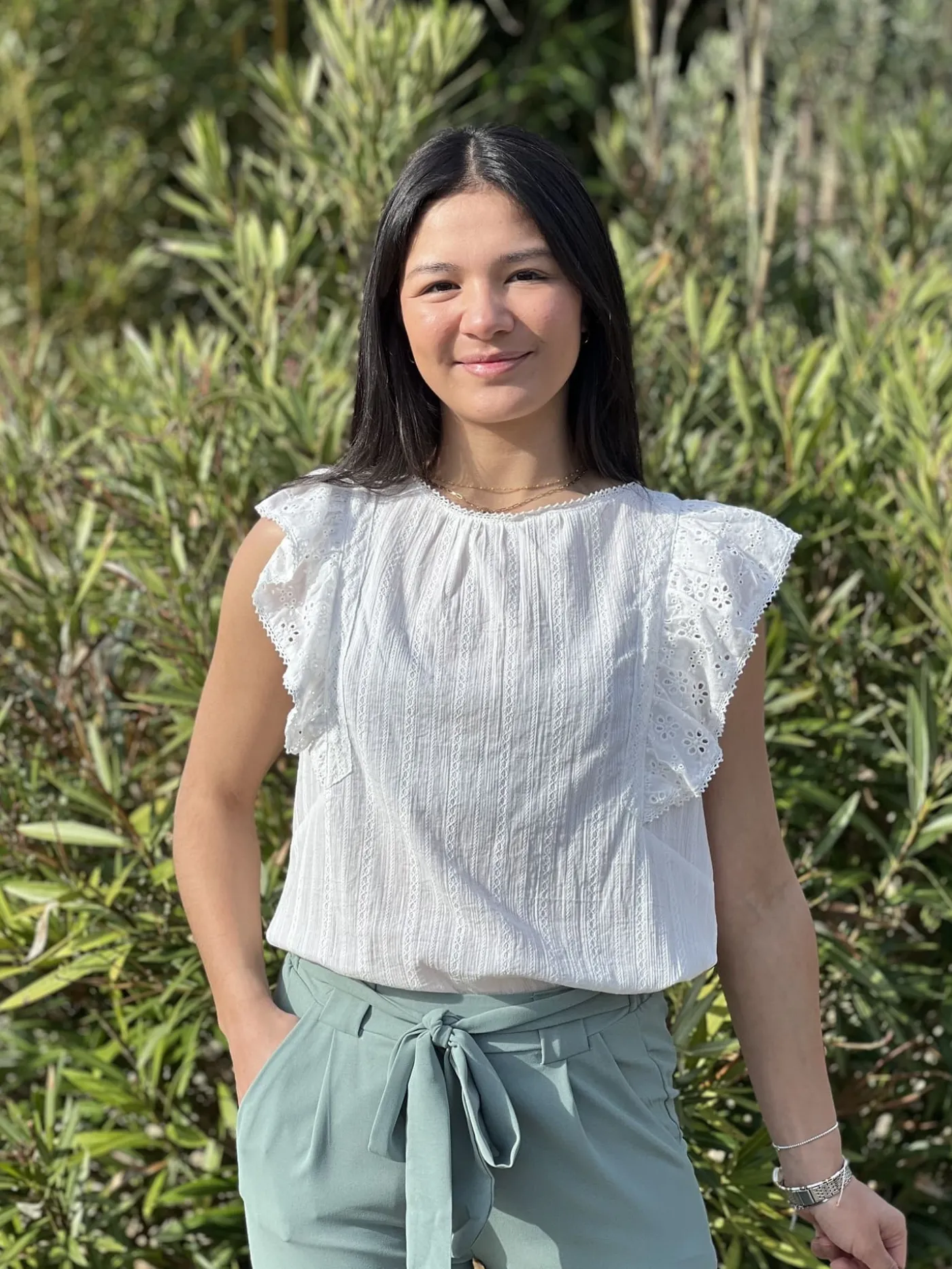TOP A MC COL ROND – VOLANT SUR LES MANCHESTaille : Mathilde mesure 1m65. Elle porte la taille S pour ce modèle.Taille…