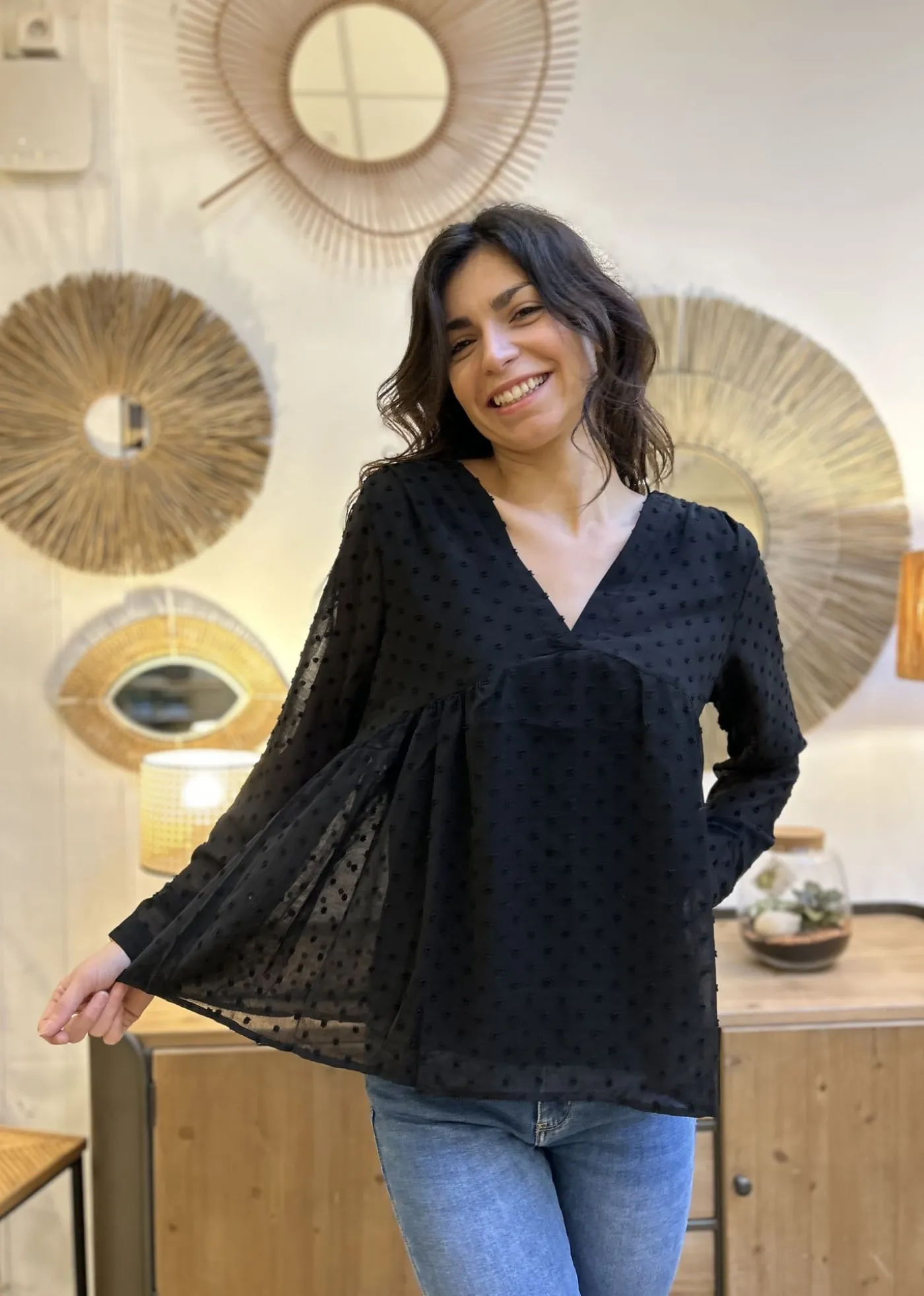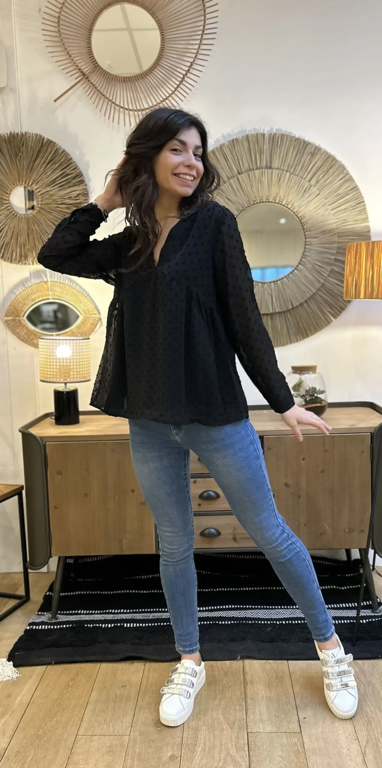 - TOP À ML COL V AVEC POIS PLUMETIS