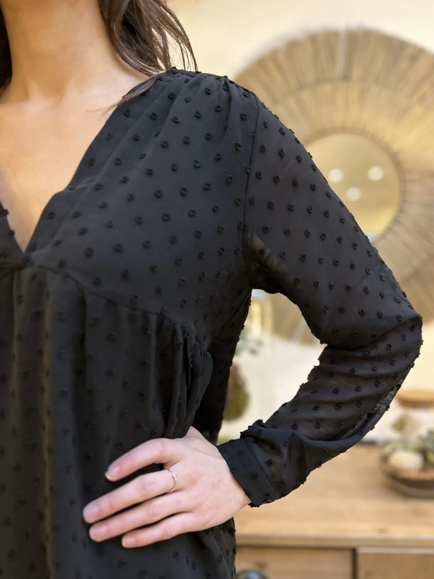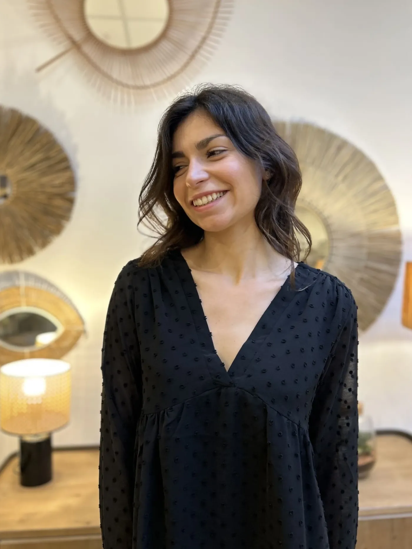 TOP À ML COL V AVEC POIS PLUMETIS Taille : Justine mesure 1m69. Elle porte la taille S/M pour ce modèle. Taille …