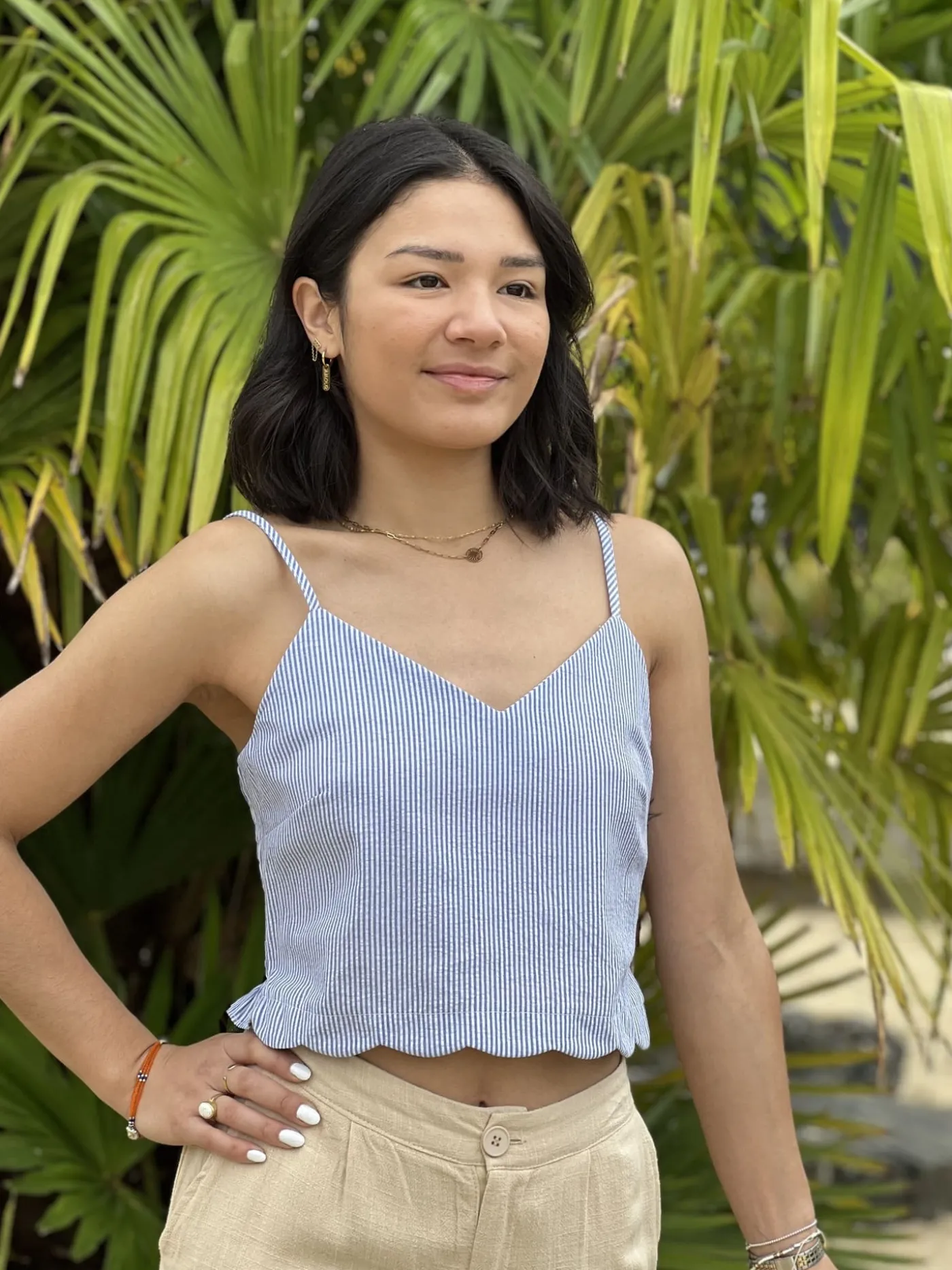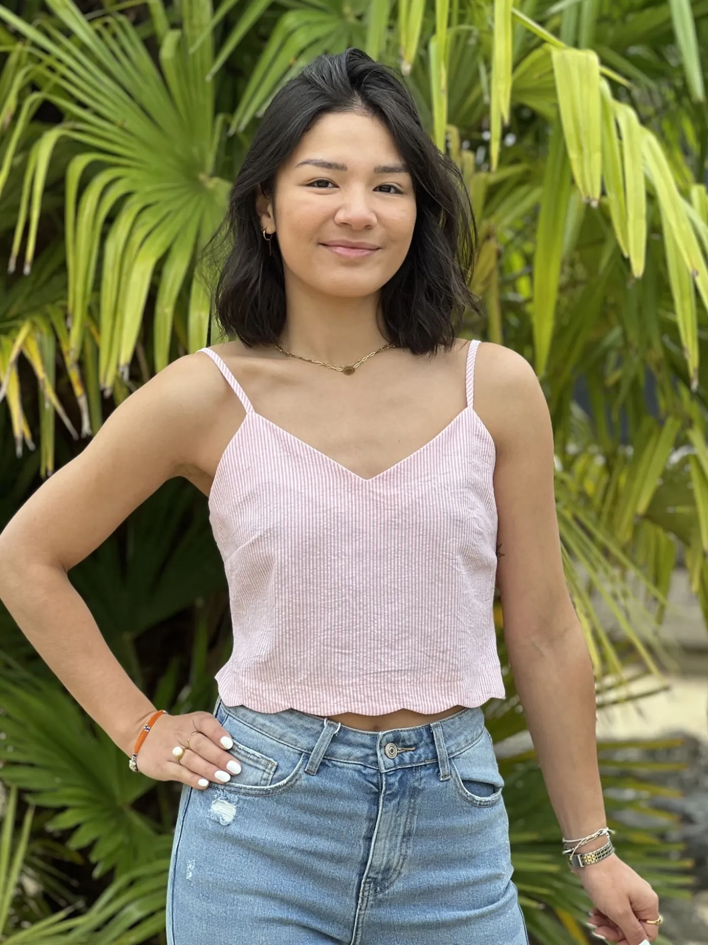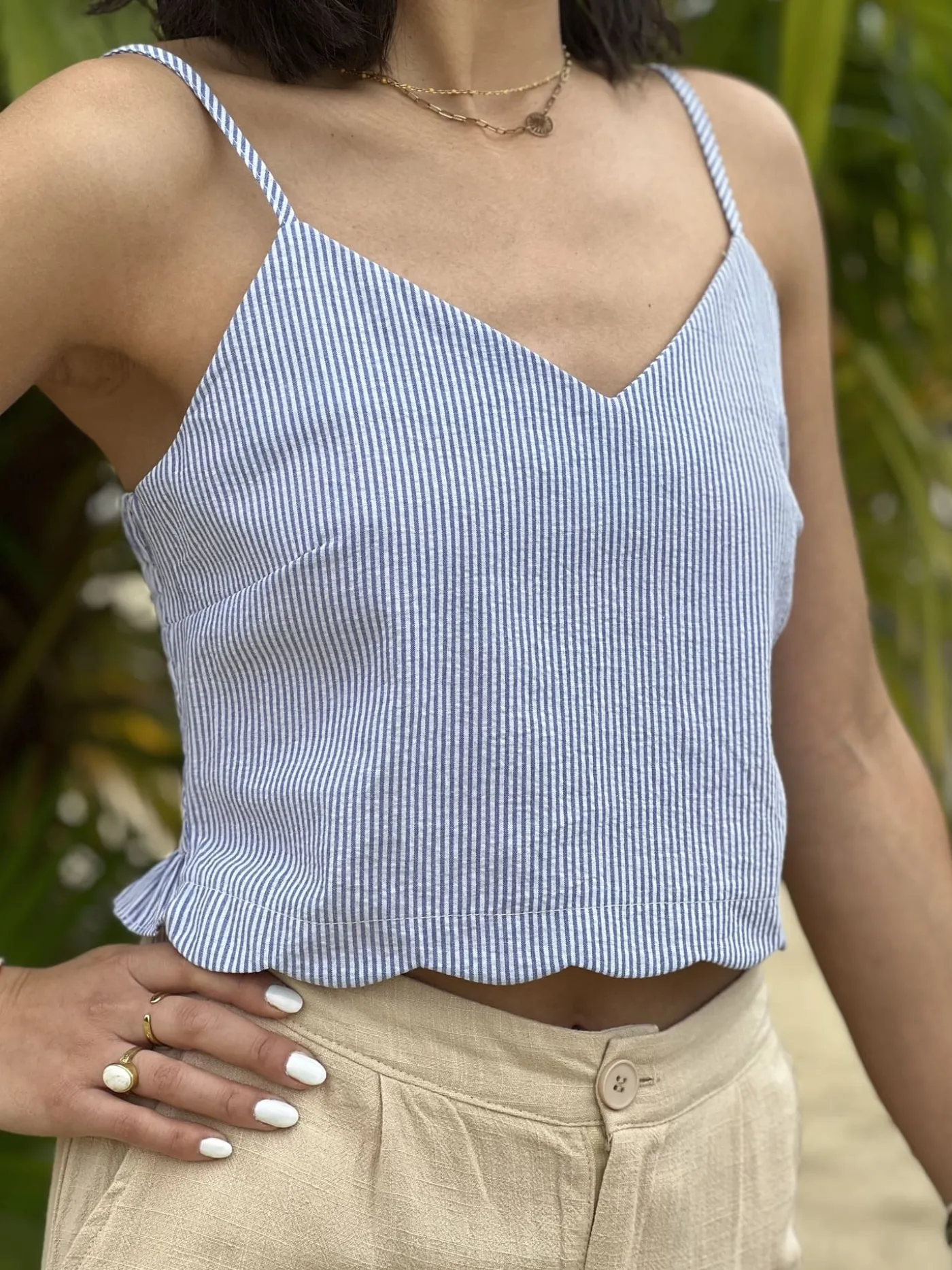 Caraco à fines bretelles col v imprimé rayuresTaille : Mathilde mesure 1m65. Elle porte la taille S/M pour ce modè…