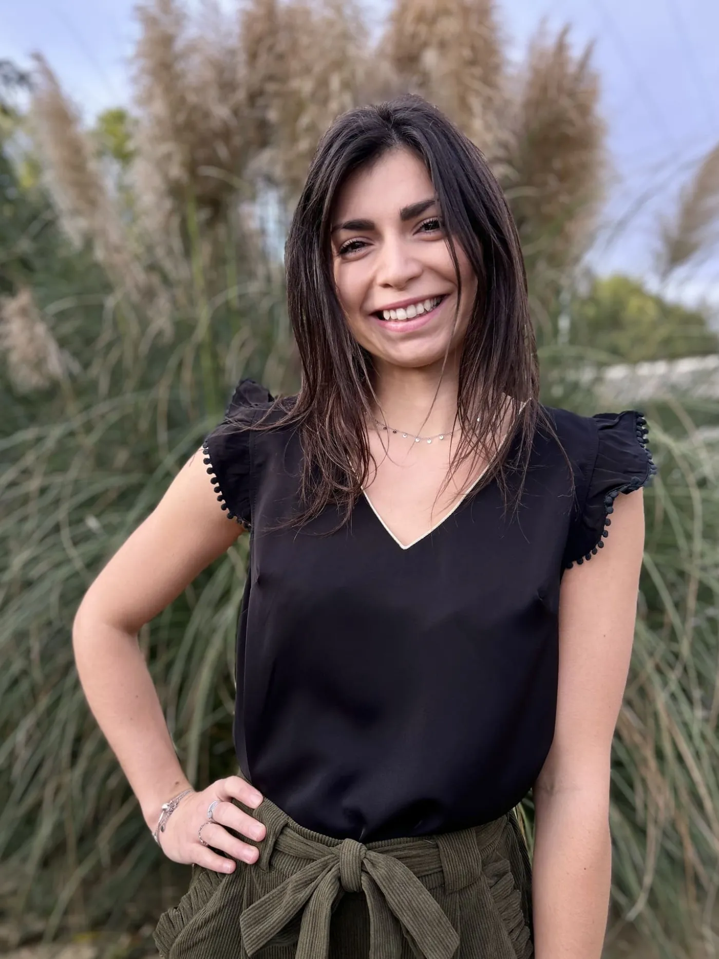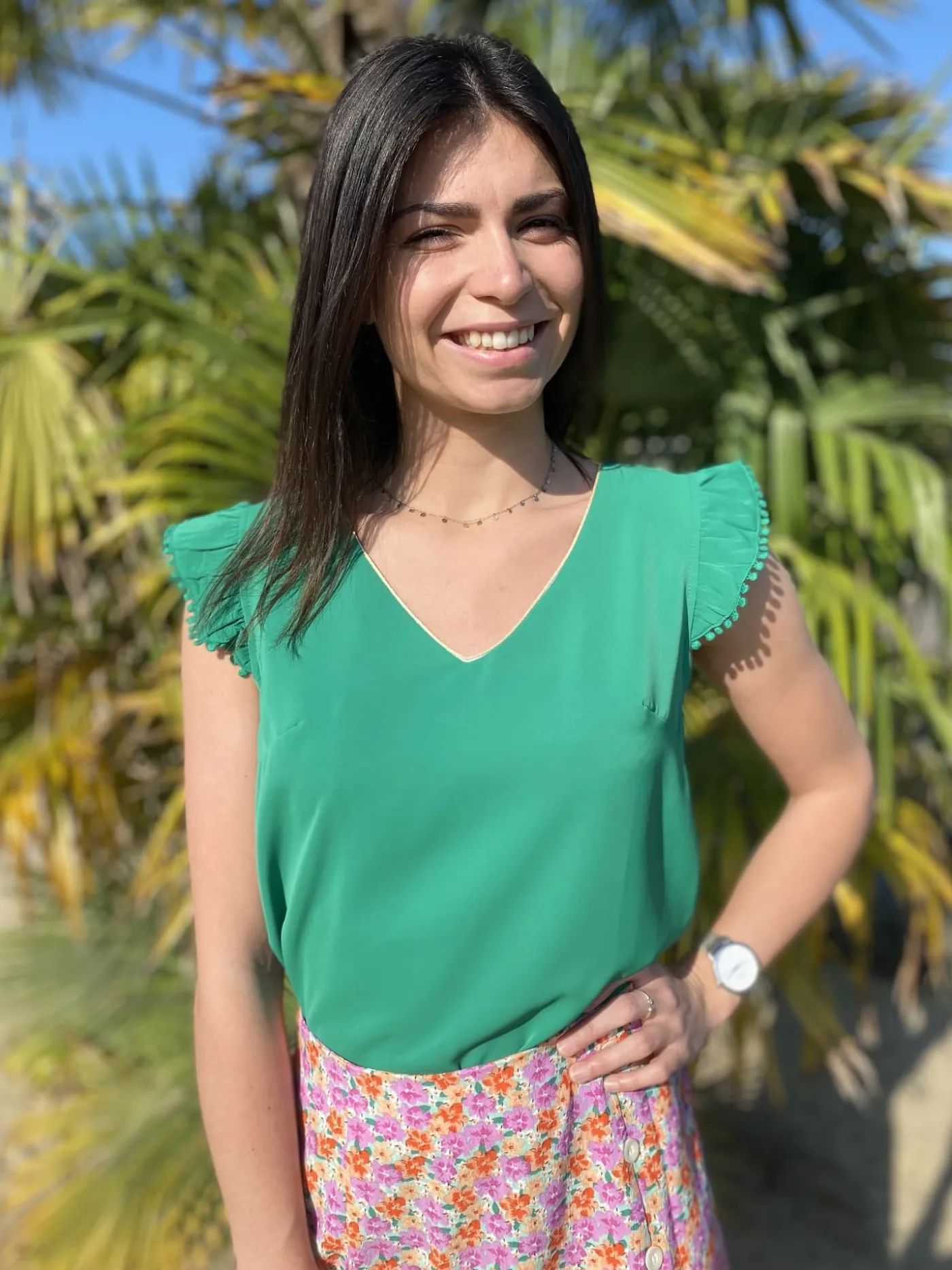TOP COL V DORE MC VOLANTEEJustine mesure 1m69. Elle porte la taille S pour ce modèle. Taille : S (36) / M (38) / L …