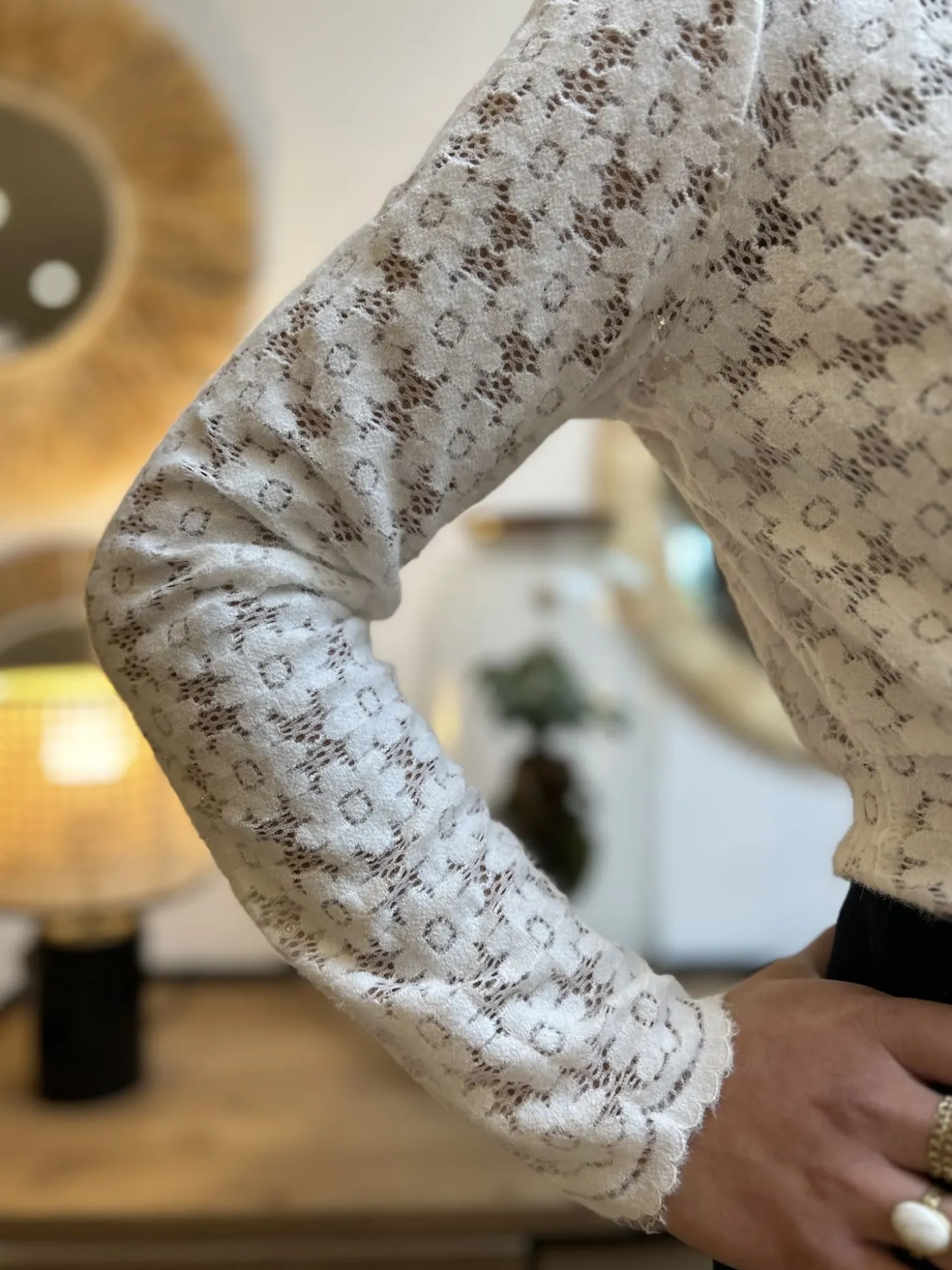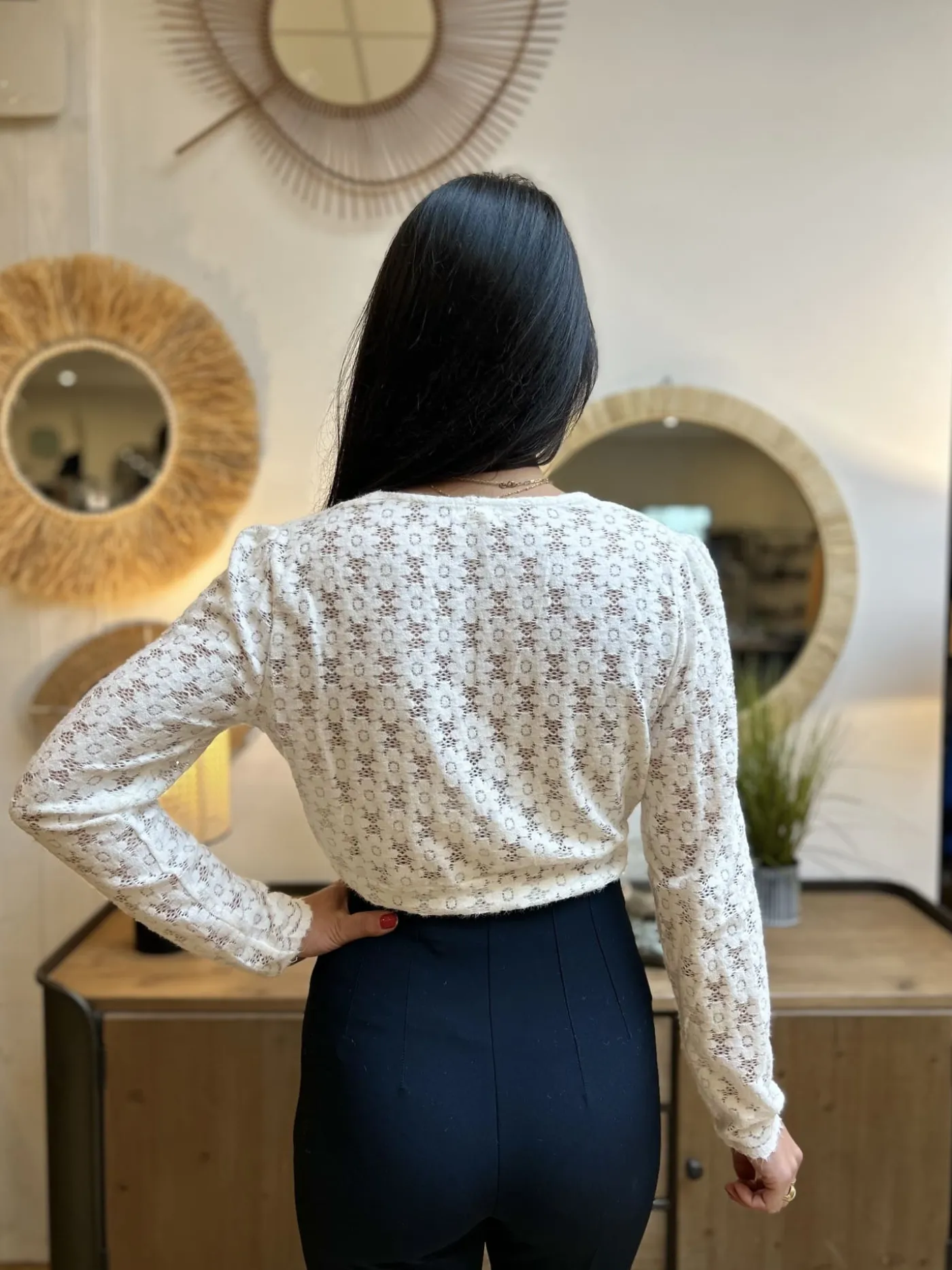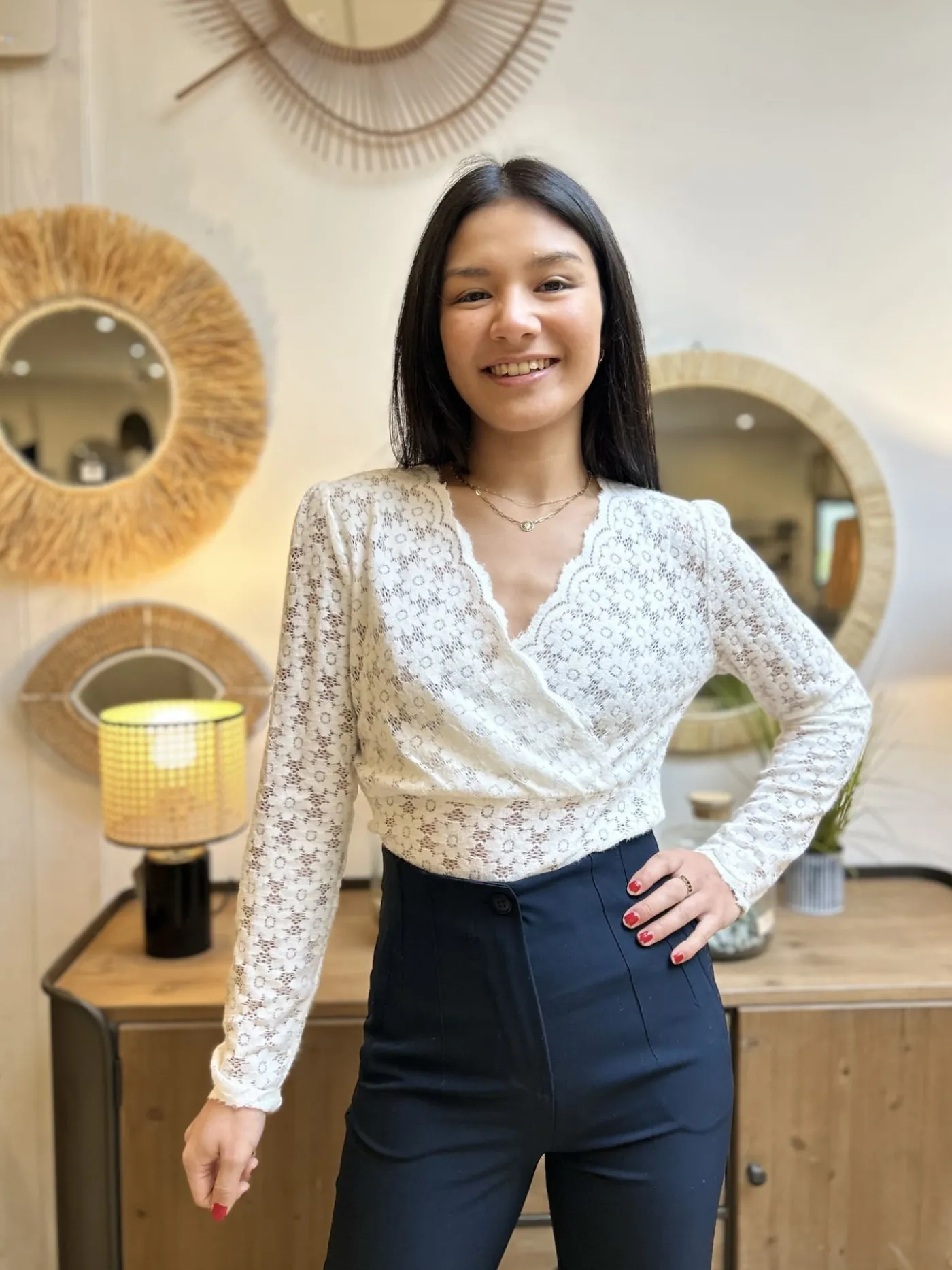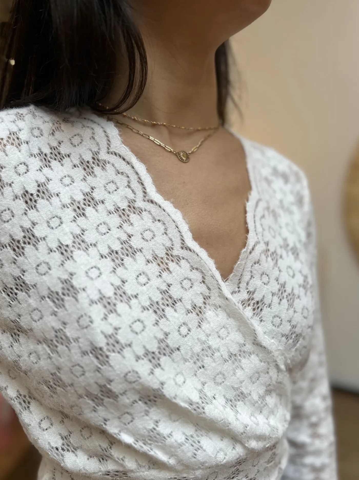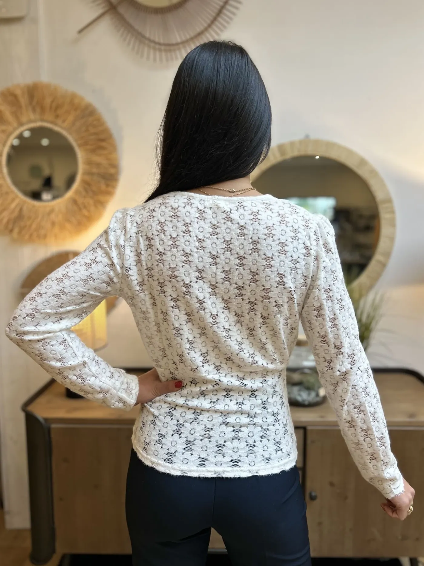 TOP A ML COL V DENTELLE FLEURSTaille : Mathilde mesure 1m65. Elle porte la taille S pour ce modèle. Taille : S (36…