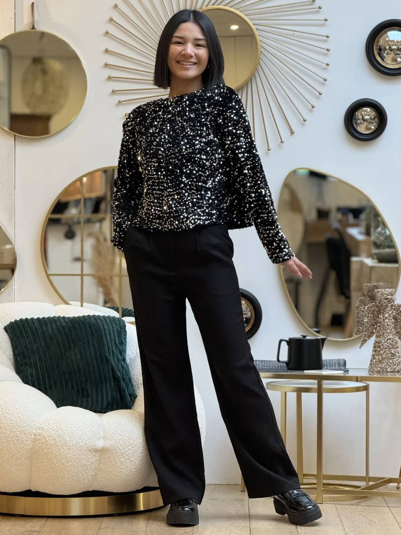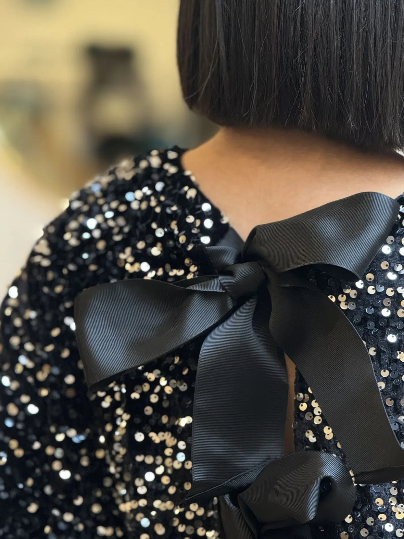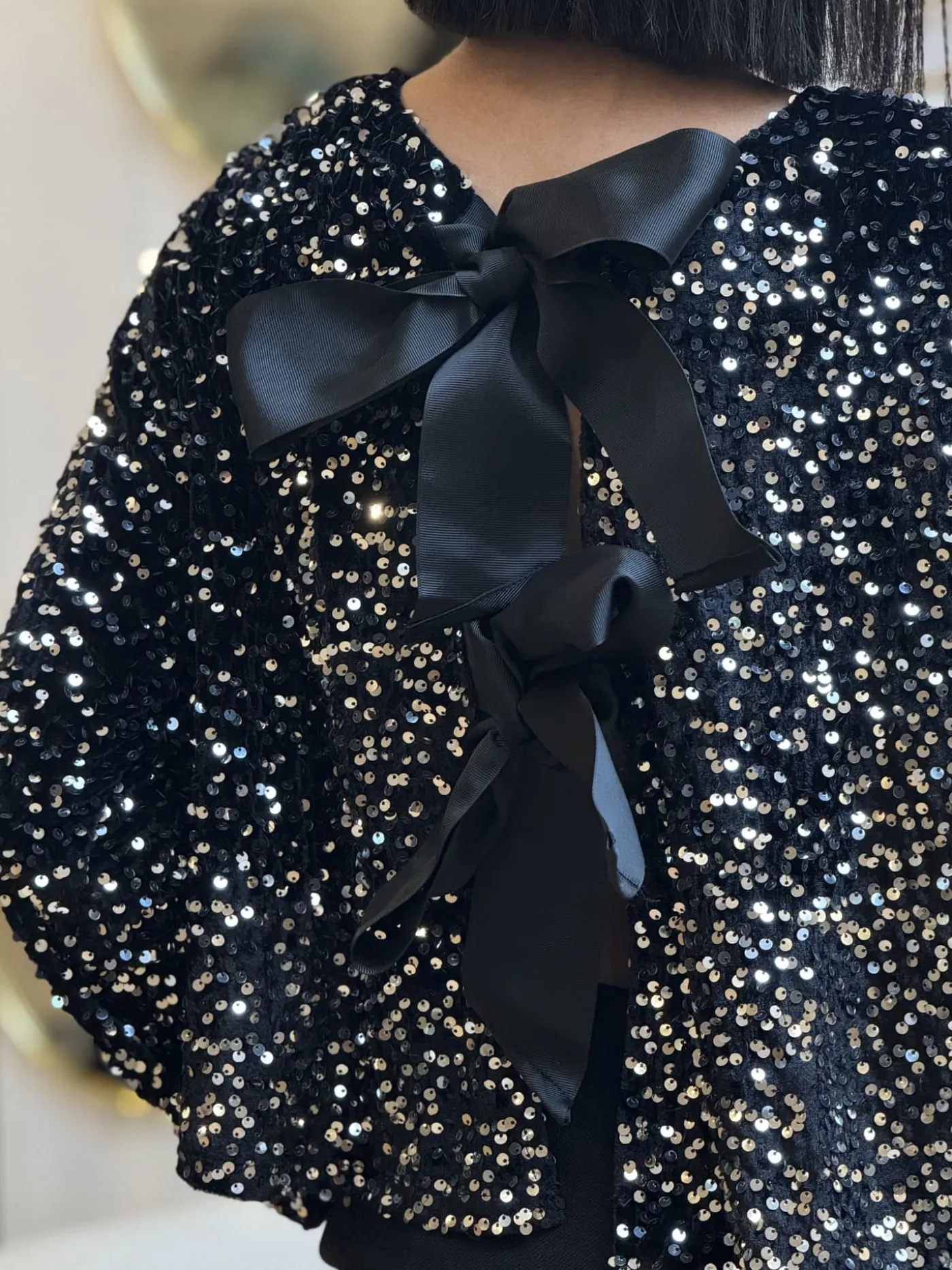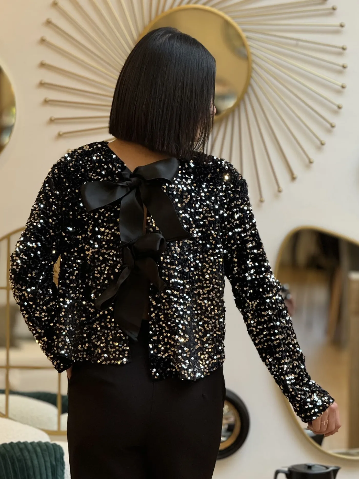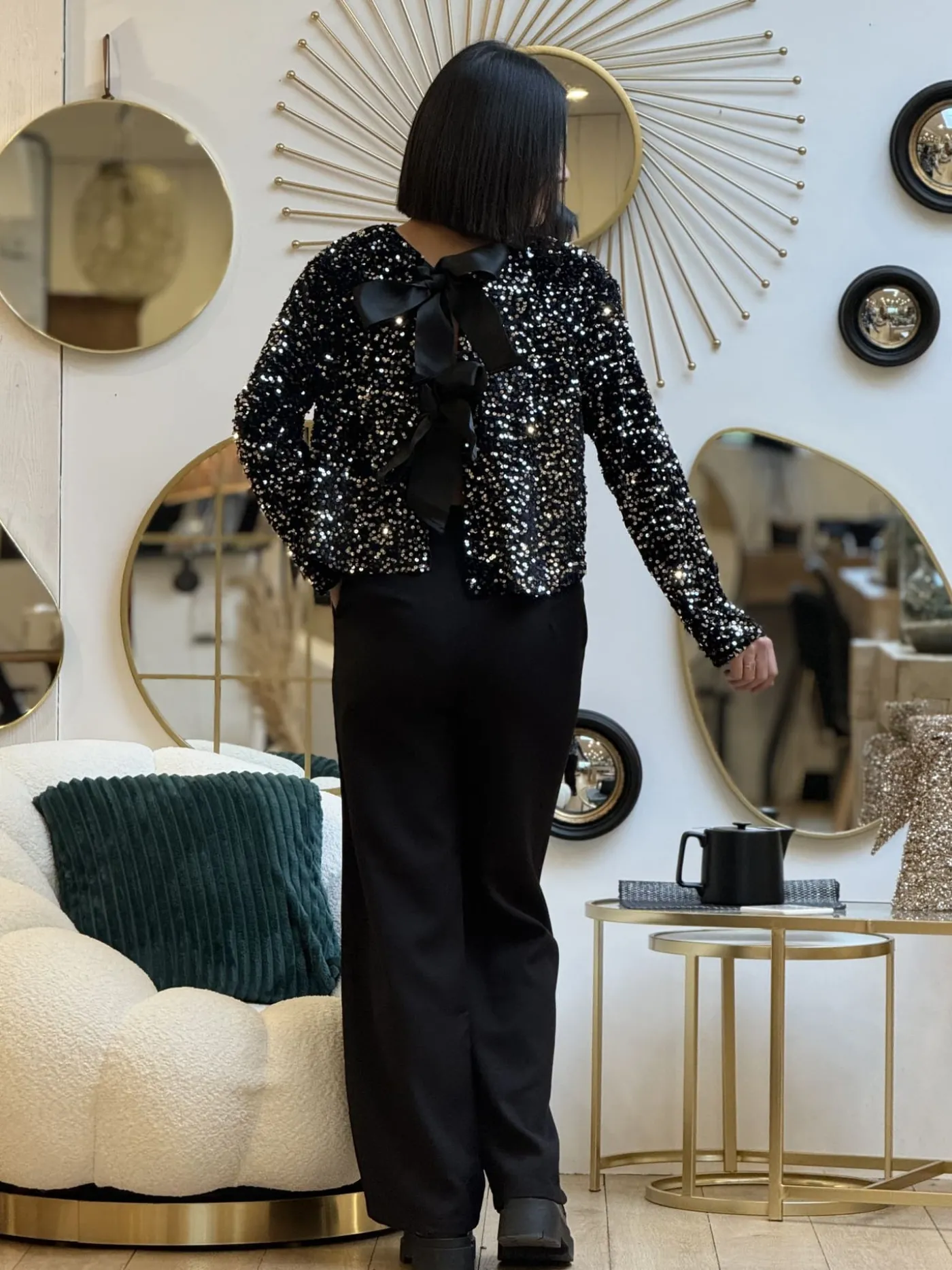 - TOP À ML COL ROND À SEQUINS – GROS NŒUDS AU DOS
