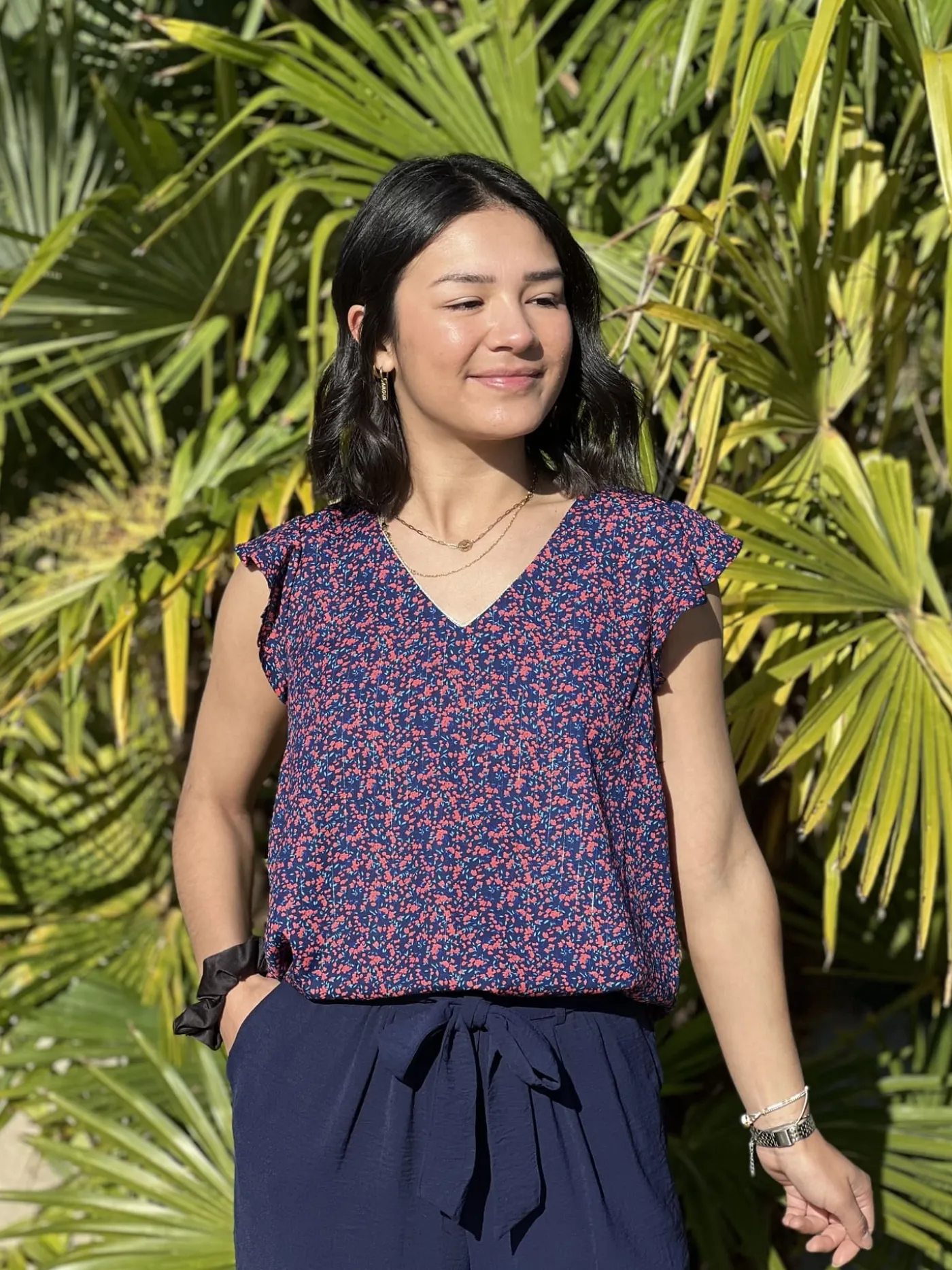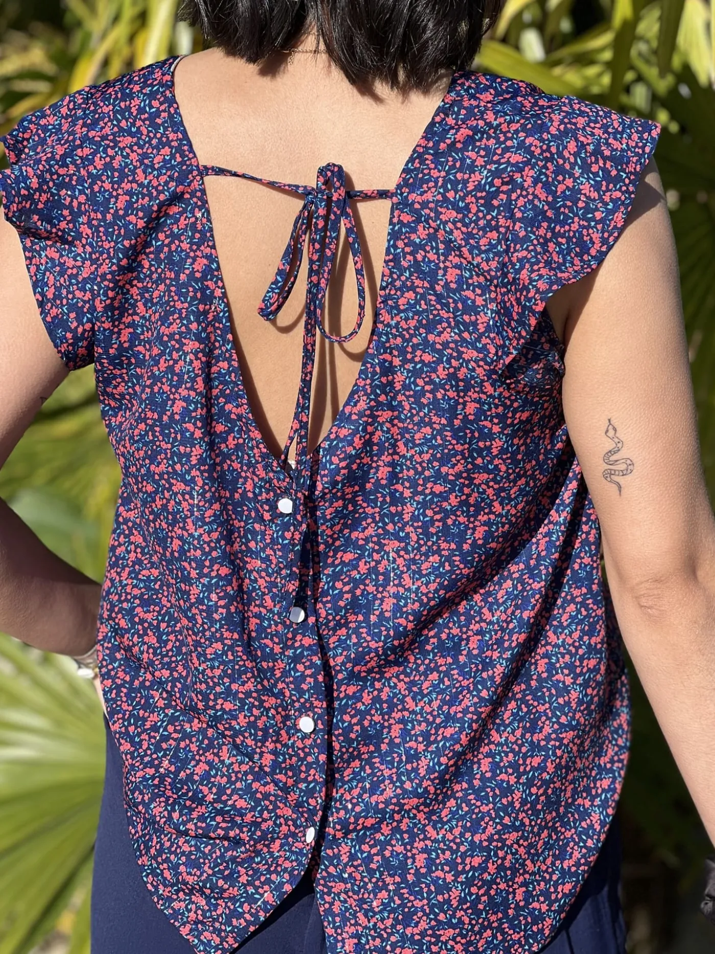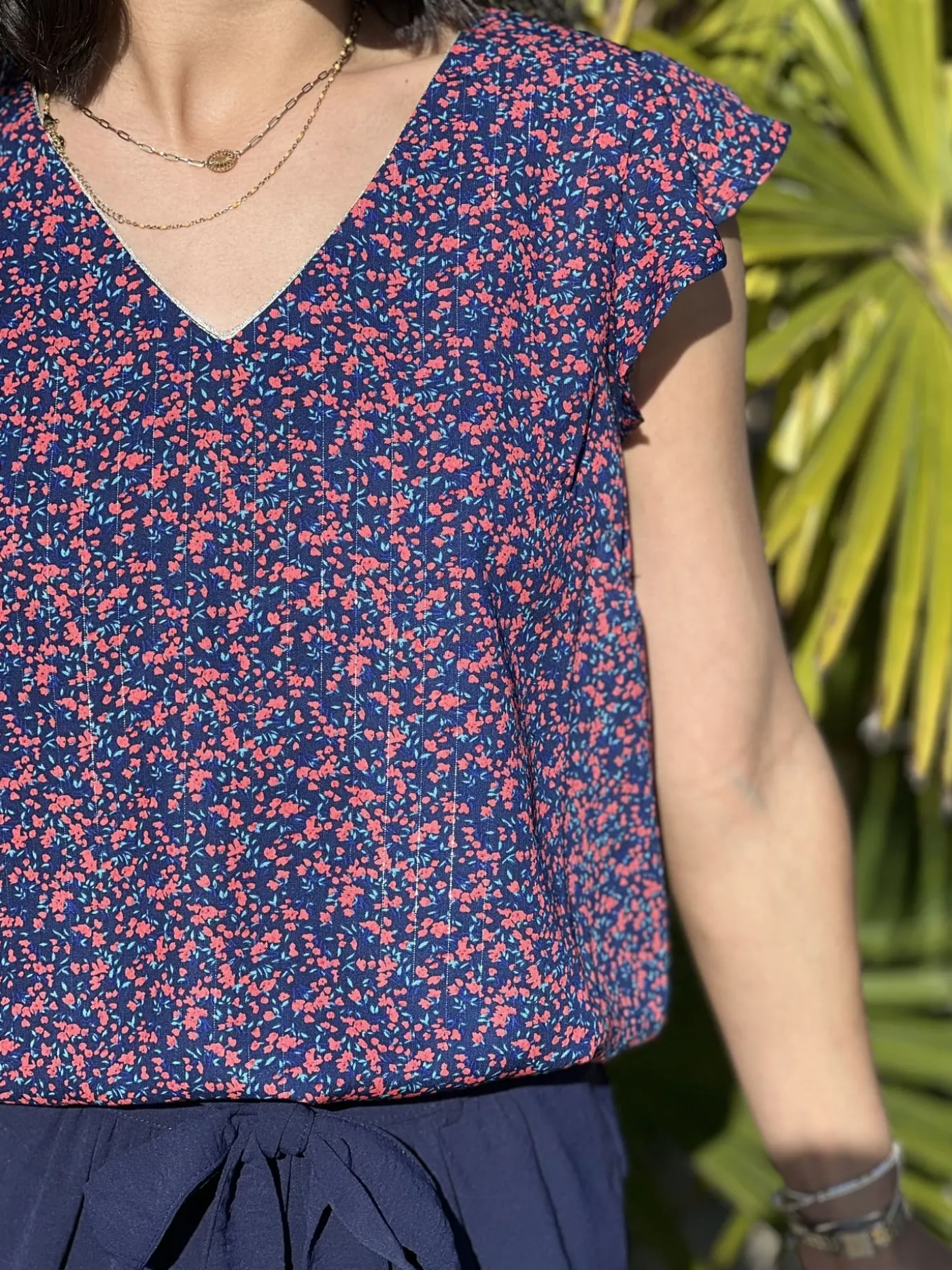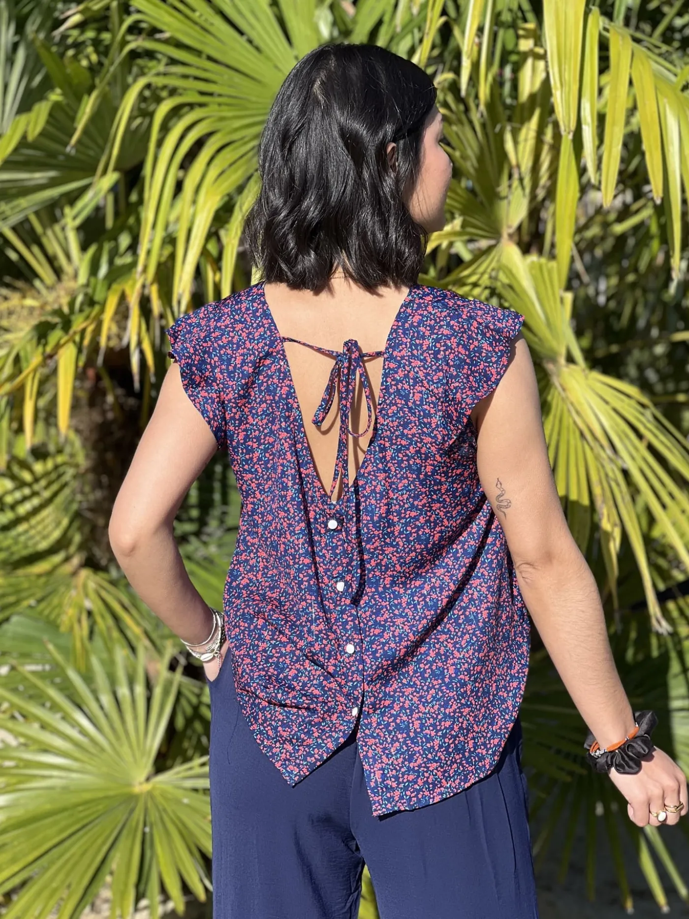 Top mc col v doré lien au dos – motif bleu et rougeTaille : Mathilde mesure 1m65. Elle porte la taille S/M pour ce m…